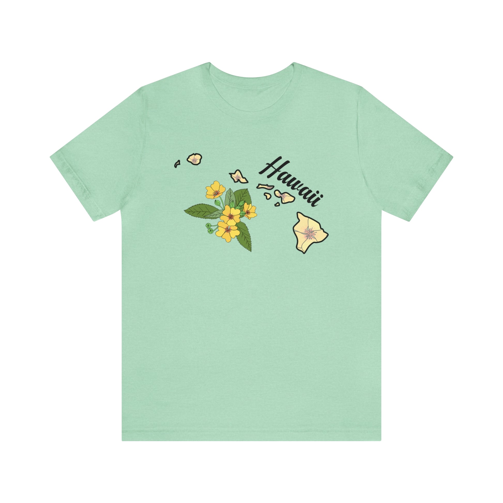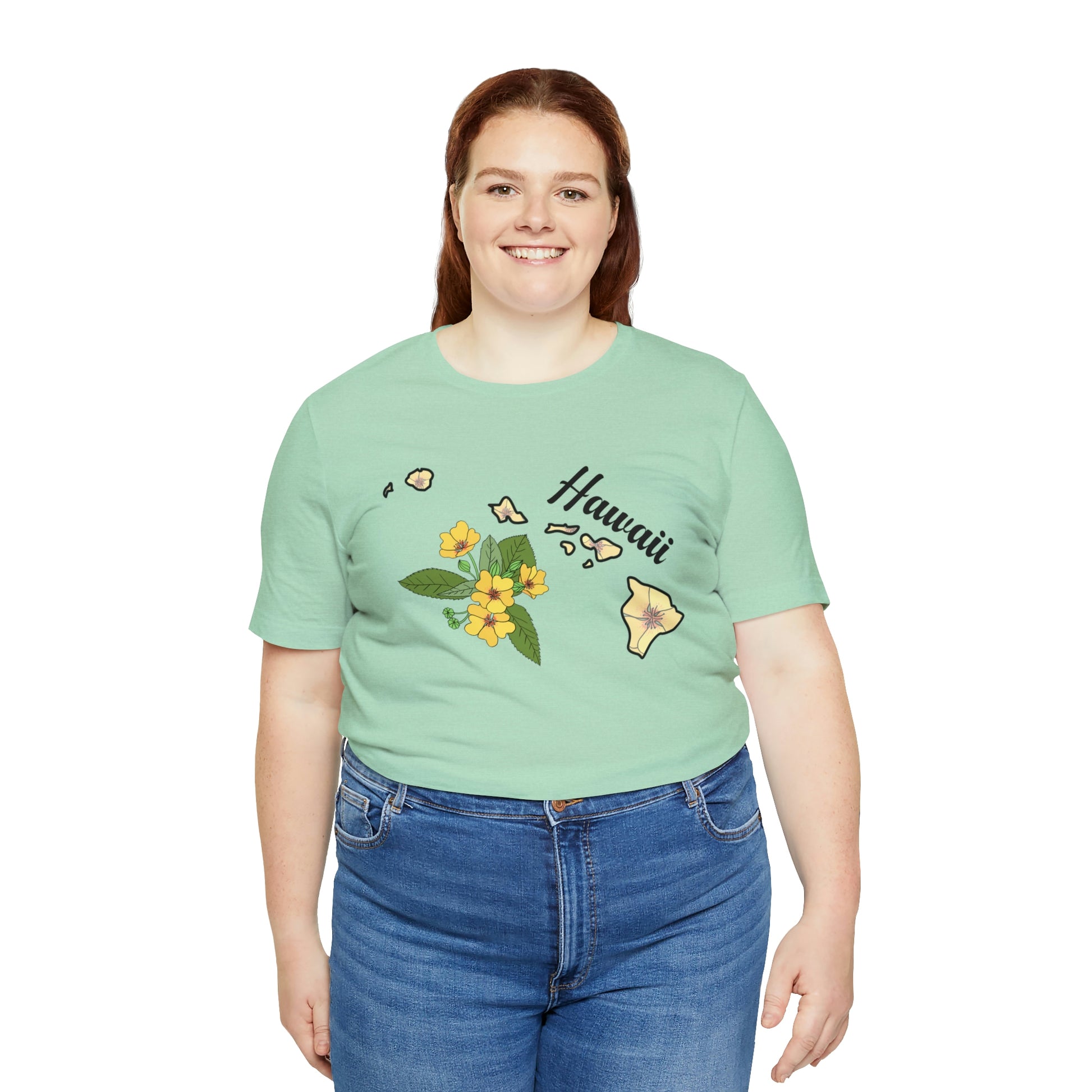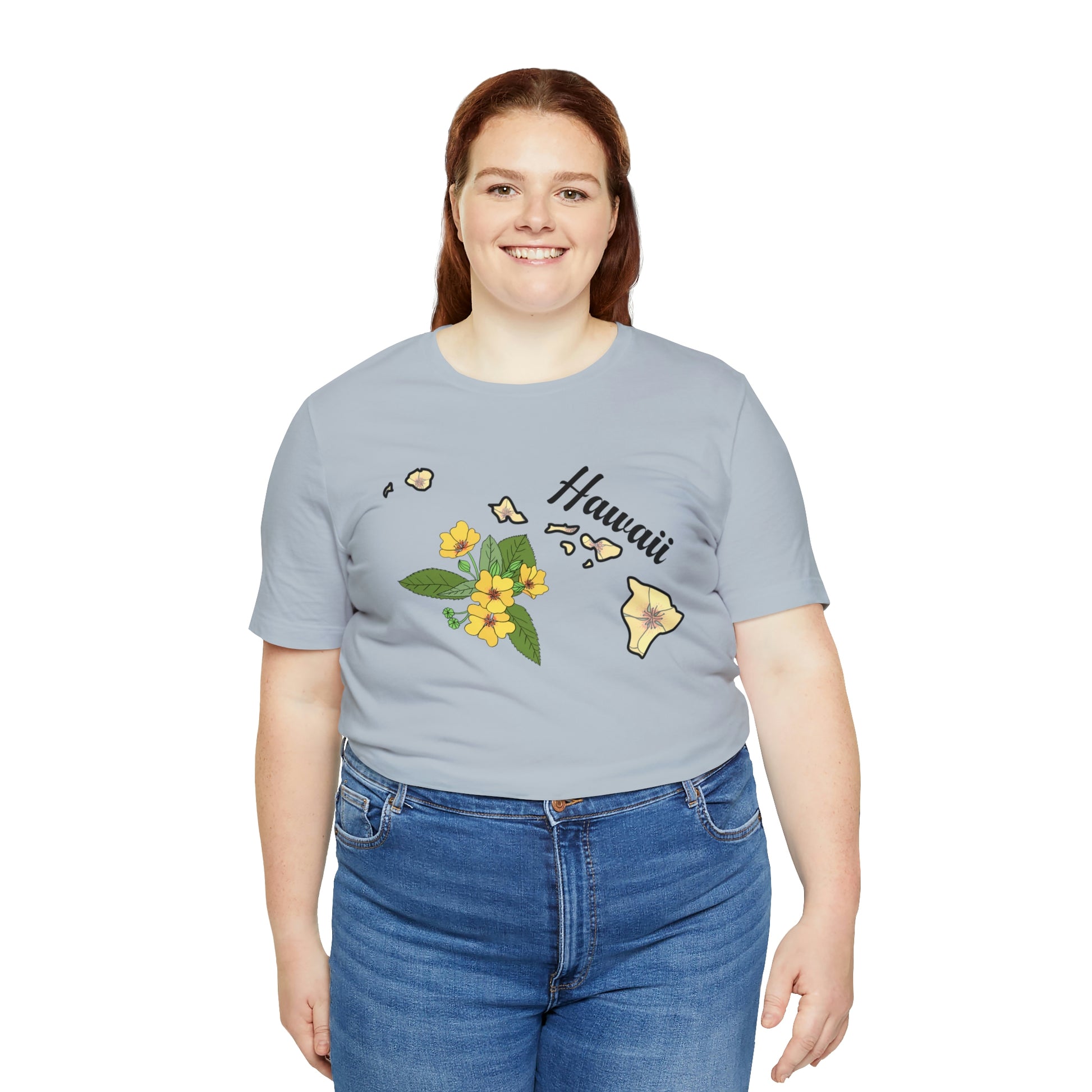 Show off your love and pride in Hawaii with this classic unisex short sleeve t-shirt showing Hawaii with a pua ilima lei flower on it. This tee fits like a well-loved favorite. Soft cotton and quality print make you fall in love with it over and over again. These t-shirts have ribbed knit collars to bolster shaping. The shoulders have taping for better fit over time. Dual side seams hold the garment's shape for longer.