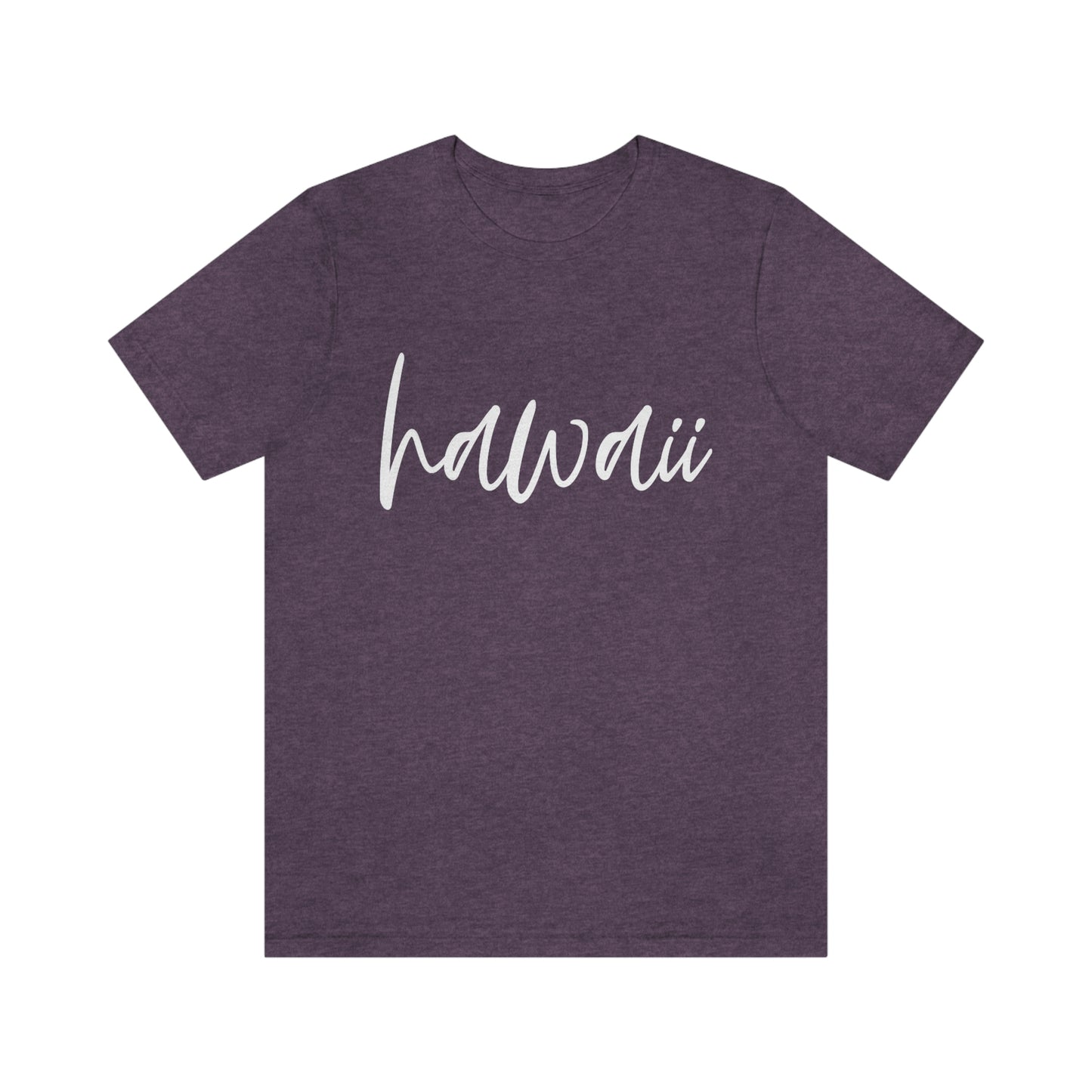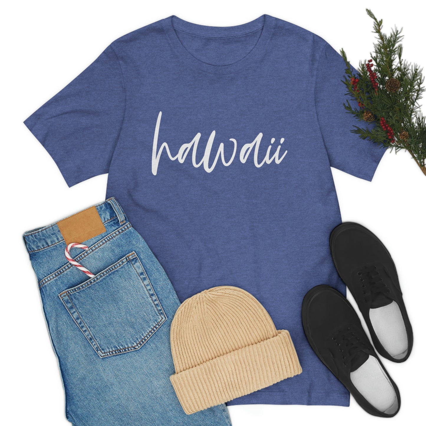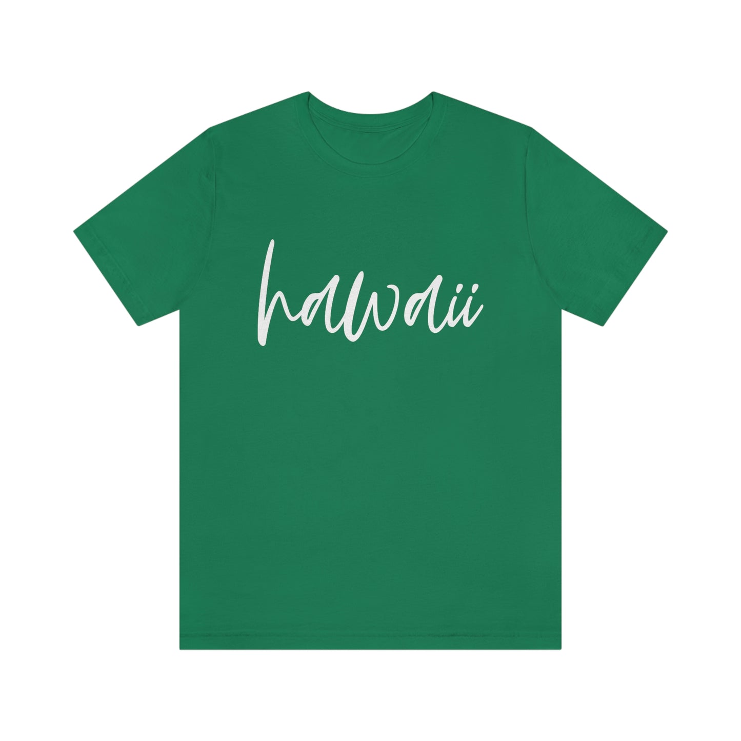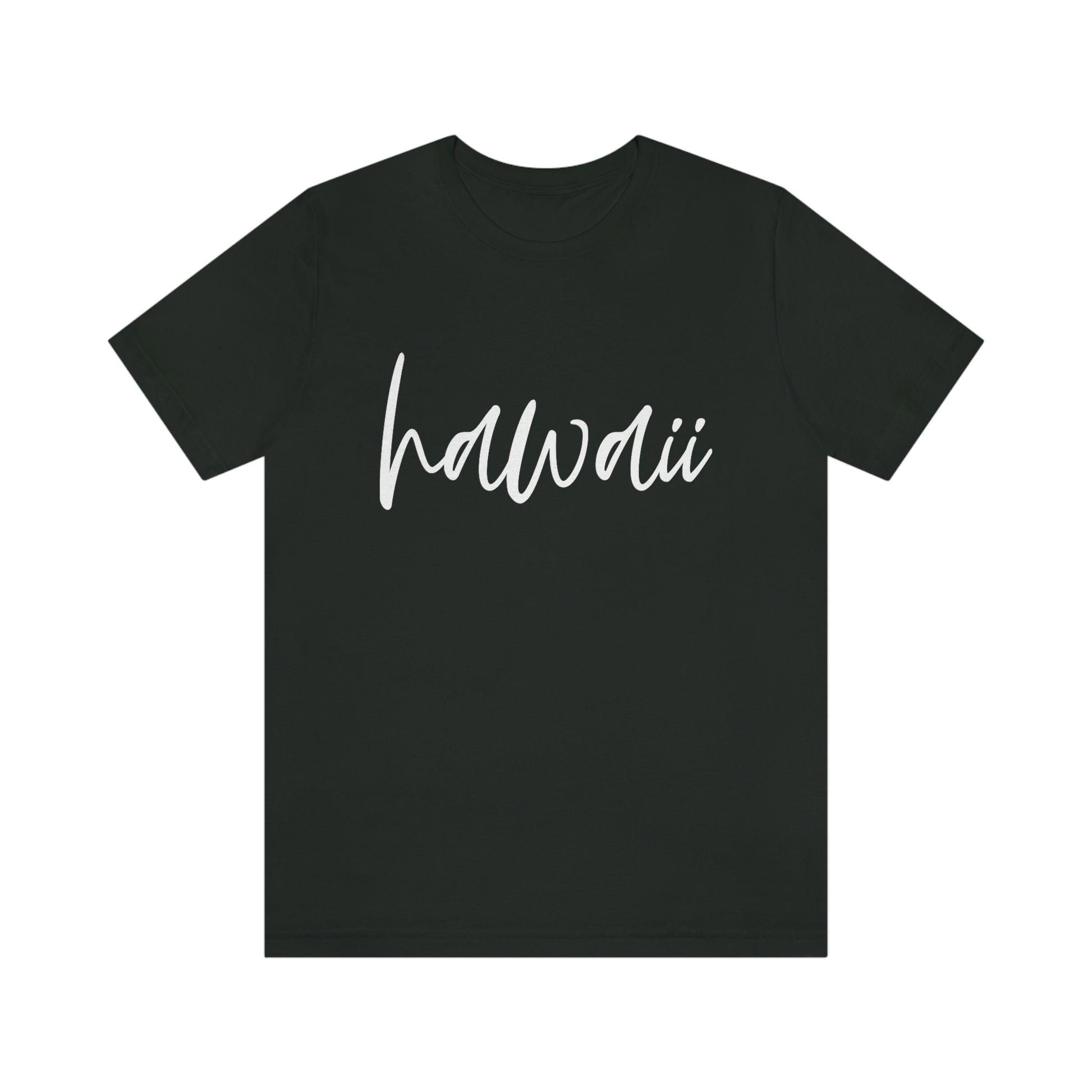 Show off your love and pride in Hawaii with this classic unisex short sleeve t-shirt showing Hawaii written in white script. This tee fits like a well-loved favorite. Soft cotton and quality print make you fall in love with it over and over again. These t-shirts have ribbed knit collars to bolster shaping. The shoulders have taping for better fit over time. Dual side seams hold the garment's shape for longer.