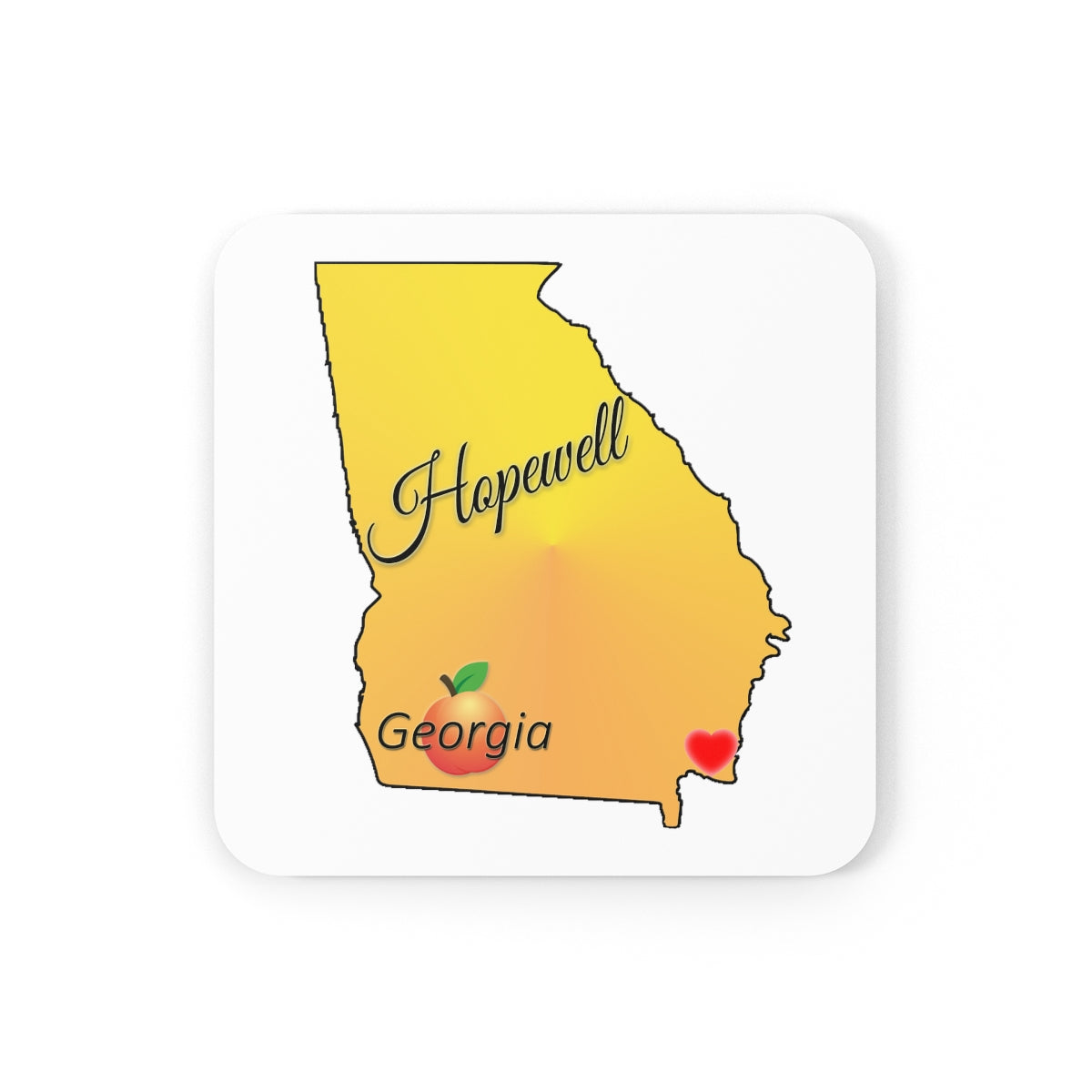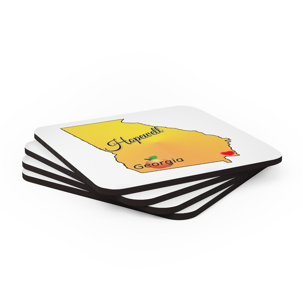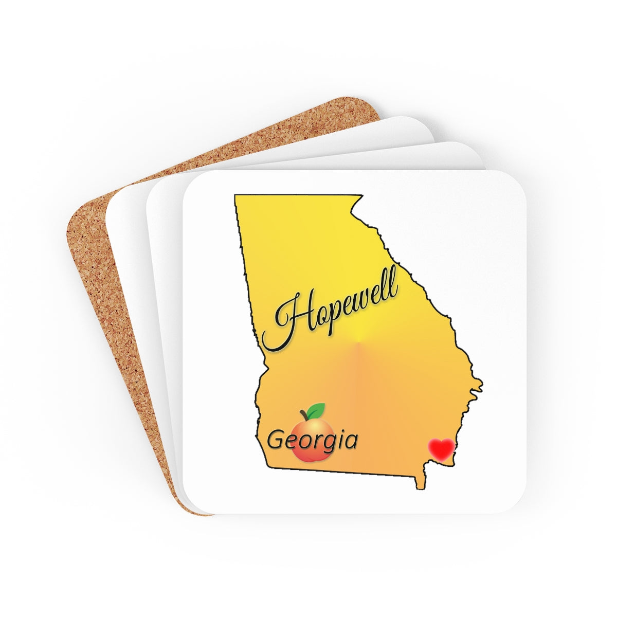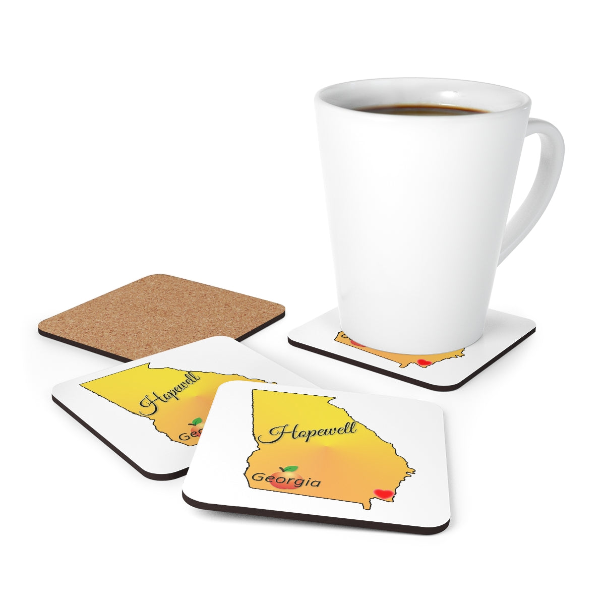 This coaster set comes with 4 coasters in one size. They are made with a high-gloss top and feature a cork back to prevent sliding.