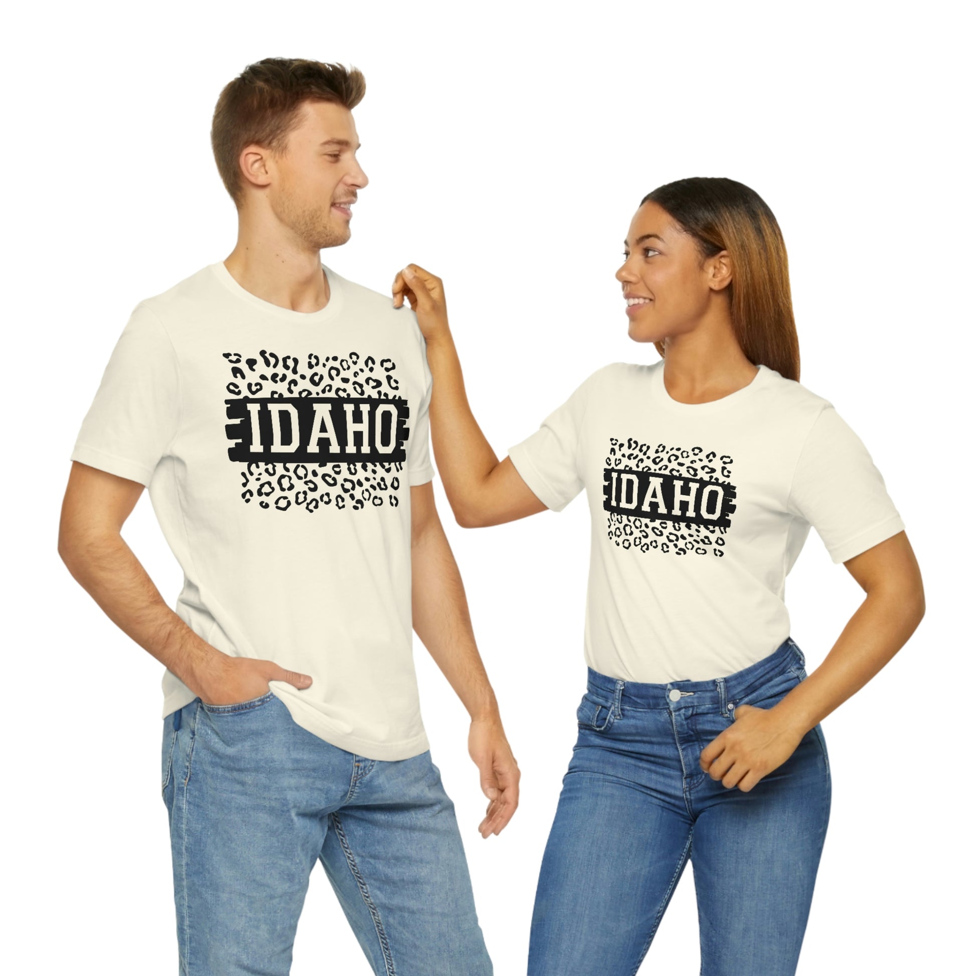 Show off your love and pride in Idaho with this classic unisex short sleeve t-shirt showing Idaho written across a leopard print background. This tee fits like a well-loved favorite. Soft cotton and quality print make you fall in love with it over and over again. These t-shirts have ribbed knit collars to bolster shaping. The shoulders have taping for better fit over time. Dual side seams hold the garment's shape for longer.