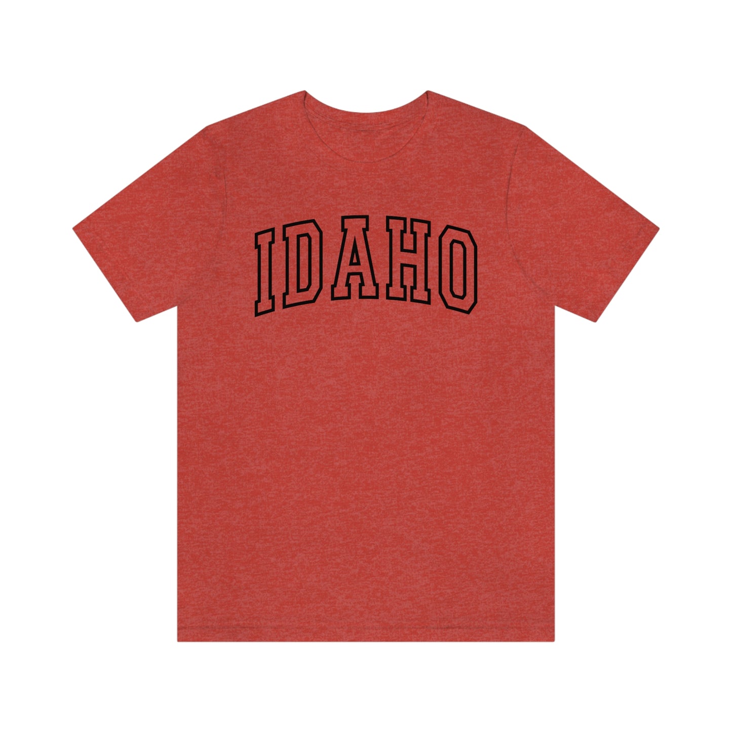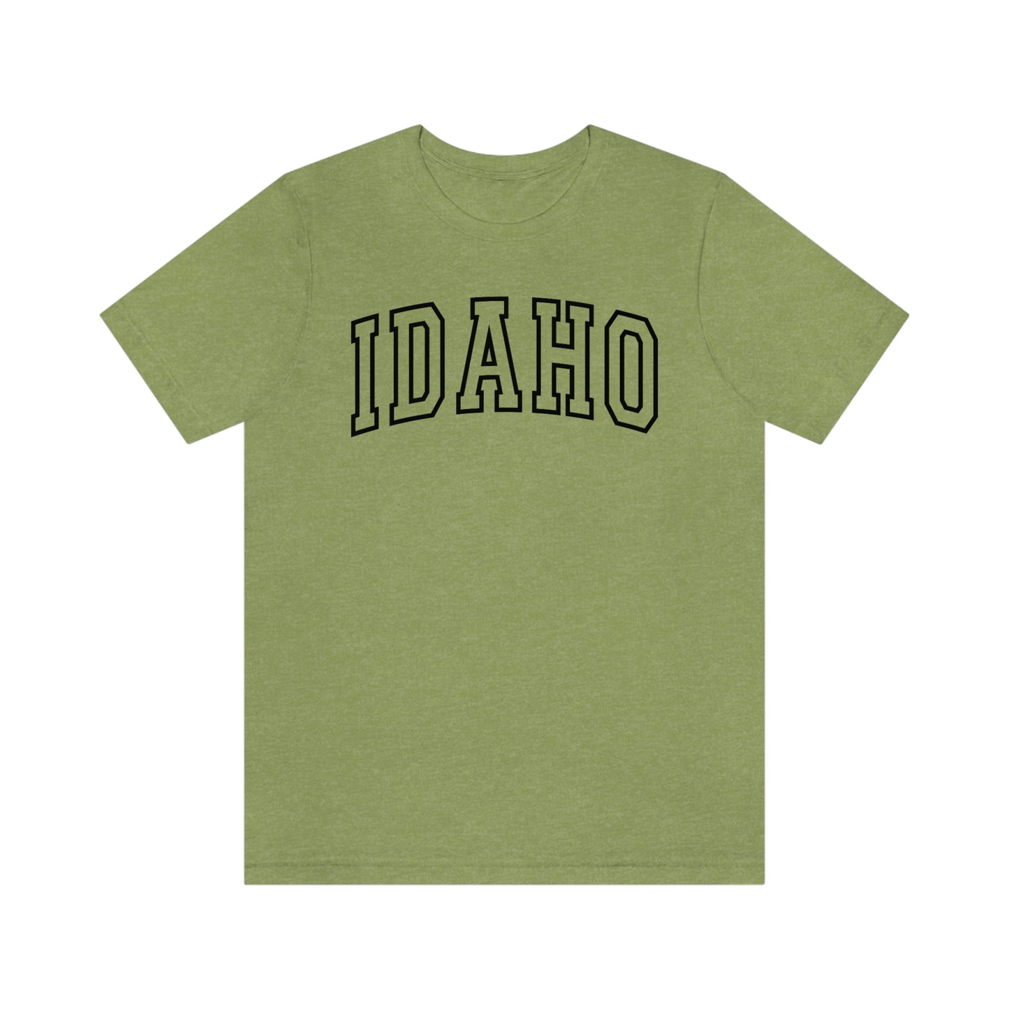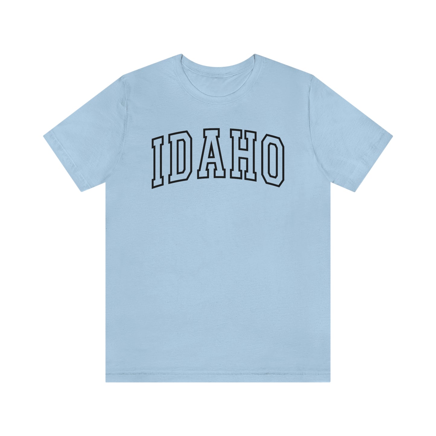 Show off your love and pride in Idaho with this classic unisex short sleeve t-shirt showing Idaho written in varsity letters in an arch design. This tee fits like a well-loved favorite. Soft cotton and quality print make you fall in love with it over and over again. These t-shirts have ribbed knit collars to bolster shaping. The shoulders have taping for better fit over time. Dual side seams hold the garment's shape for longer.