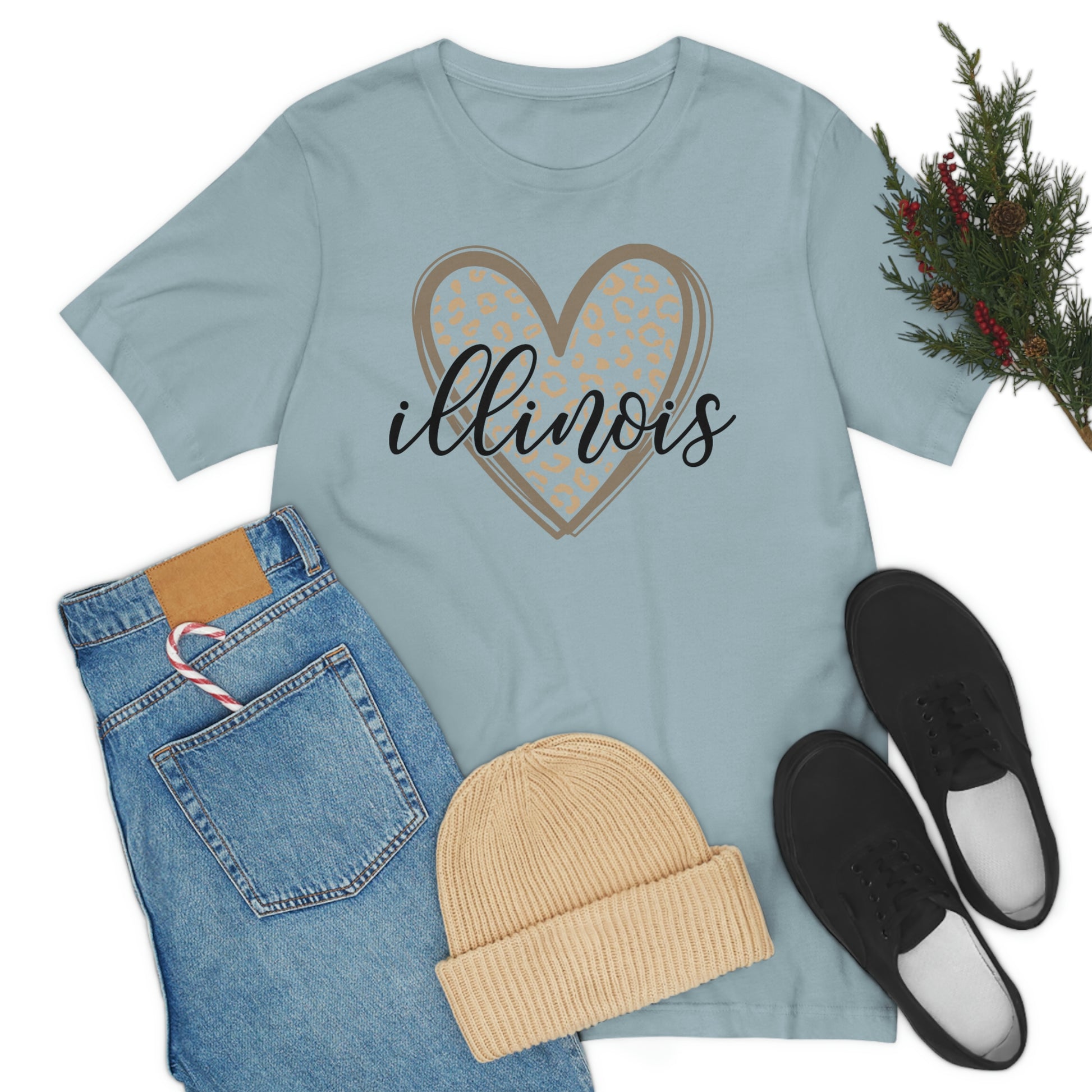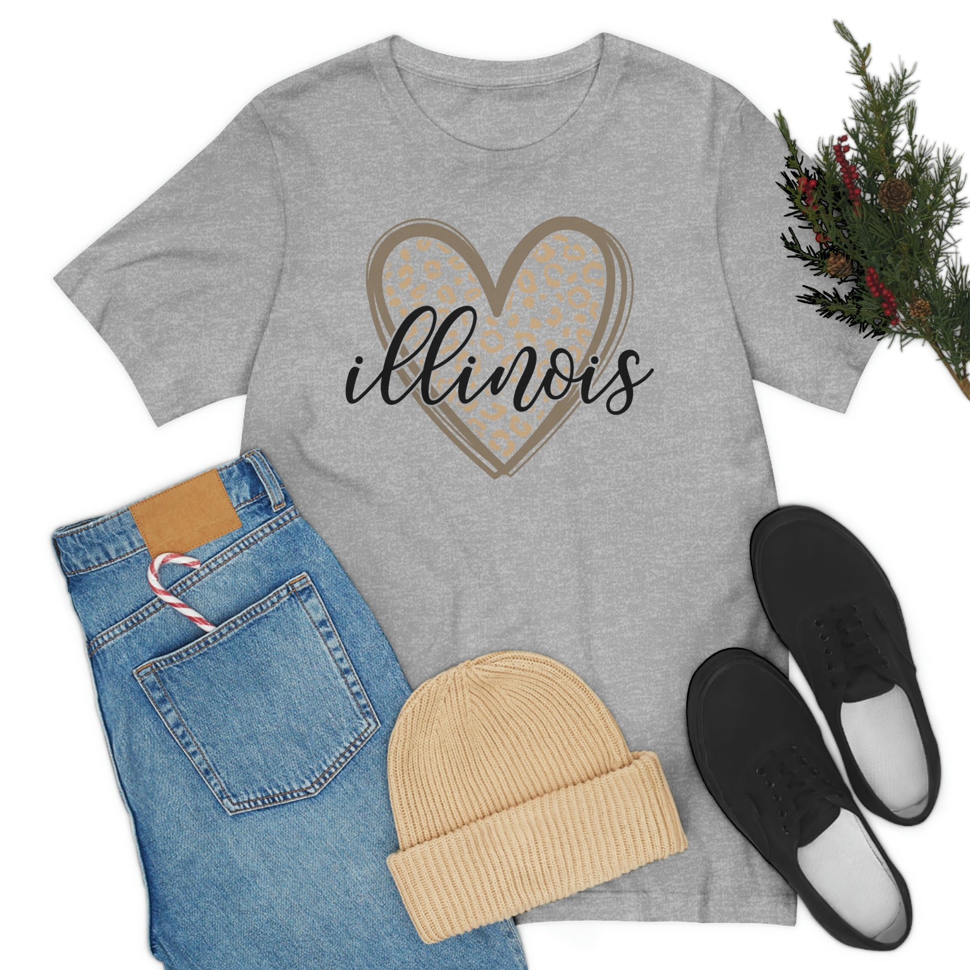 Show off your love and pride in Illinois with this classic unisex short sleeve t-shirt showing Illinois written in white script over a gold leopard print heart. This tee fits like a well-loved favorite. Soft cotton and quality print make you fall in love with it over and over again. These t-shirts have ribbed knit collars to bolster shaping. The shoulders have taping for better fit over time. Dual side seams hold the garment's shape for longer.
