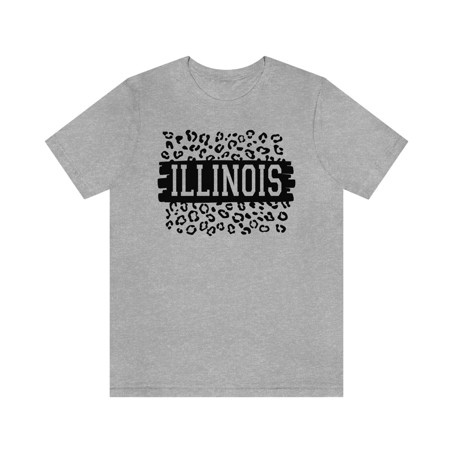 Show off your love and pride in Illinois with this classic unisex short sleeve t-shirt showing Illinois written on a black band over a leopard print background. This tee fits like a well-loved favorite. Soft cotton and quality print make you fall in love with it over and over again. These t-shirts have ribbed knit collars to bolster shaping. The shoulders have taping for better fit over time. Dual side seams hold the garment's shape for longer.