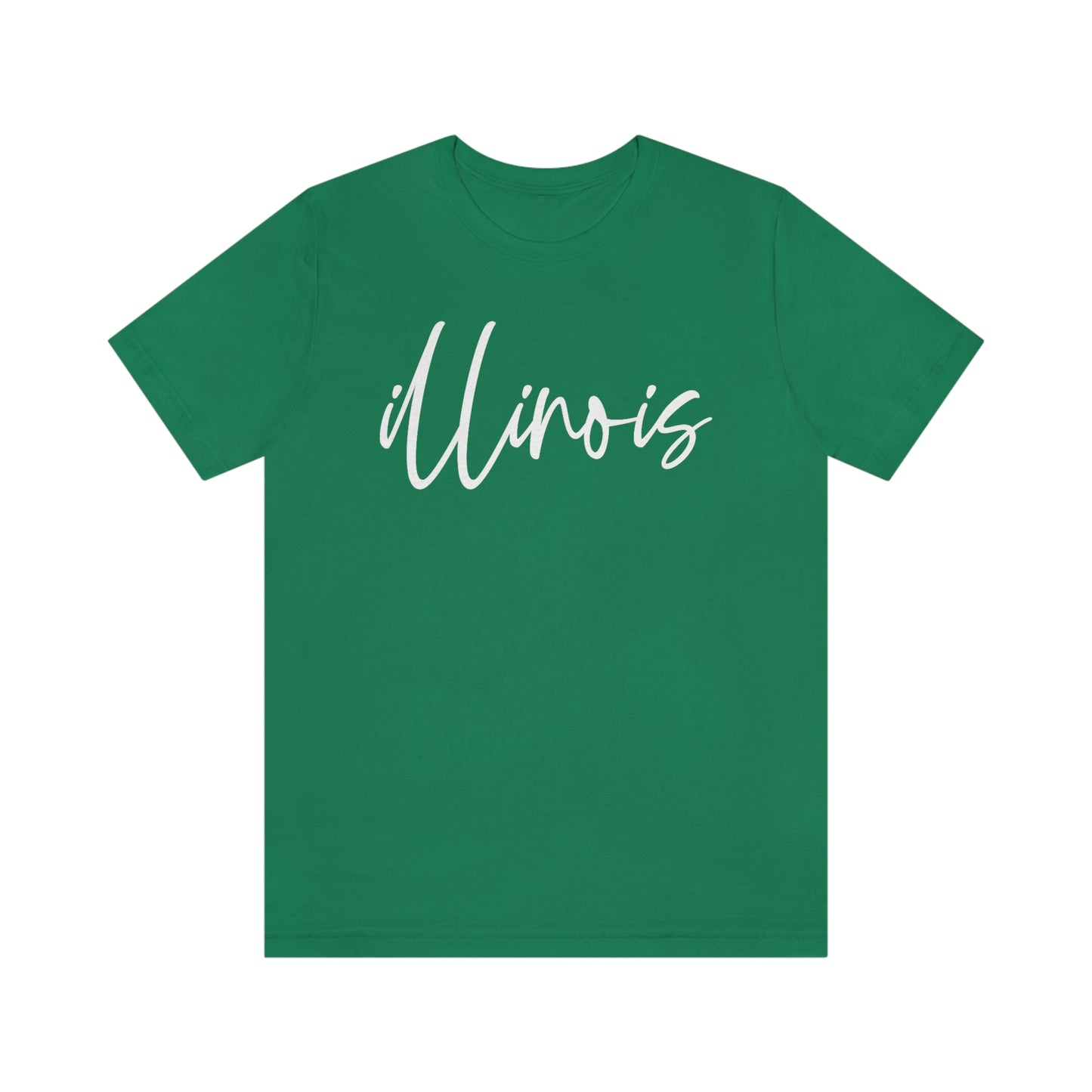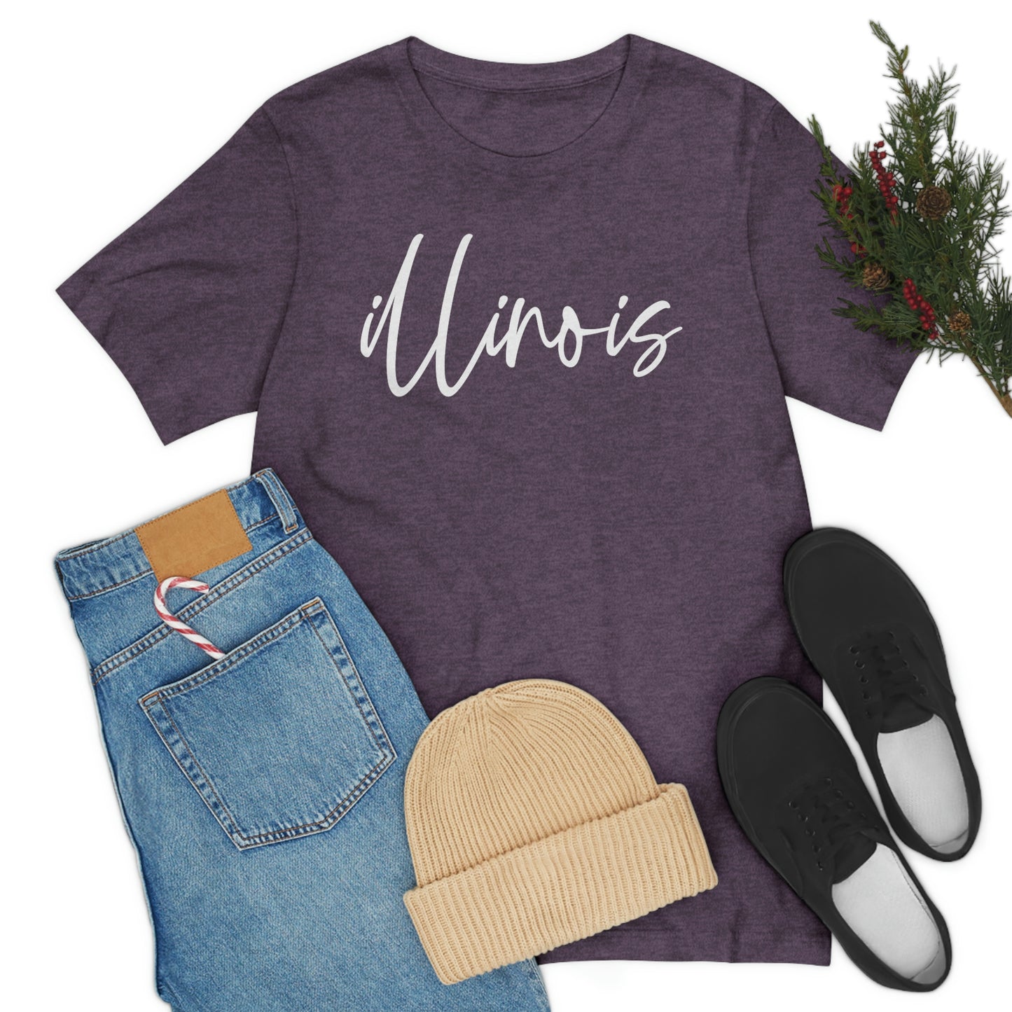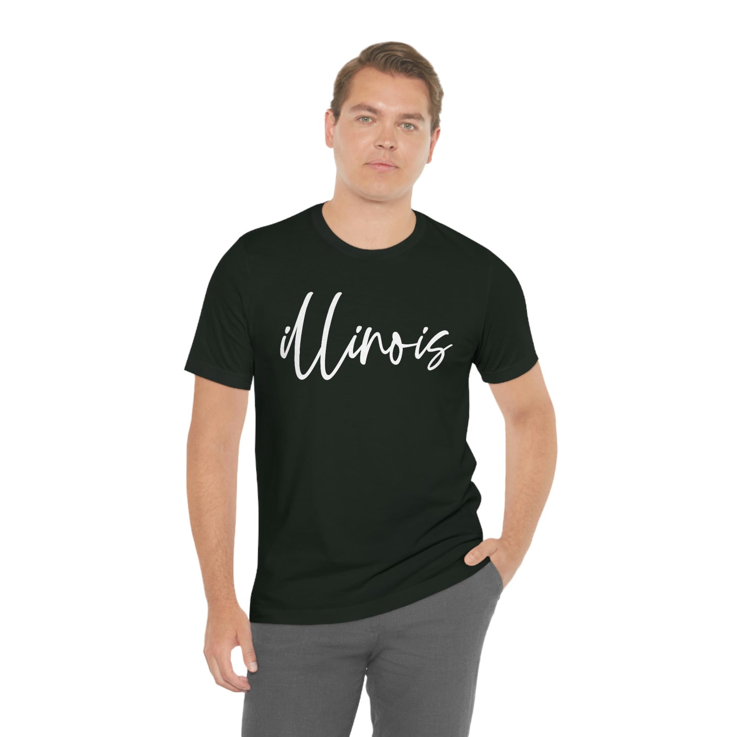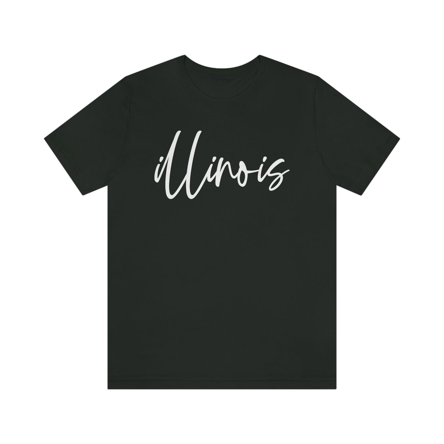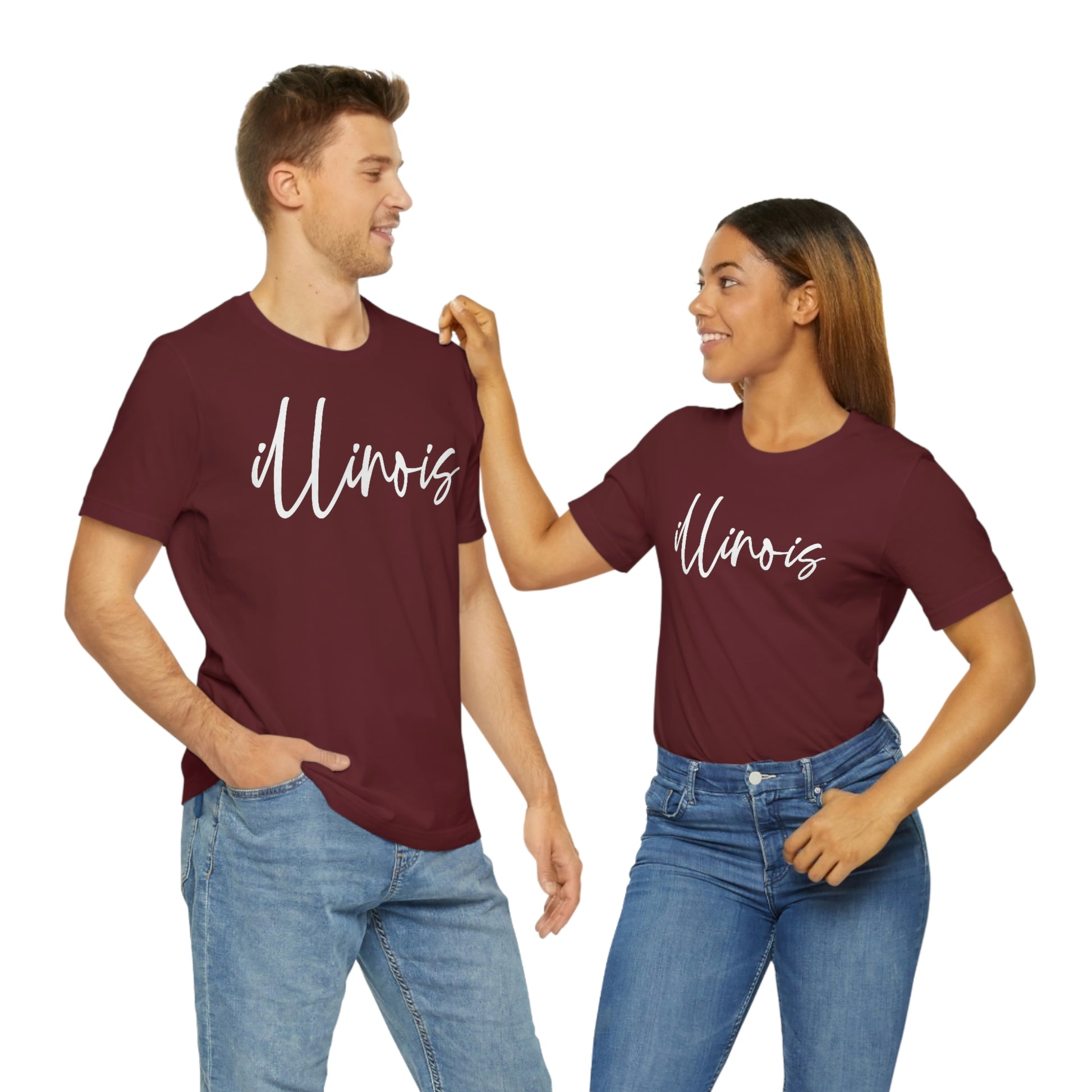 Show off your love and pride in Illinois with this classic unisex short sleeve t-shirt showing Illinois written in white script. This tee fits like a well-loved favorite. Soft cotton and quality print make you fall in love with it over and over again. These t-shirts have ribbed knit collars to bolster shaping. The shoulders have taping for better fit over time. Dual side seams hold the garment's shape for longer.
