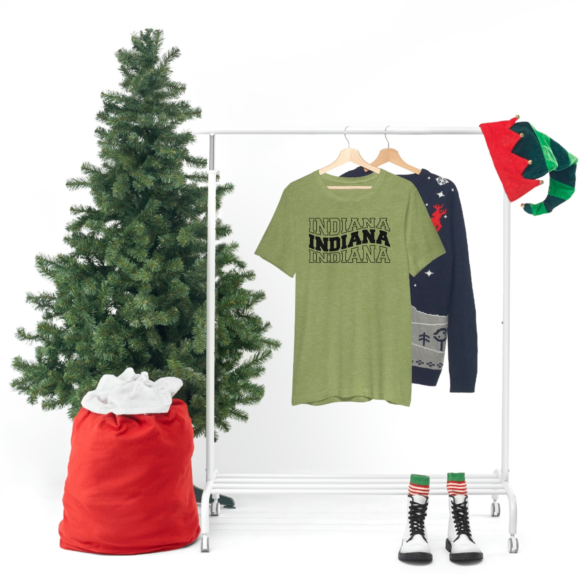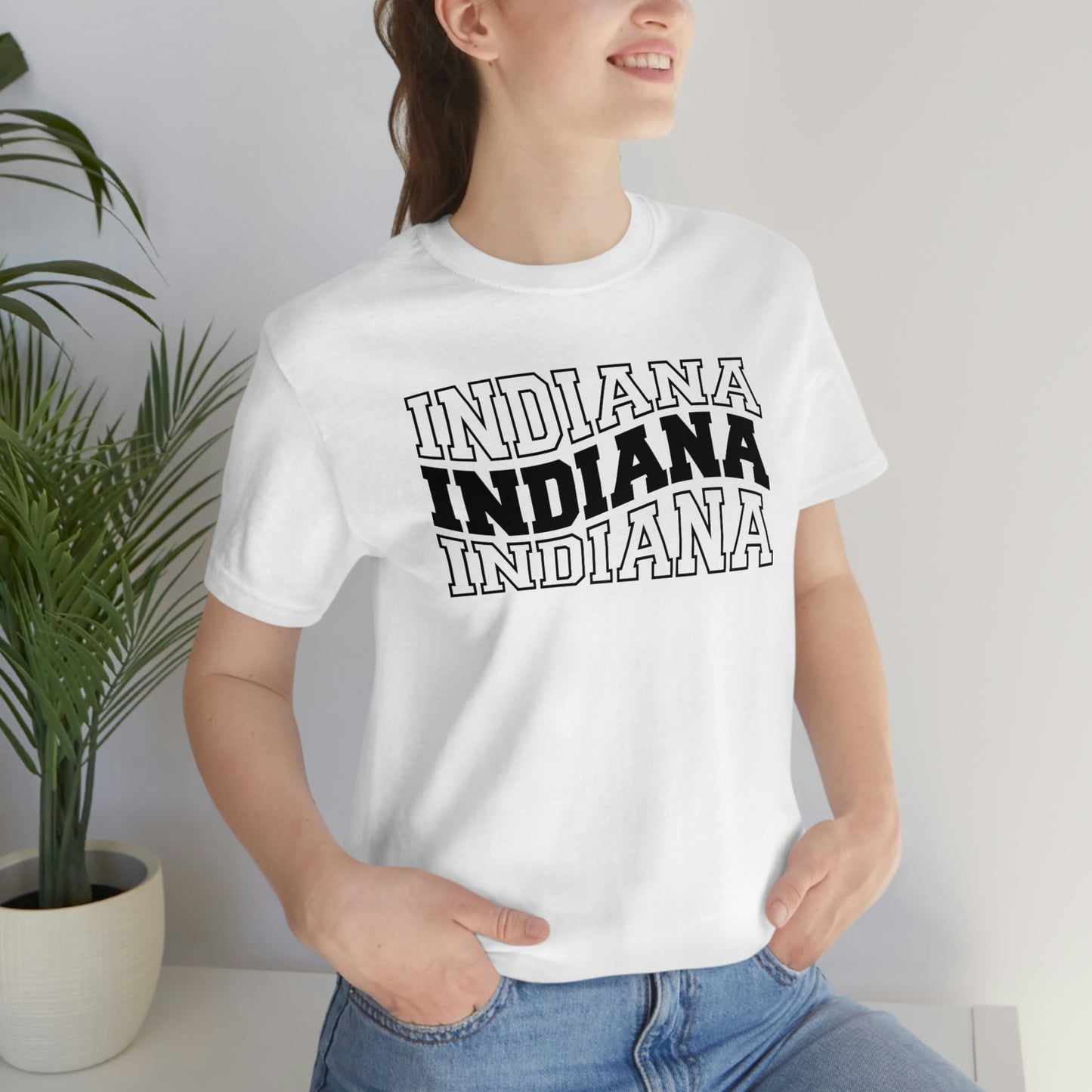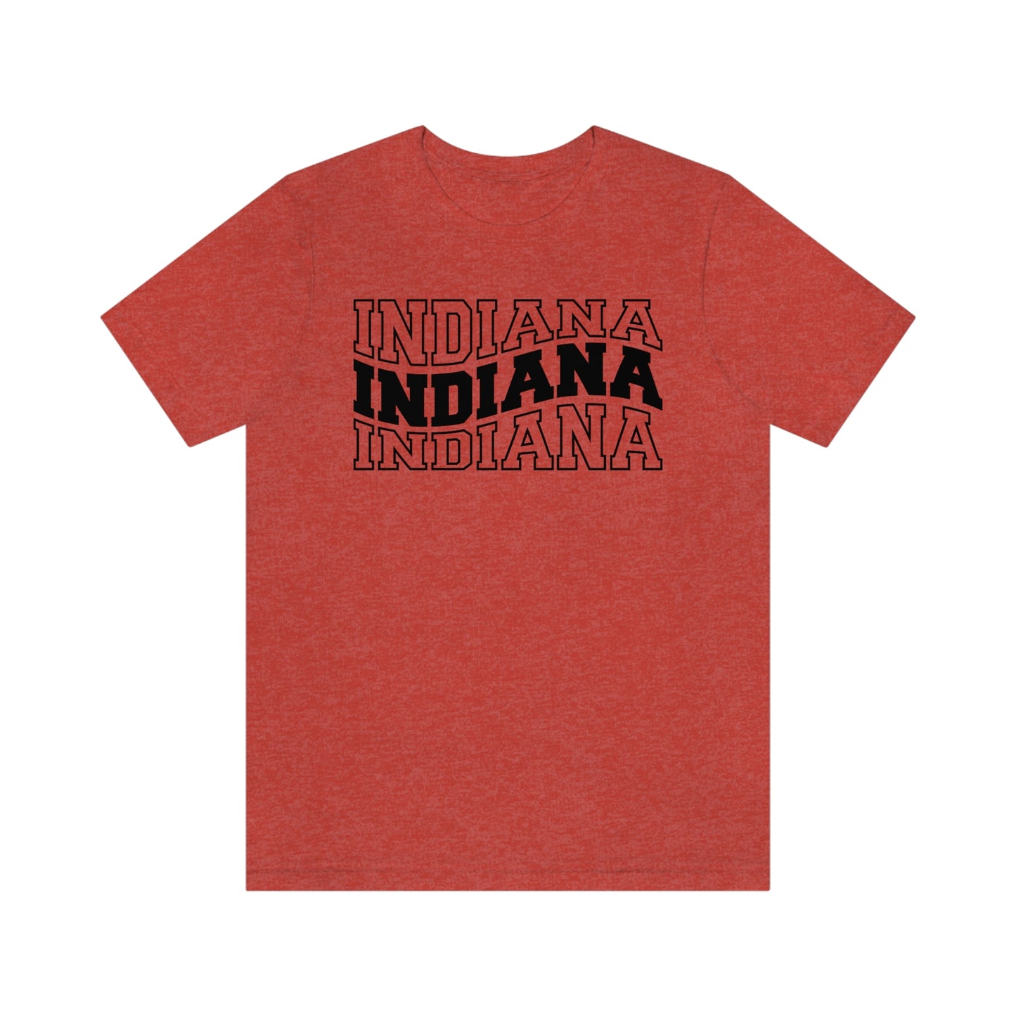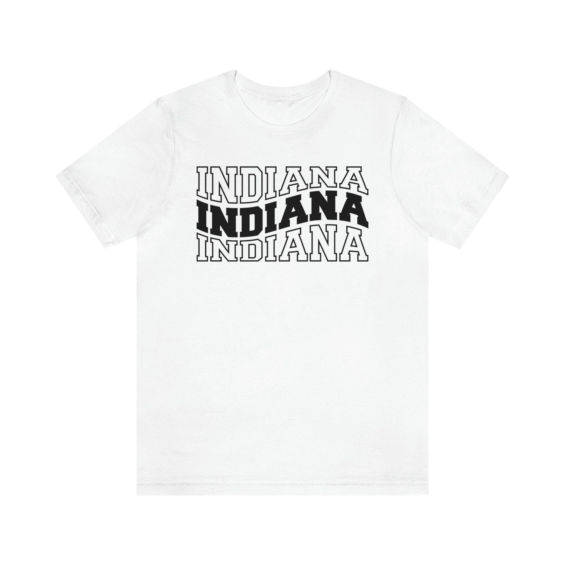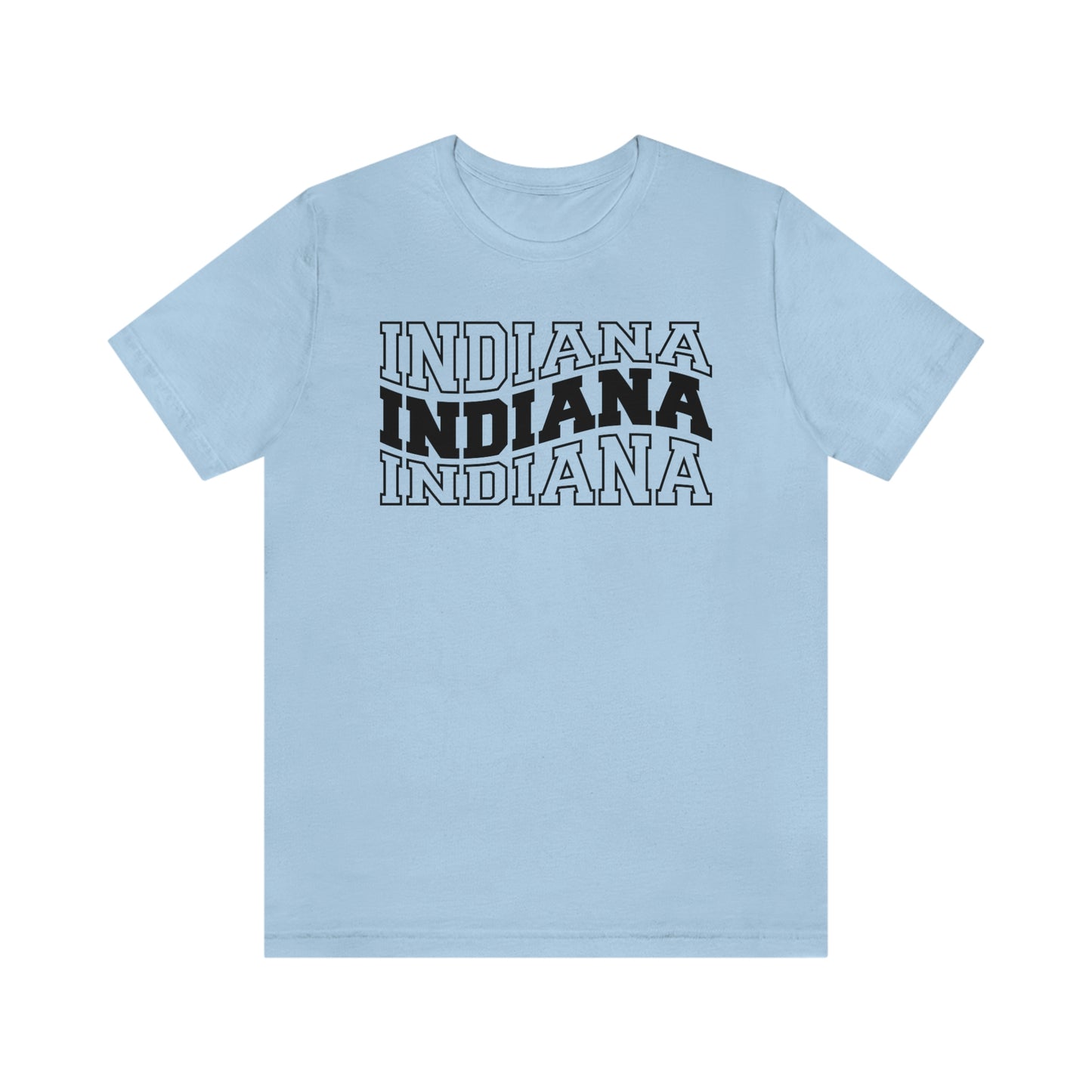 Show off your love and pride in Indiana with this classic unisex short sleeve t-shirt showing Indiana written in varsity letters in a triple wave design. This tee fits like a well-loved favorite. Soft cotton and quality print make you fall in love with it over and over again. These t-shirts have ribbed knit collars to bolster shaping. The shoulders have taping for better fit over time. Dual side seams hold the garment's shape for longer.