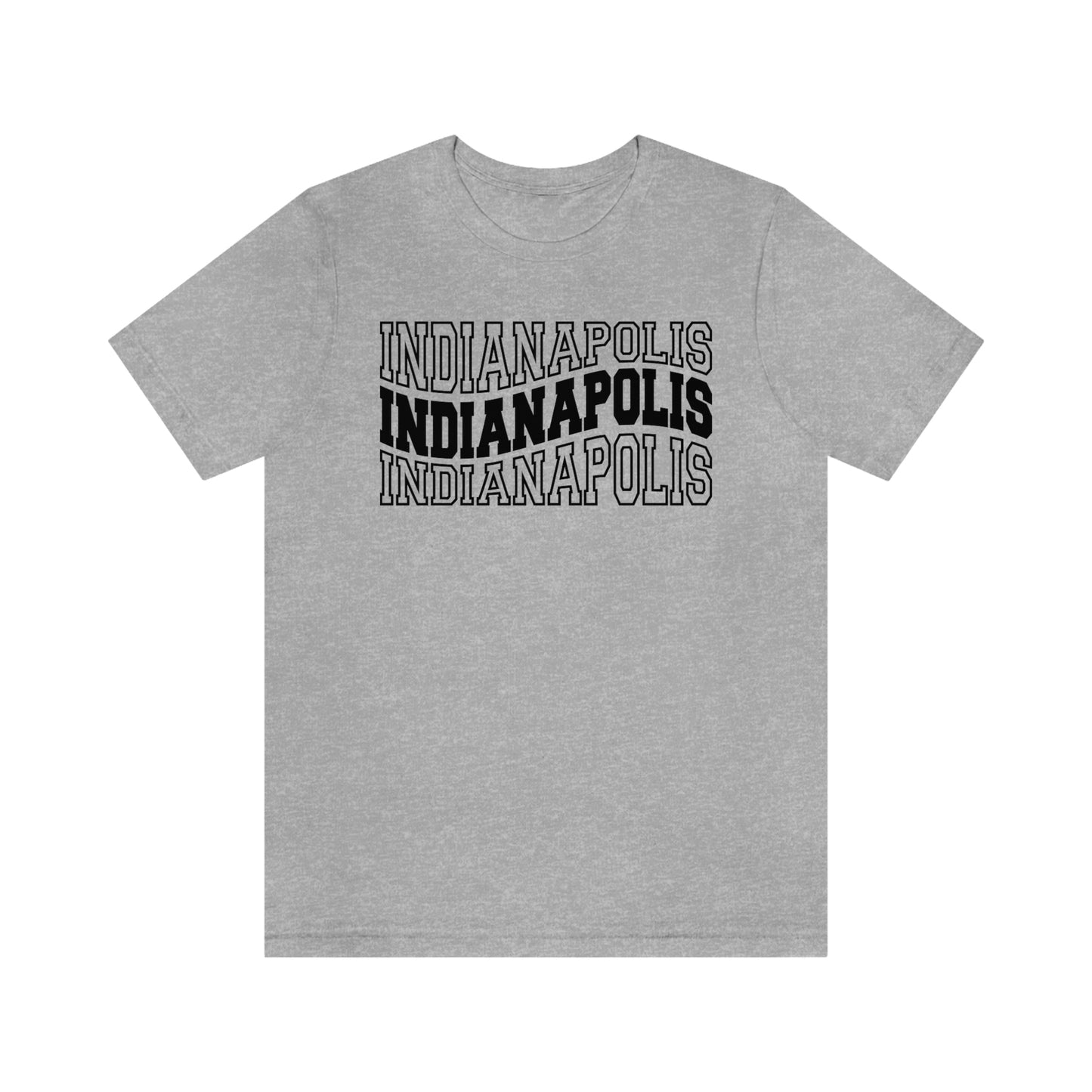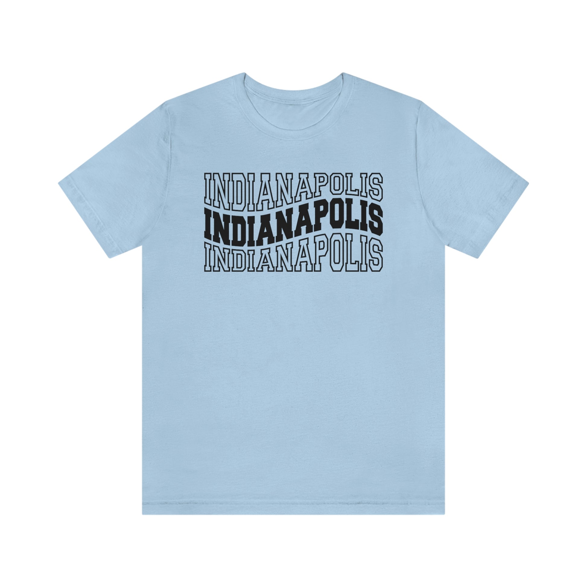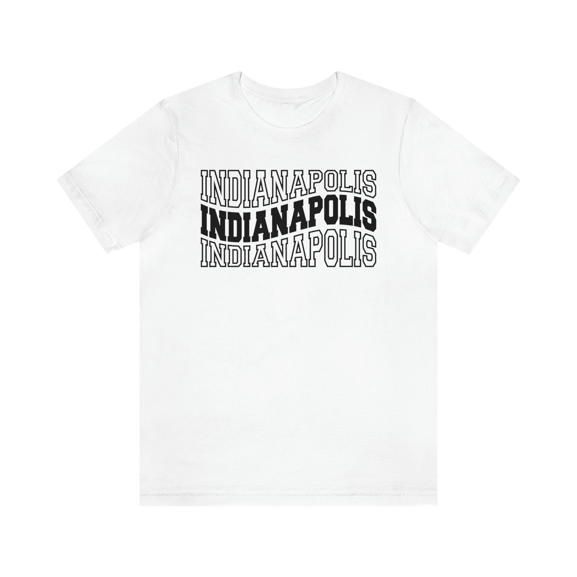 Show off your love and pride in Indianapolis with this classic unisex short sleeve t-shirt showing Indianapolis written in varsity letters in a triple wave design. This tee fits like a well-loved favorite. Soft cotton and quality print make you fall in love with it over and over again. These t-shirts have ribbed knit collars to bolster shaping. The shoulders have taping for better fit over time. Dual side seams hold the garment's shape for longer.