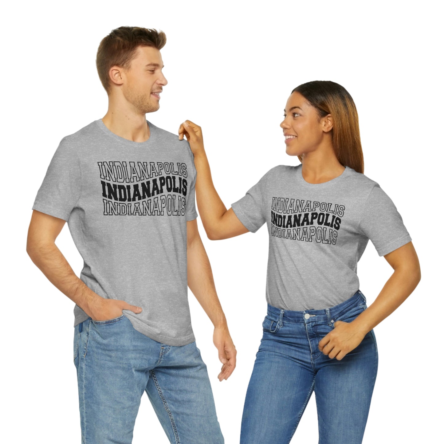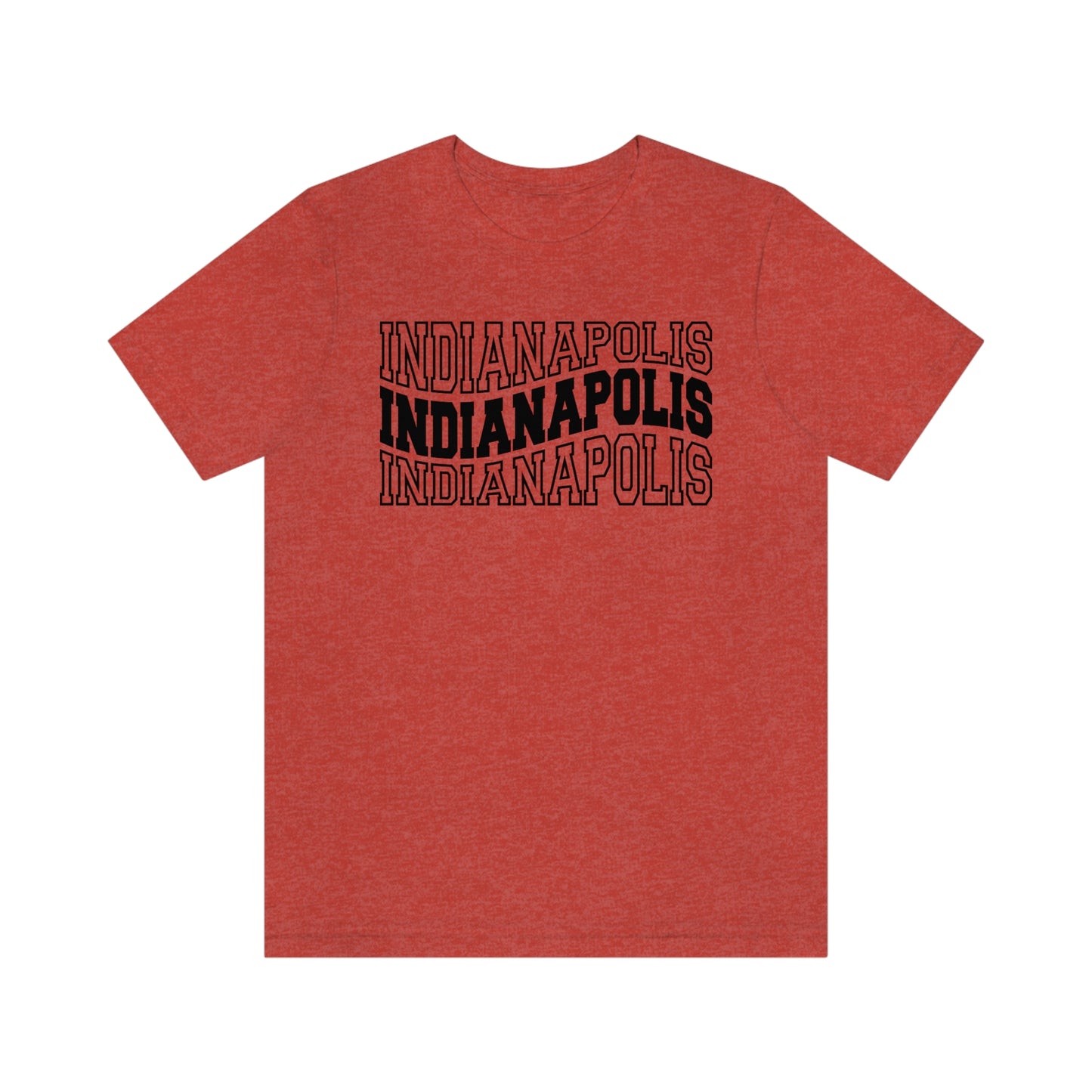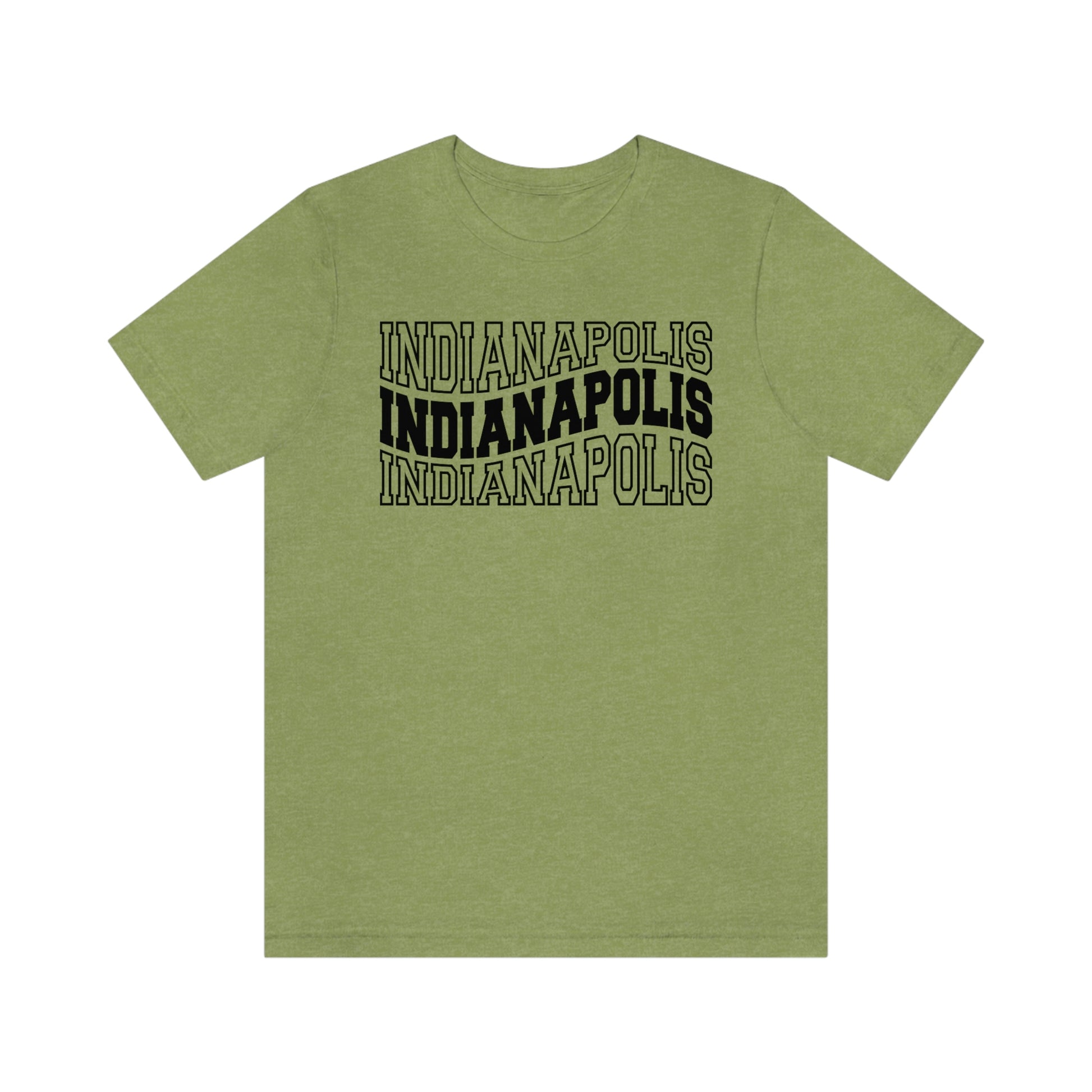 Show off your love and pride in Indianapolis with this classic unisex short sleeve t-shirt showing Indianapolis written in varsity letters in a triple wave design. This tee fits like a well-loved favorite. Soft cotton and quality print make you fall in love with it over and over again. These t-shirts have ribbed knit collars to bolster shaping. The shoulders have taping for better fit over time. Dual side seams hold the garment's shape for longer.