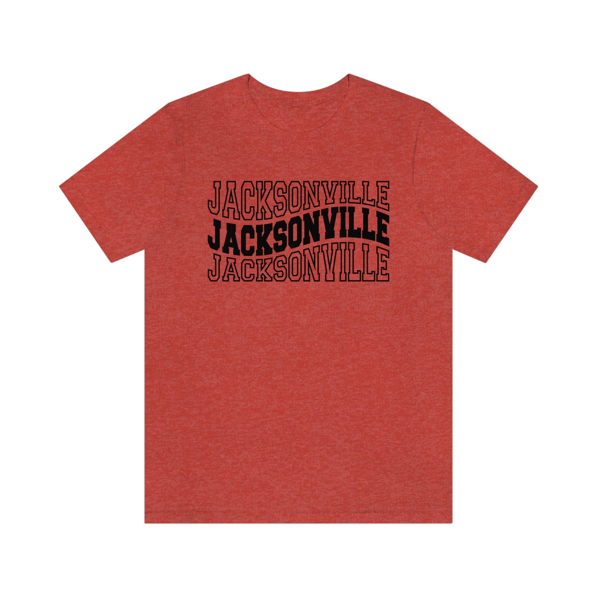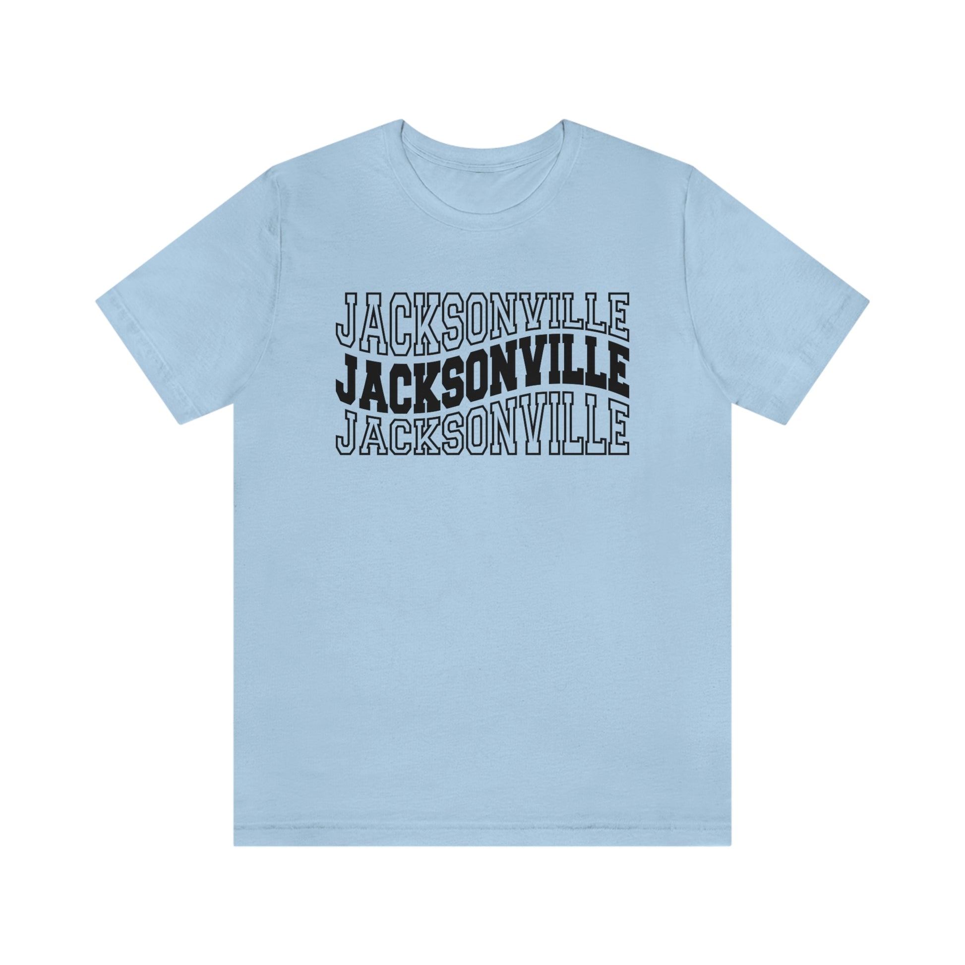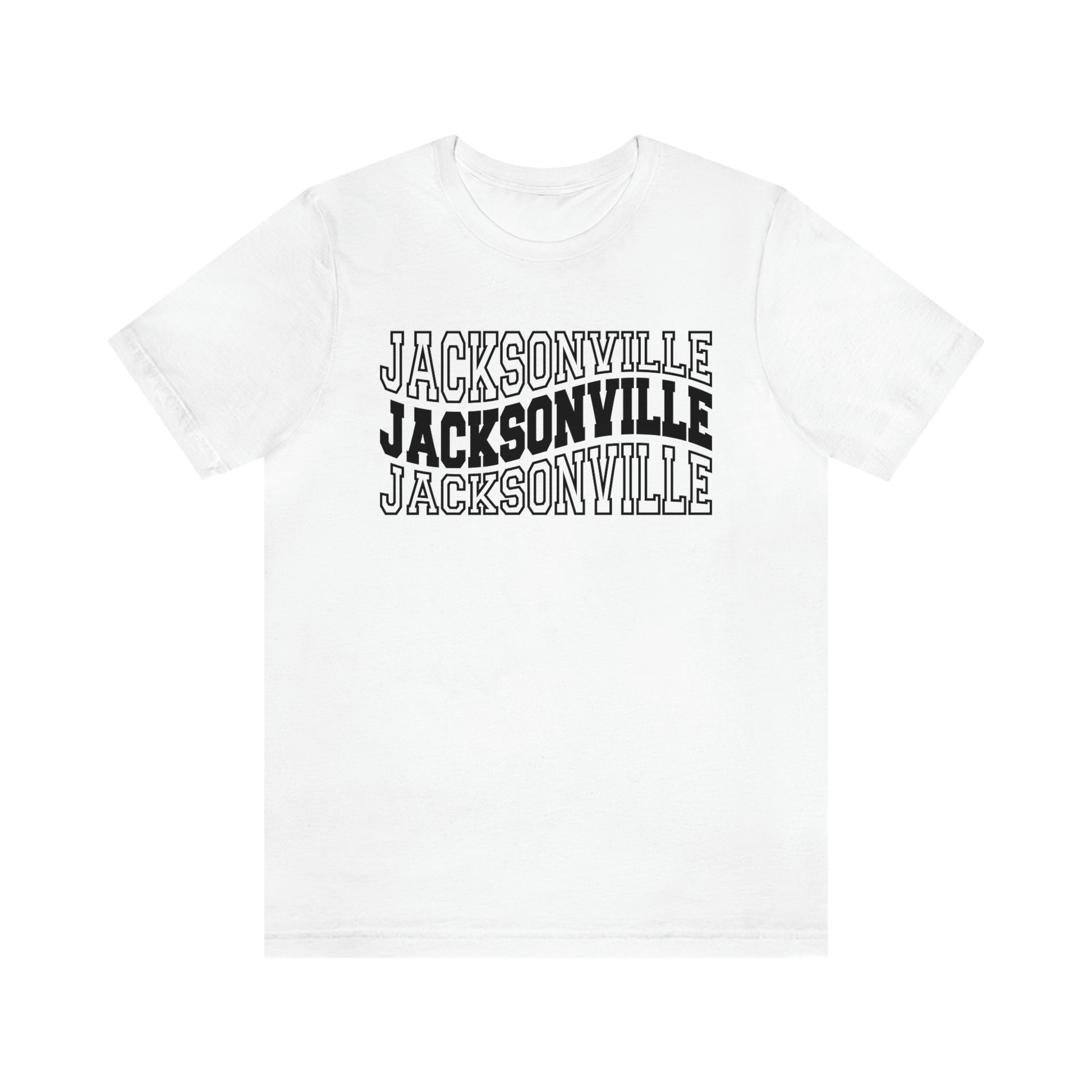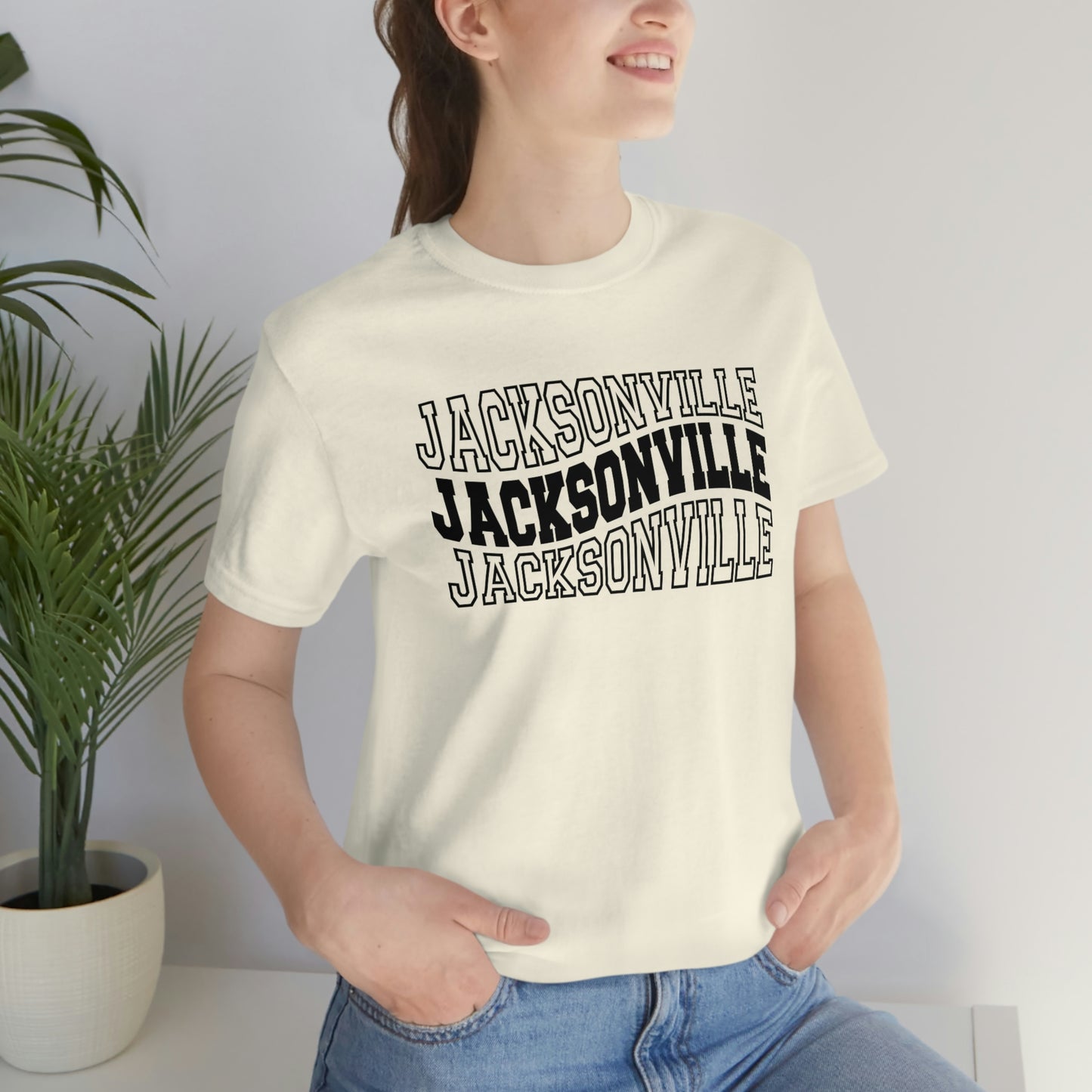 Show off your love and pride in Jacksonville with this classic unisex short sleeve t-shirt with Jacksonville written in a wavy stacked varsity letter pattern. This tee fits like a well-loved favorite. Soft cotton and quality print make you fall in love with it over and over again. These t-shirts have ribbed knit collars to bolster shaping. The shoulders have taping for better fit over time. Dual side seams hold the garment's shape for longer.
