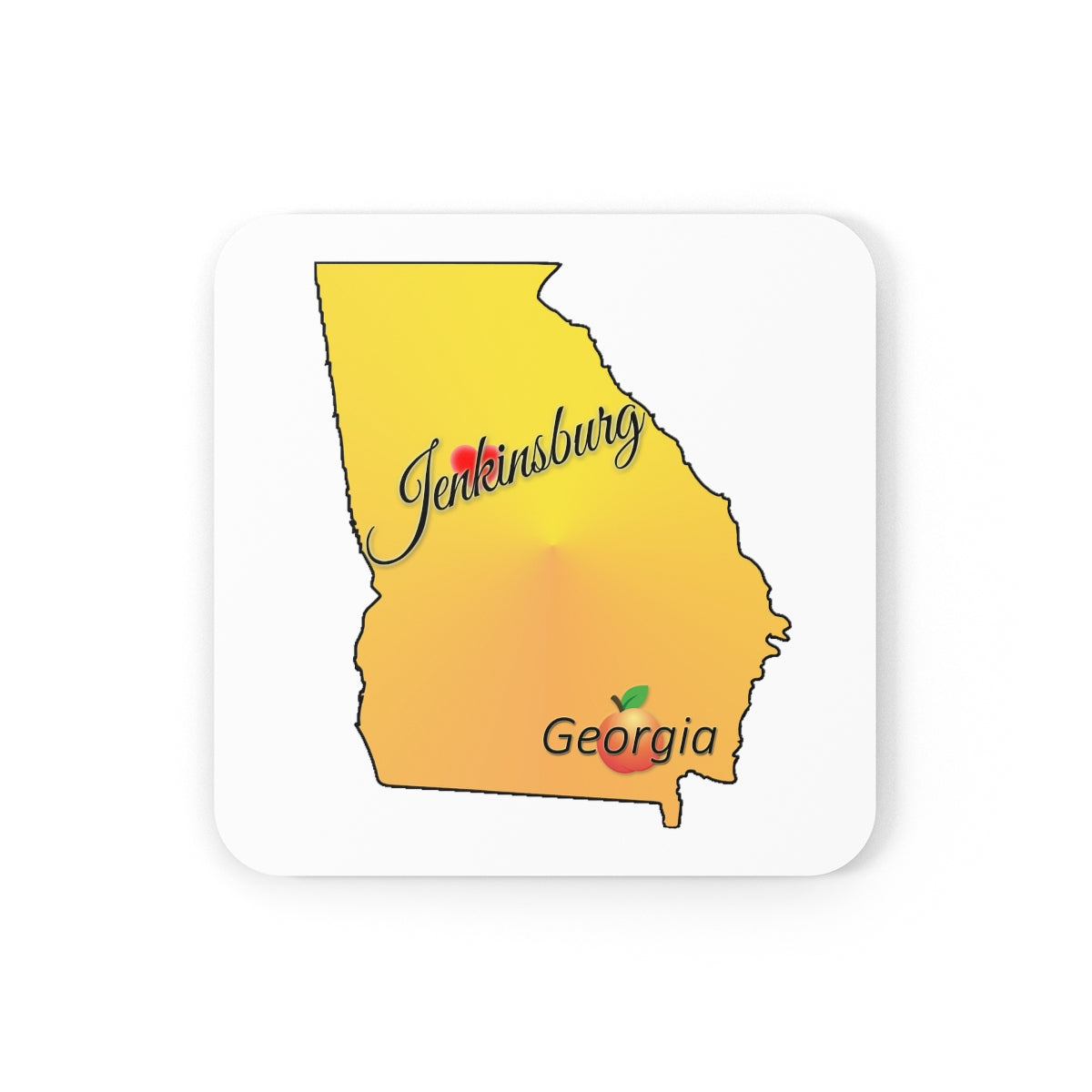 This coaster set comes with 4 coasters in one size. They are made with a high-gloss top and feature a cork back to prevent sliding.