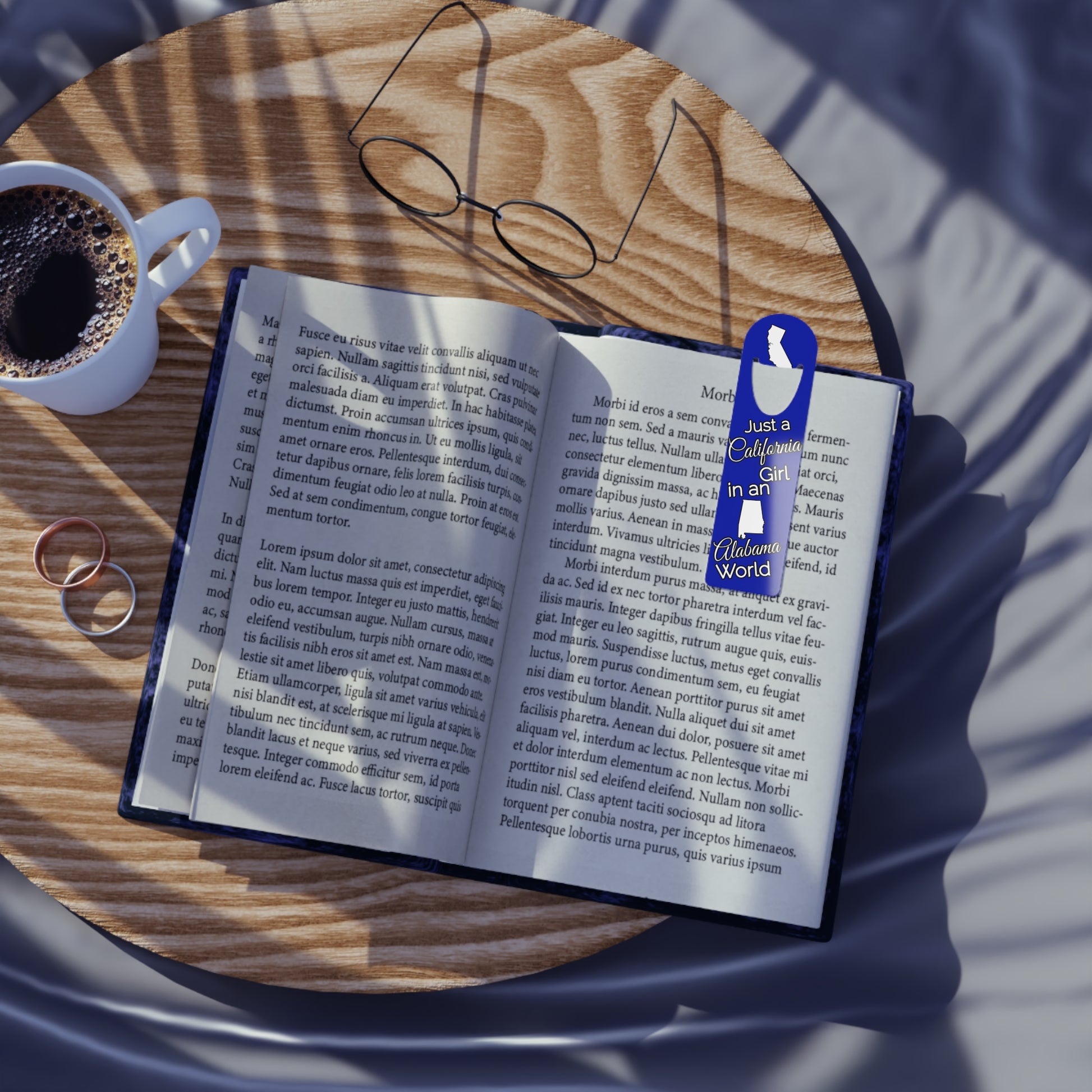 Show your pride in your home state with this bookmark showing Just a California Girl in an Alabama World.  Made with robust aluminum, features top slot that holds single pages in place.