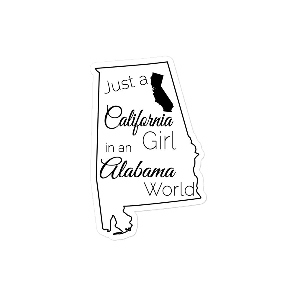Show your pride in your home state with this sticker showing Just a California Girl in an Alabama World. These stickers are printed on durable, high opacity adhesive vinyl which makes them perfect for regular use, as well as for covering other stickers or paint. The high-quality vinyl ensures there are no bubbles when applying the stickers.