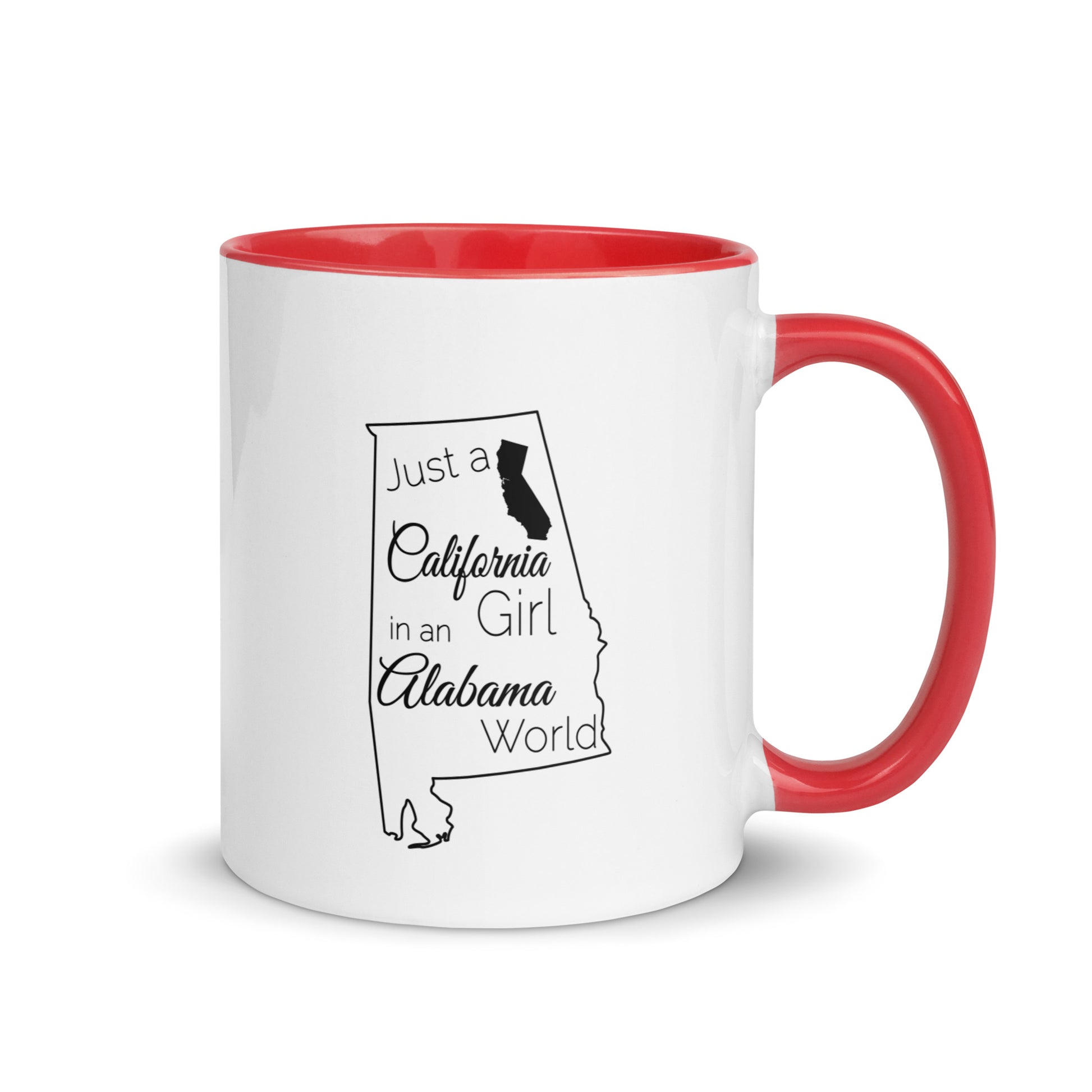 Show your pride in your home state with this coffee mug showing Just a California Girl in an Alabama World. Add a splash of color to your morning coffee or tea ritual! These ceramic mugs not only have a beautiful design on them, but also a colorful rim, handle, and inside, so the mug is bound to spice up your mug rack.