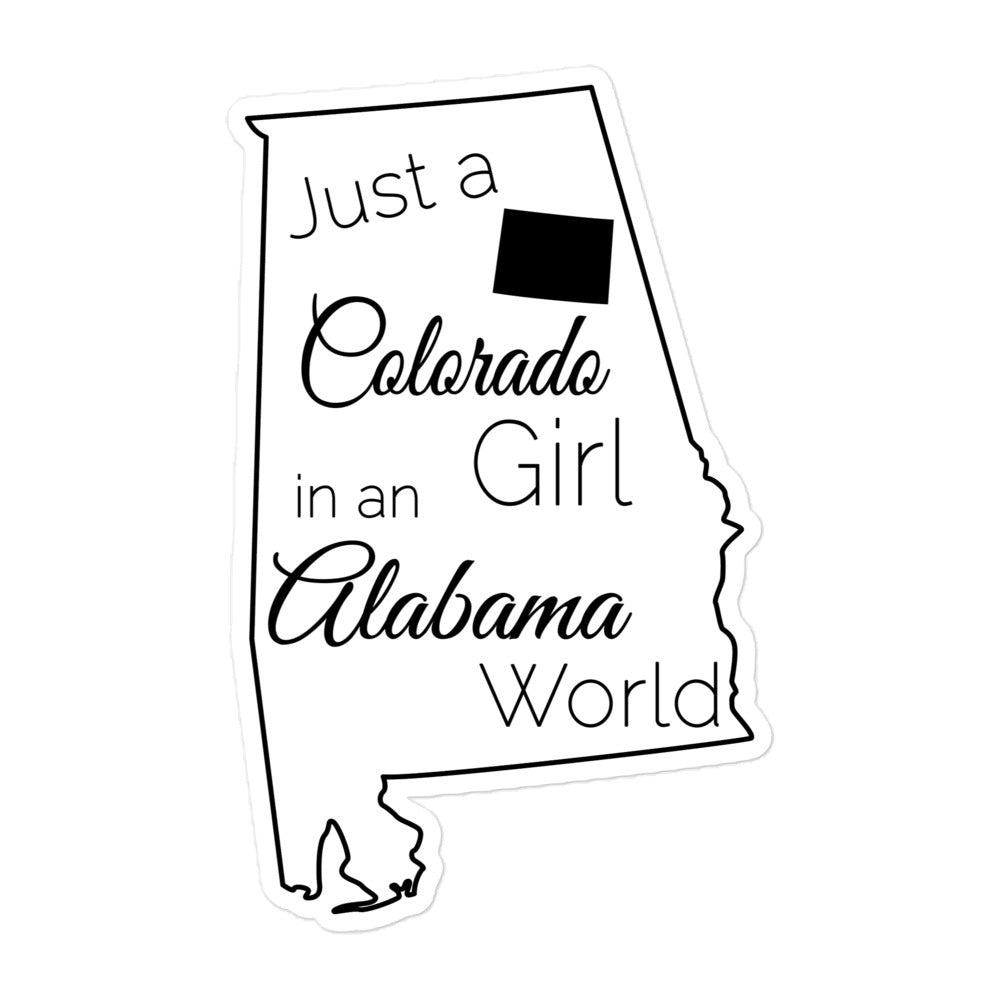 Show your pride in your home state with this sticker showing Just a Colorado Girl in an Alabama World. These stickers are printed on durable, high opacity adhesive vinyl which makes them perfect for regular use, as well as for covering other stickers or paint. The high-quality vinyl ensures there are no bubbles when applying the stickers.