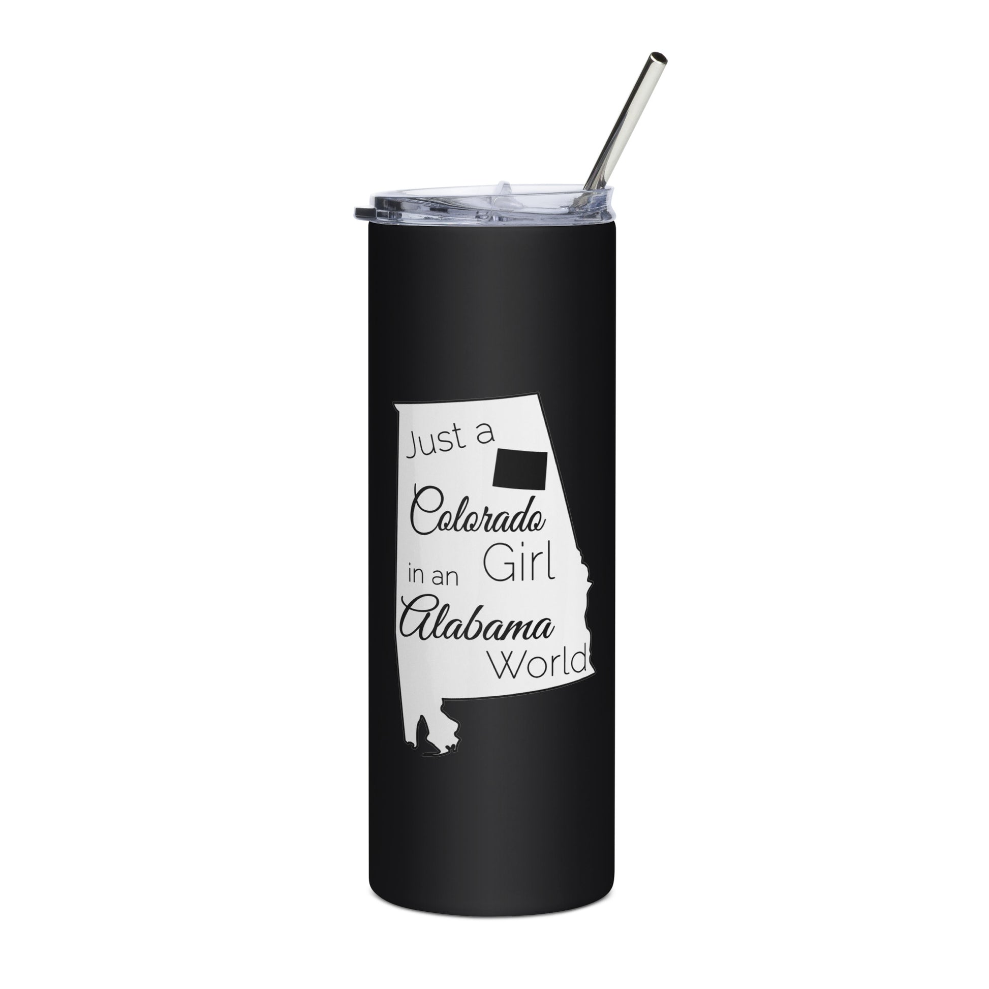 Show your pride in your home state with this tumbler showing Just a Colorado Girl in an Alabama World. Enjoy hot or cold drinks on the go with this stylish stainless steel tumbler! This reusable tumbler with a metal straw is a perfect combo for hot or cold drinks at any time of the day.