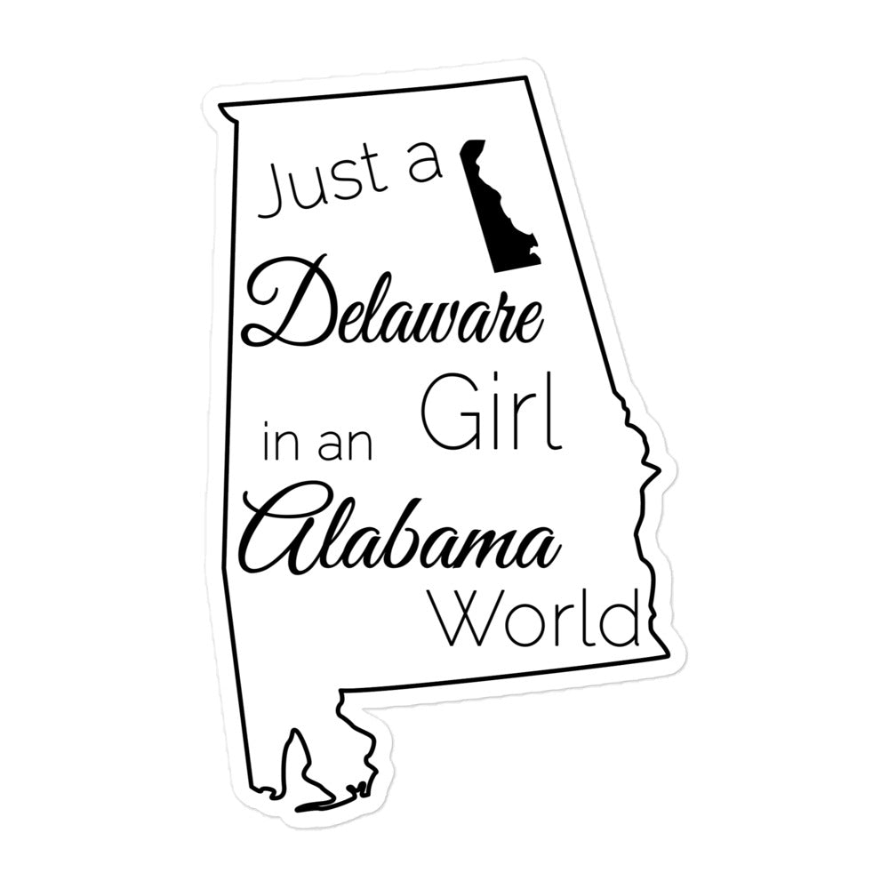 Show your pride in your home state with this sticker showing Just a Delaware Girl in an Alabama World. These stickers are printed on durable, high opacity adhesive vinyl which makes them perfect for regular use, as well as for covering other stickers or paint. The high-quality vinyl ensures there are no bubbles when applying the stickers.