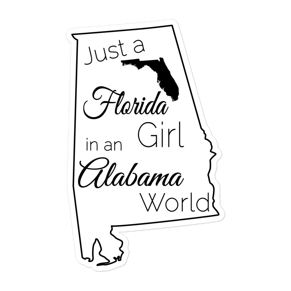 Show your pride in your home state with this sticker showing Just a Florida Girl in an Alabama World. These stickers are printed on durable, high opacity adhesive vinyl which makes them perfect for regular use, as well as for covering other stickers or paint. The high-quality vinyl ensures there are no bubbles when applying the stickers.