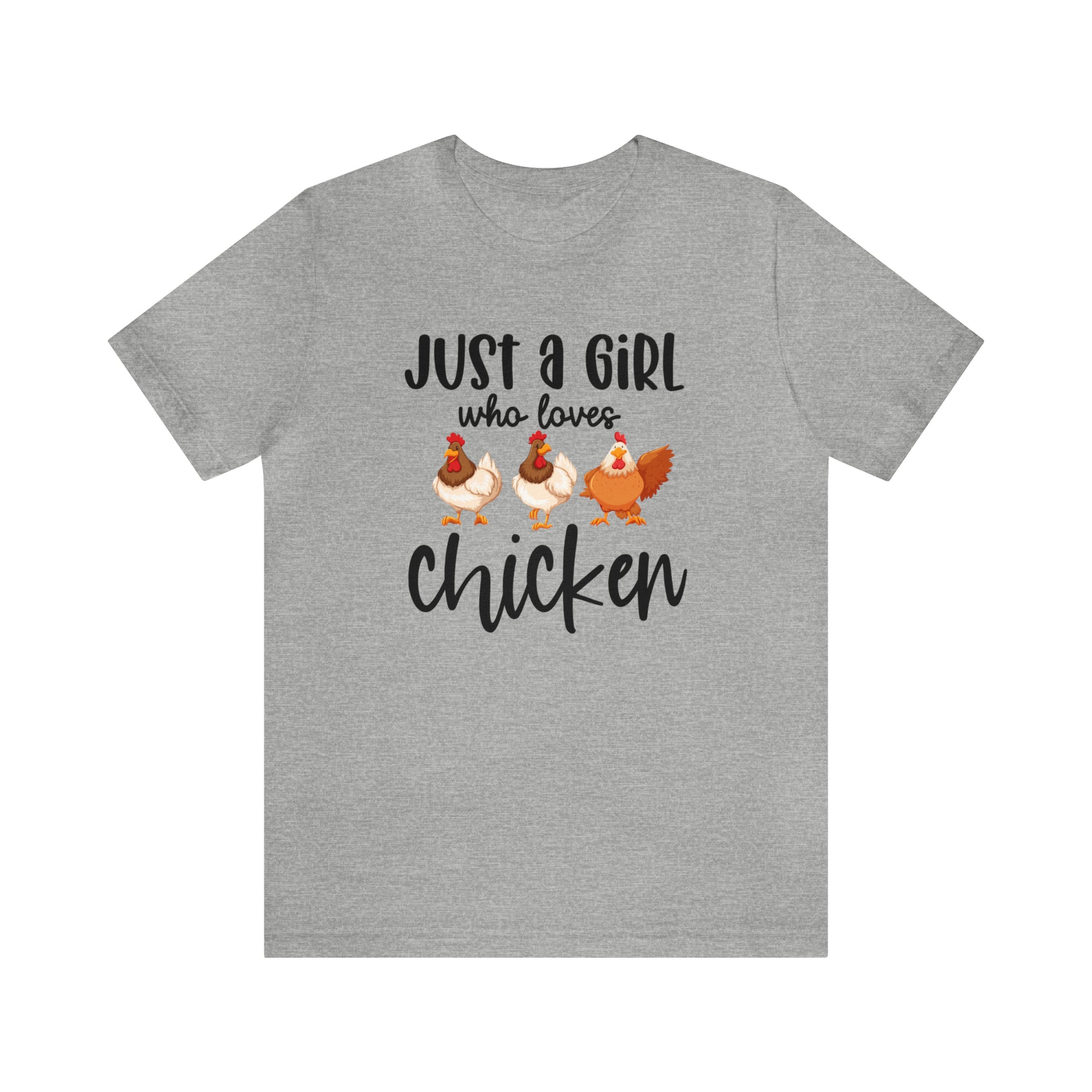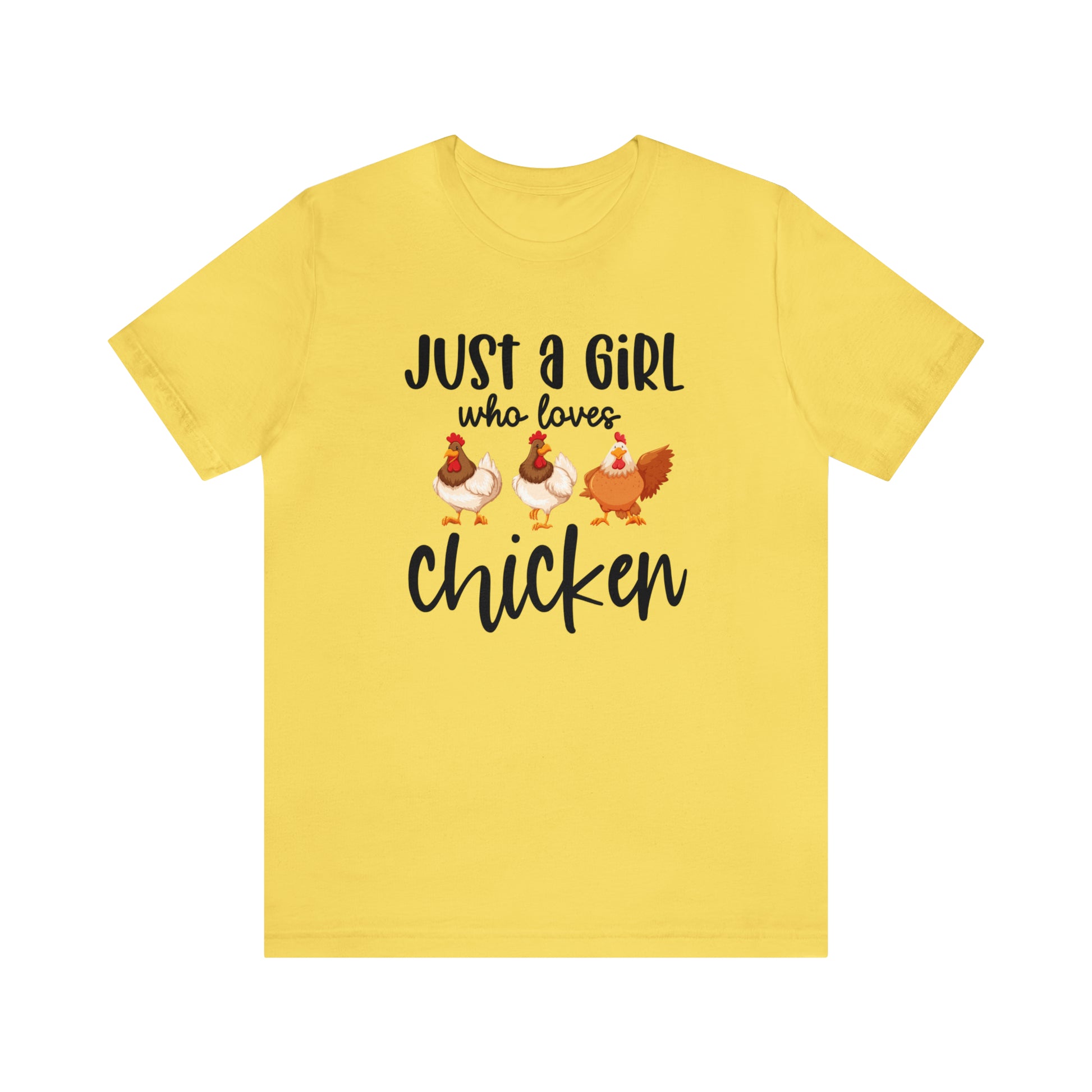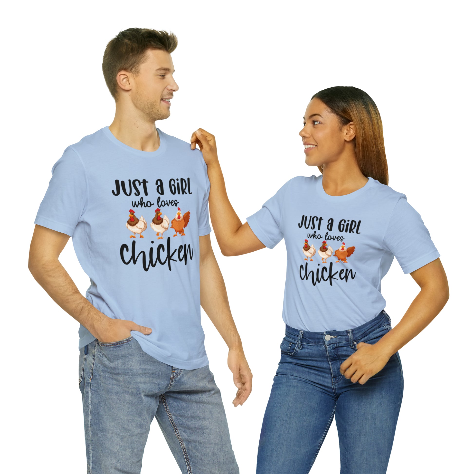 This classic unisex short sleeve chicken t-shirt reads Just a Girl Who Loves Chicken. This tee fits like a well-loved favorite. Soft cotton and quality print make you fall in love with it over and over again. These t-shirts have ribbed knit collars to bolster shaping. The shoulders have taping for better fit over time. Dual side seams hold the garment's shape for longer.