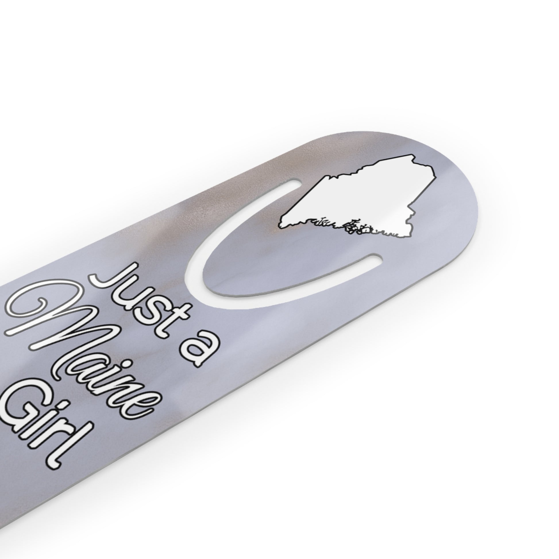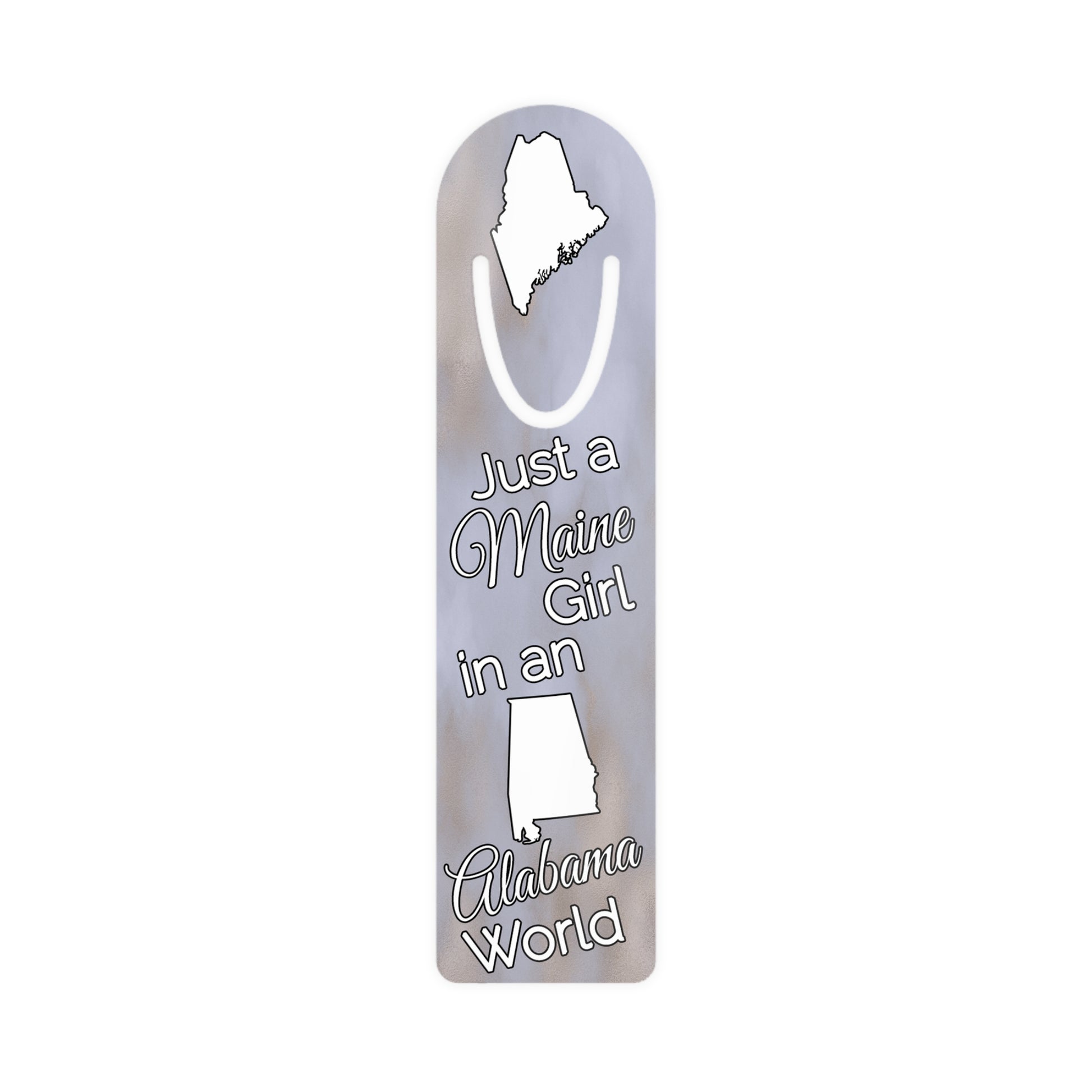 Show your pride in your home state with this bookmark showing Just a Maine Girl in an Alabama World.  Made with robust aluminum, features top slot that holds single pages in place.