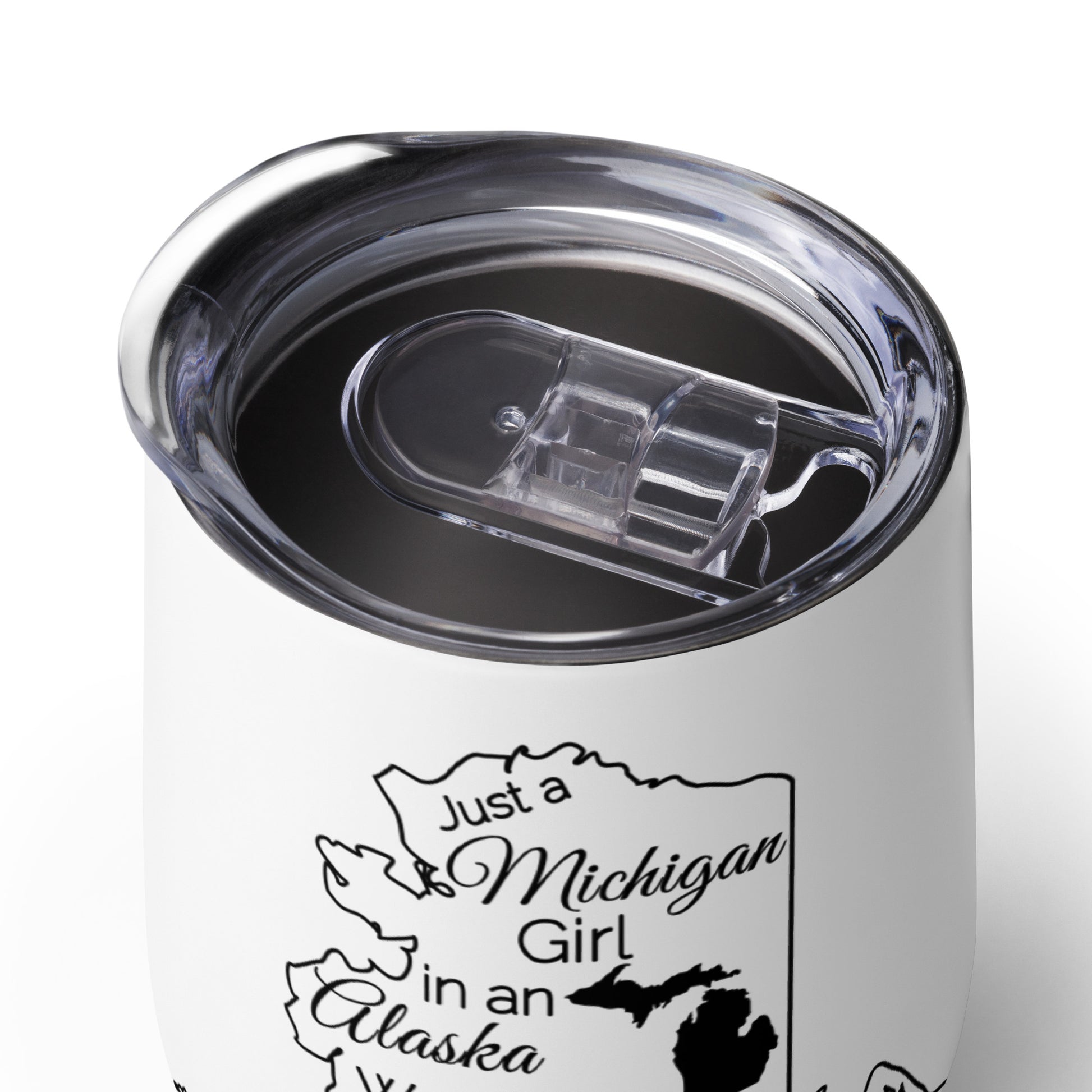 Show your pride in your home state with this wine tumbler showing Just a Michigan Girl in an Alaska World. What’s an outdoor party without a wine tumbler to keep a drink fresh and at just the right temperature? Forget breakable glasses—give this uniquely shaped wine tumbler a chance and have fun with friends without worry.