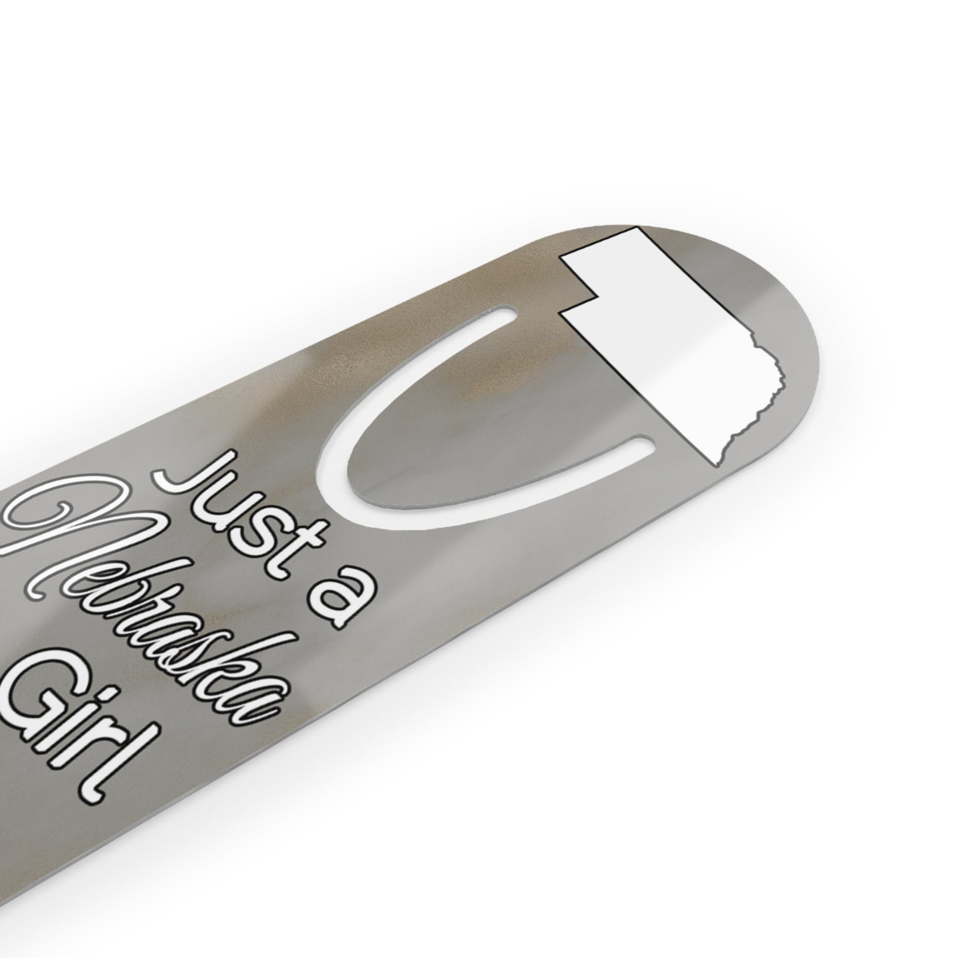 Show your pride in your home state with this bookmark showing Just a Nebraska Girl in an Alabama World. Made with robust aluminum, features top slot that holds single pages in place.
