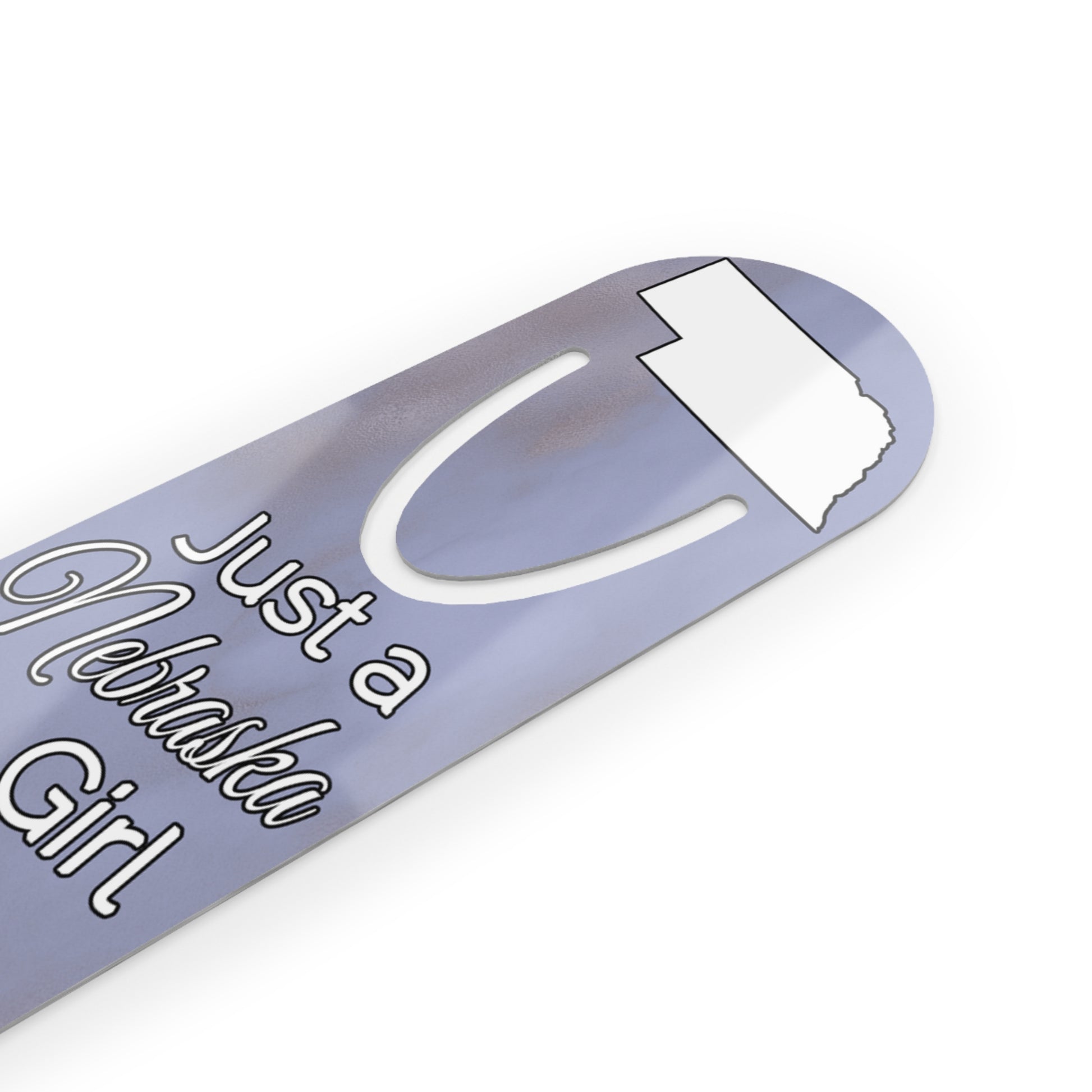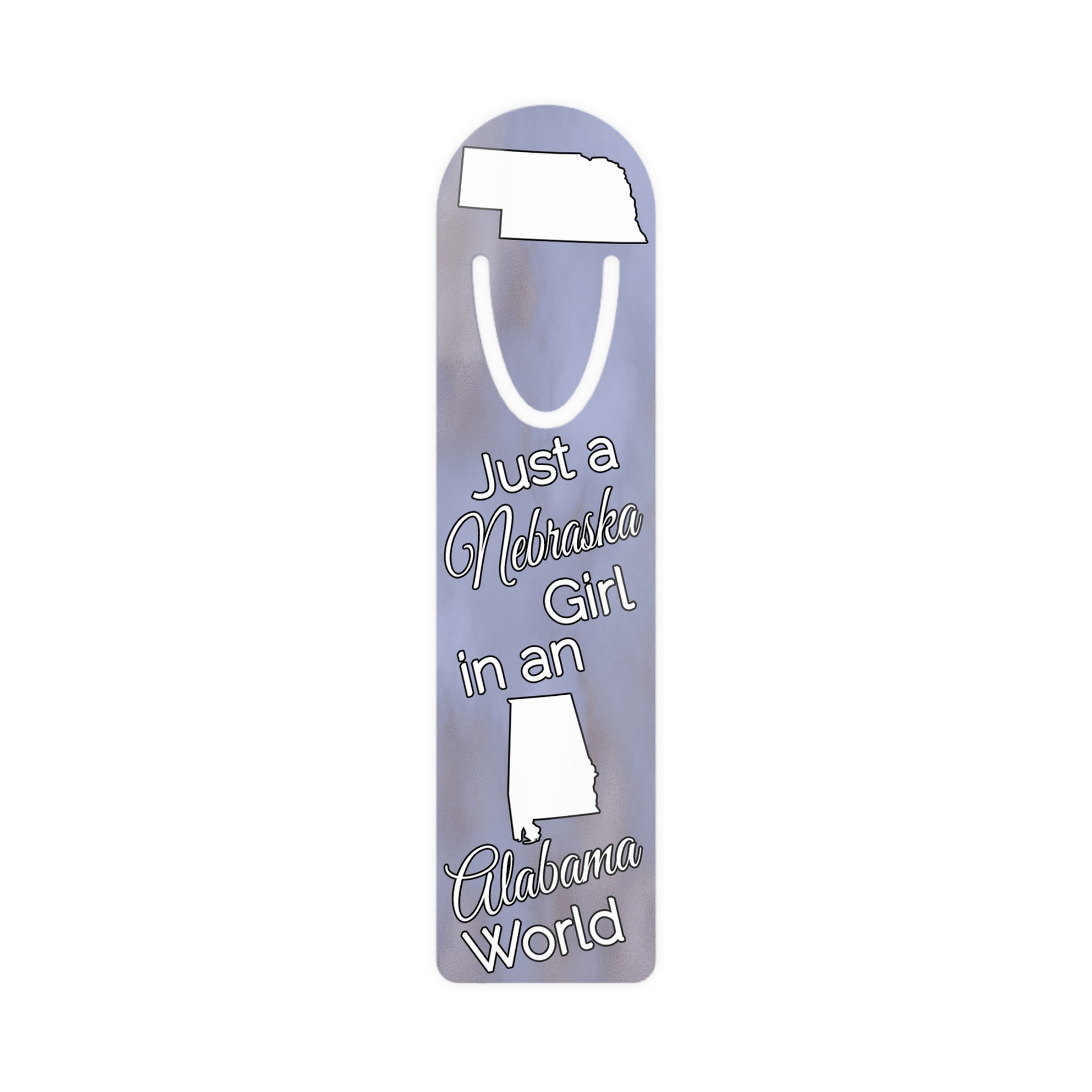 Show your pride in your home state with this bookmark showing Just a Nebraska Girl in an Alabama World.  Made with robust aluminum, features top slot that holds single pages in place.