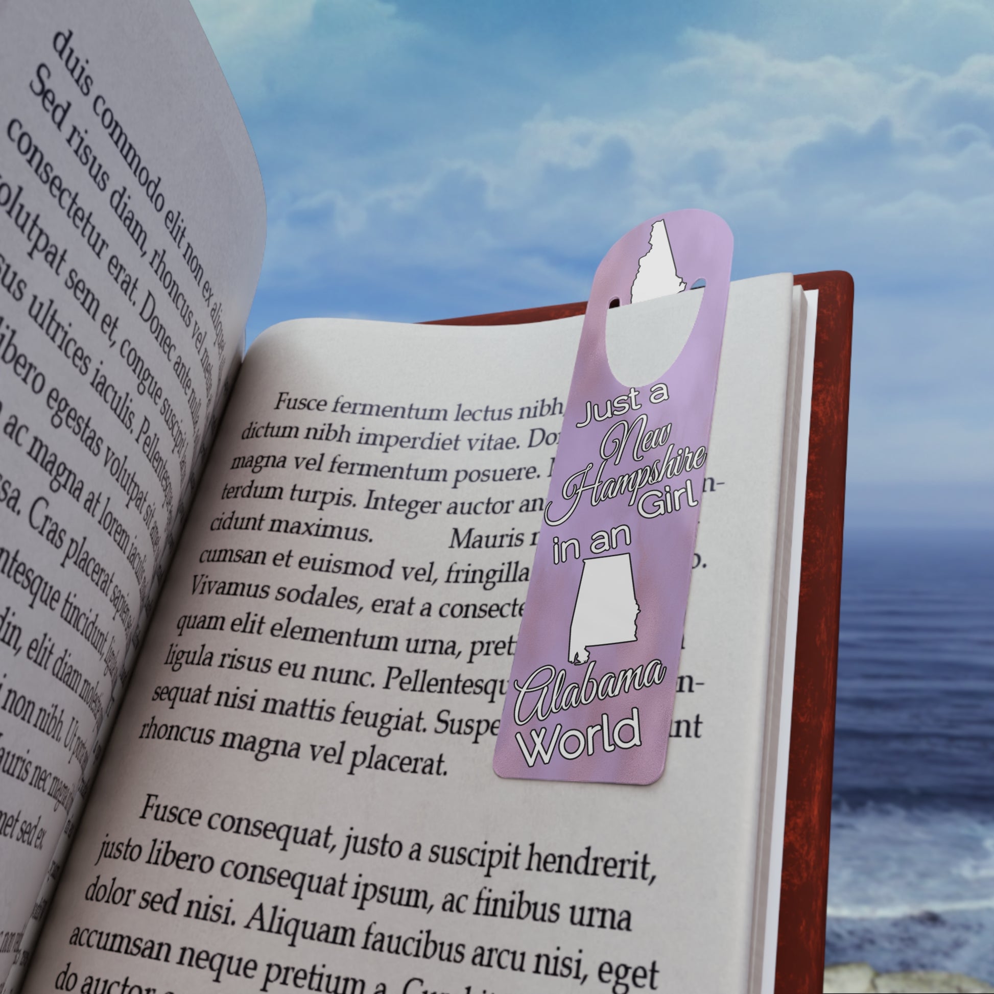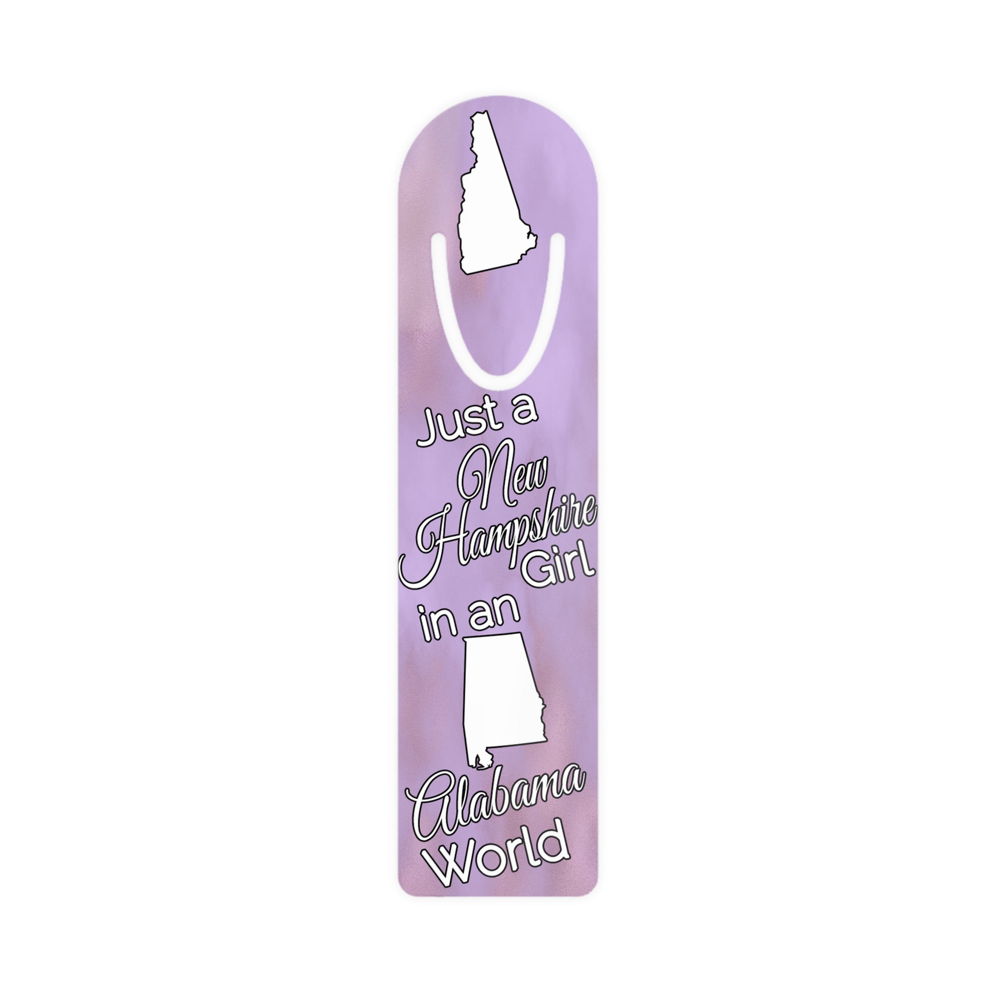 Show your pride in your home state with this bookmark showing Just a New Hampshire Girl in an Alabama World. Made with robust aluminum, features top slot that holds single pages in place.