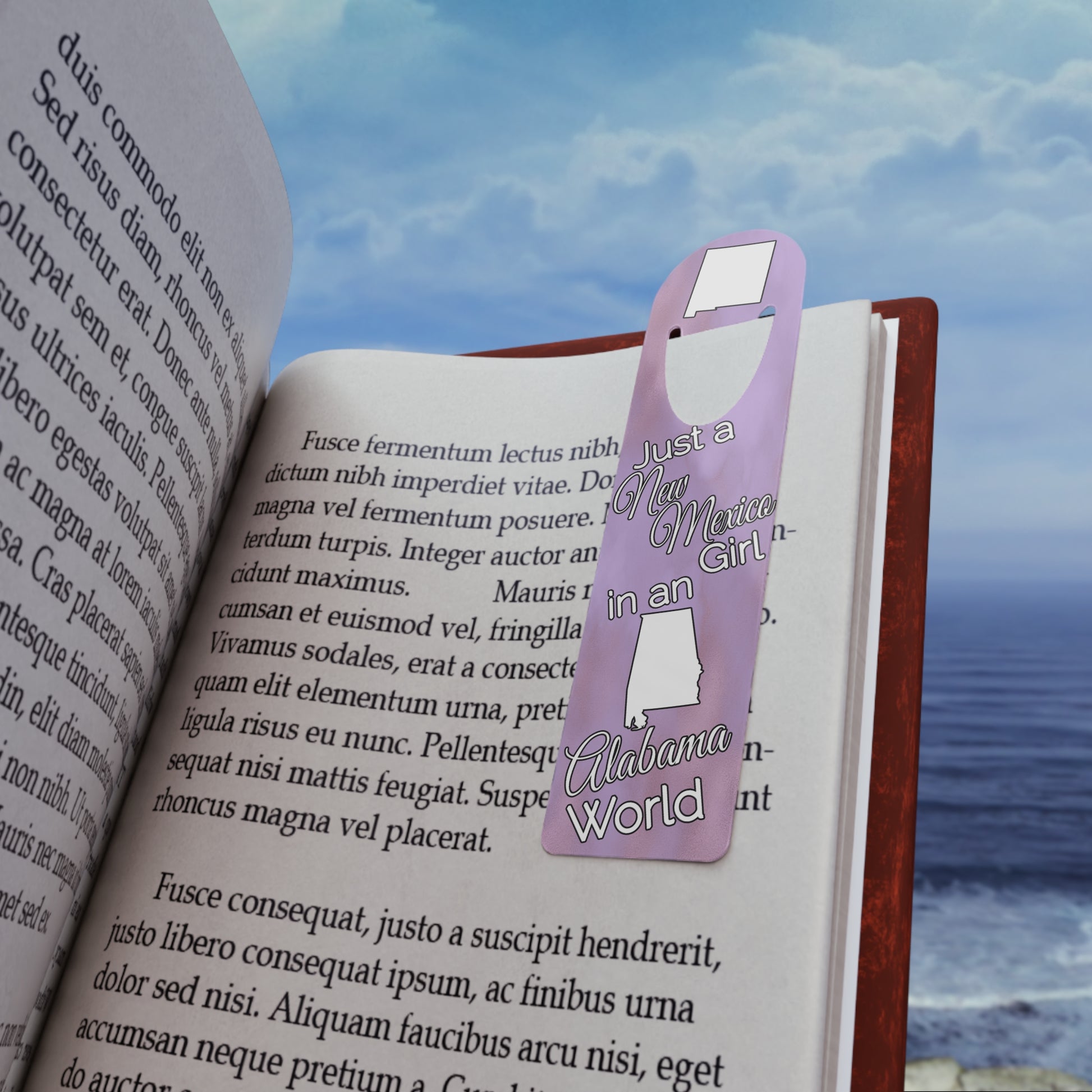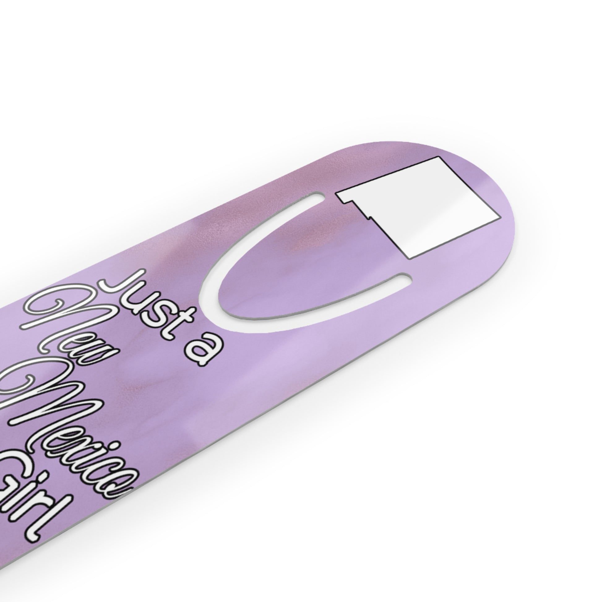 Show your pride in your home state with this bookmark showing Just a New Mexico Girl in an Alabama World.  Made with robust aluminum, features top slot that holds single pages in place.