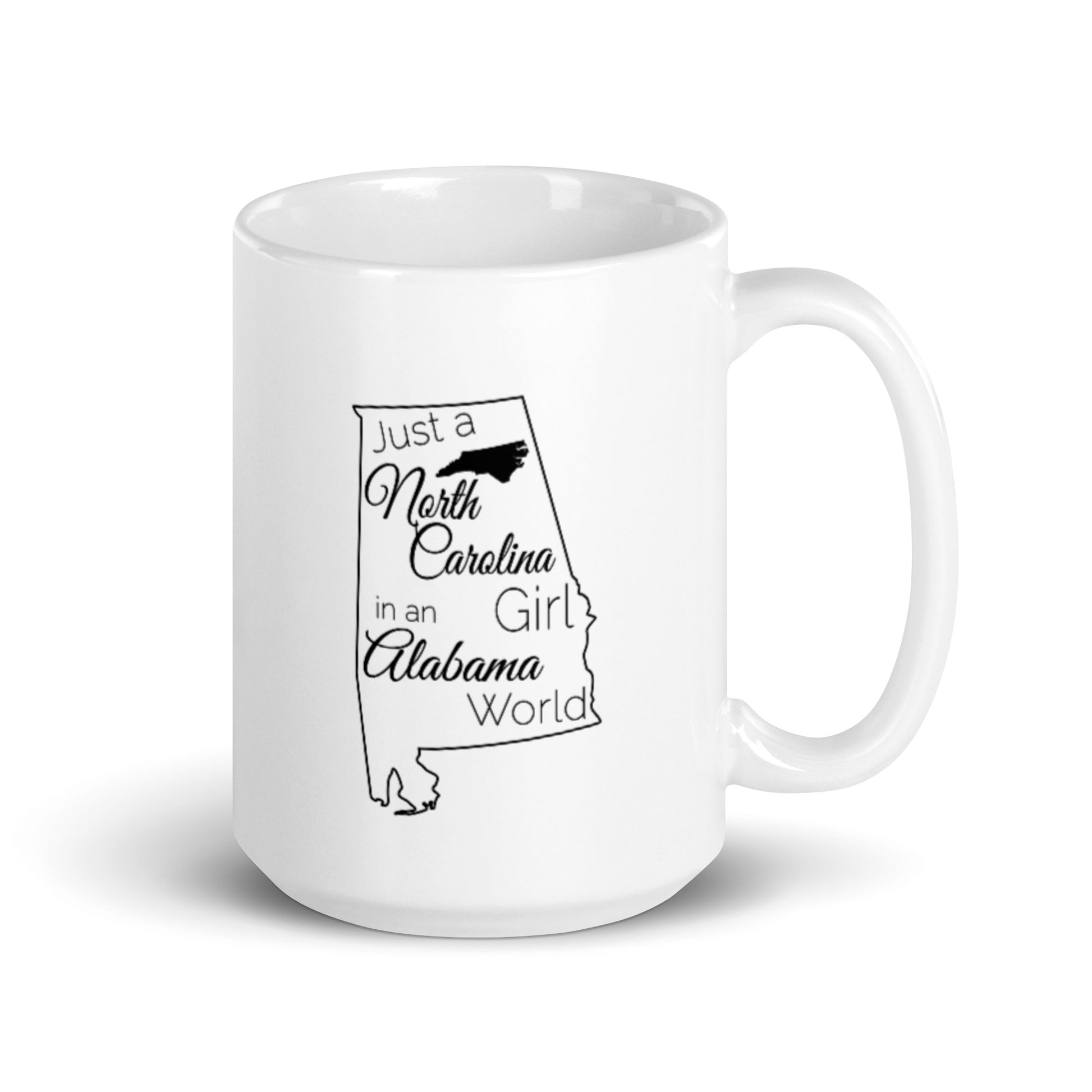 Just a North Carolina Girl in an Alabama World White glossy mug
