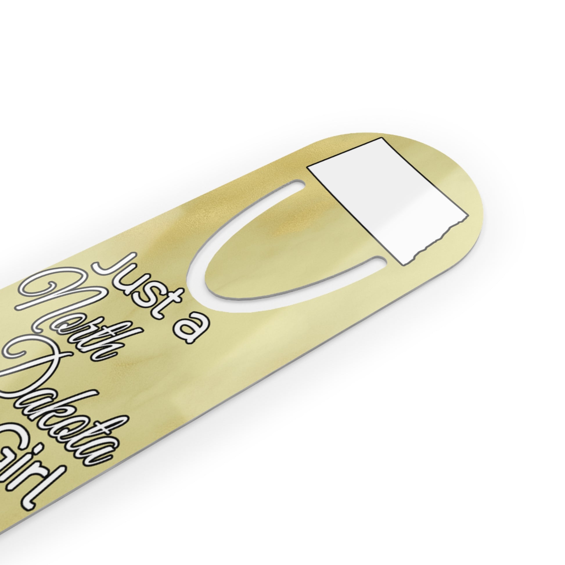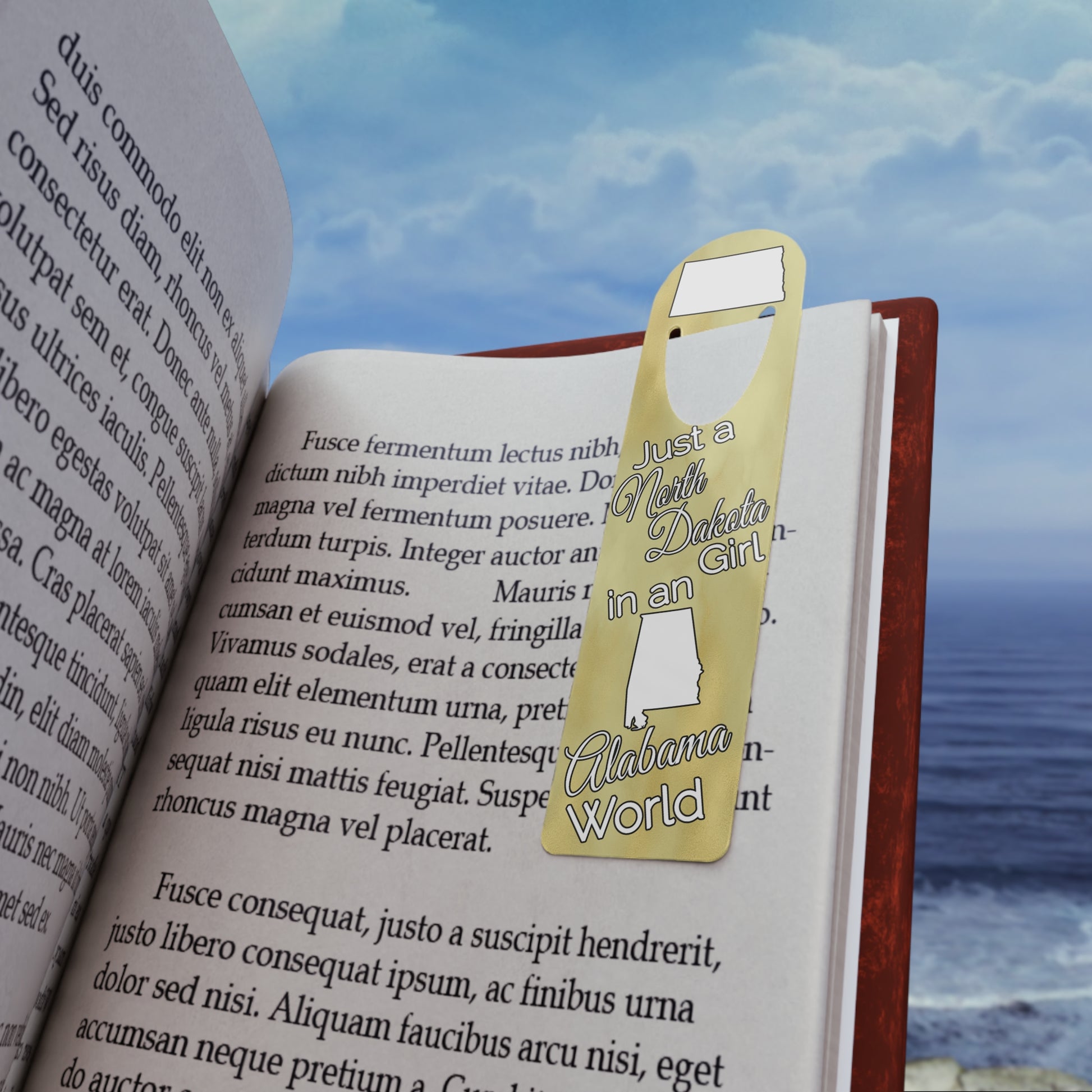 Show your pride in your home state with this bookmark showing Just a North Dakota Girl in an Alabama World. Made with robust aluminum, features top slot that holds single pages in place.