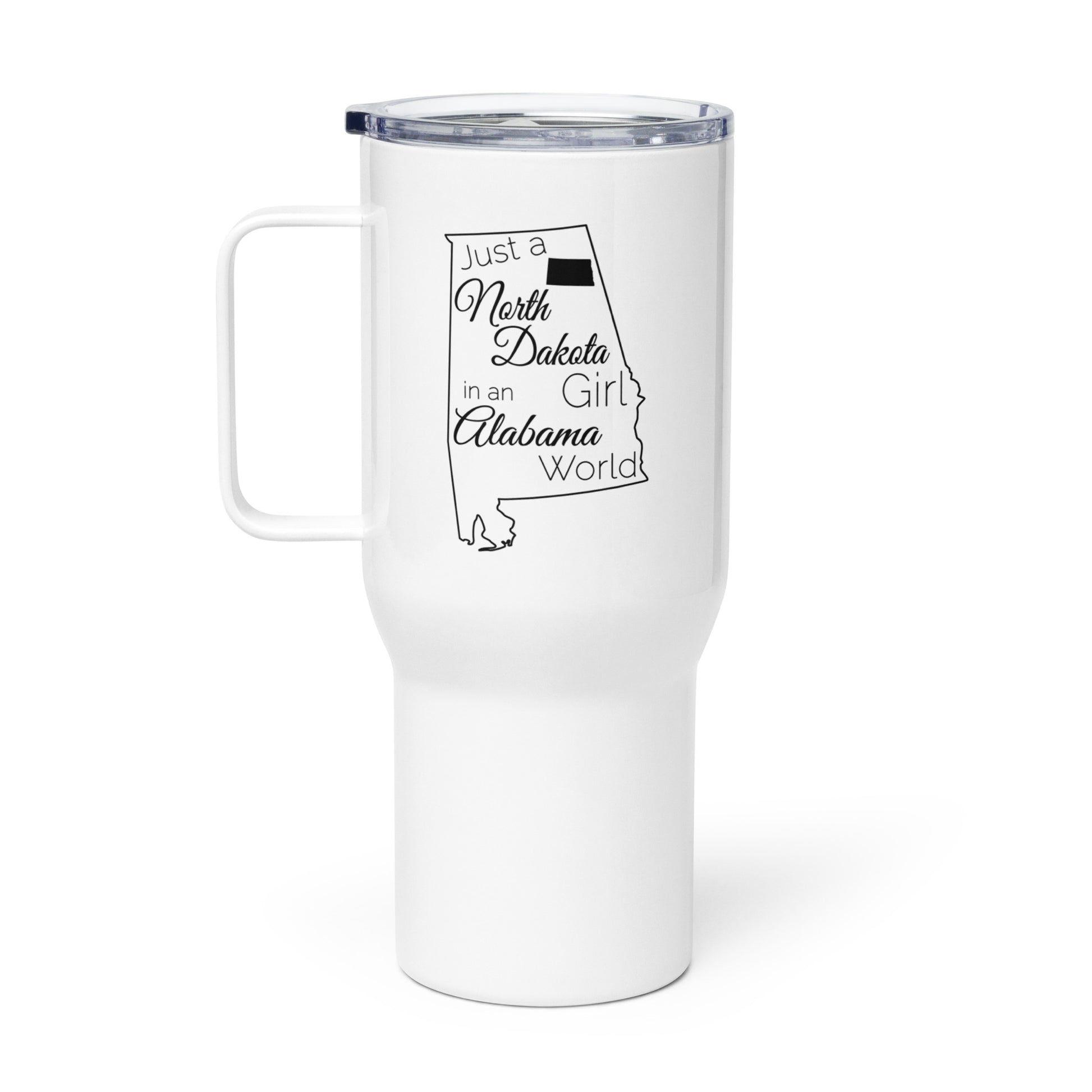 Just a North Dakota Girl in an Alabama World Travel mug with a handle