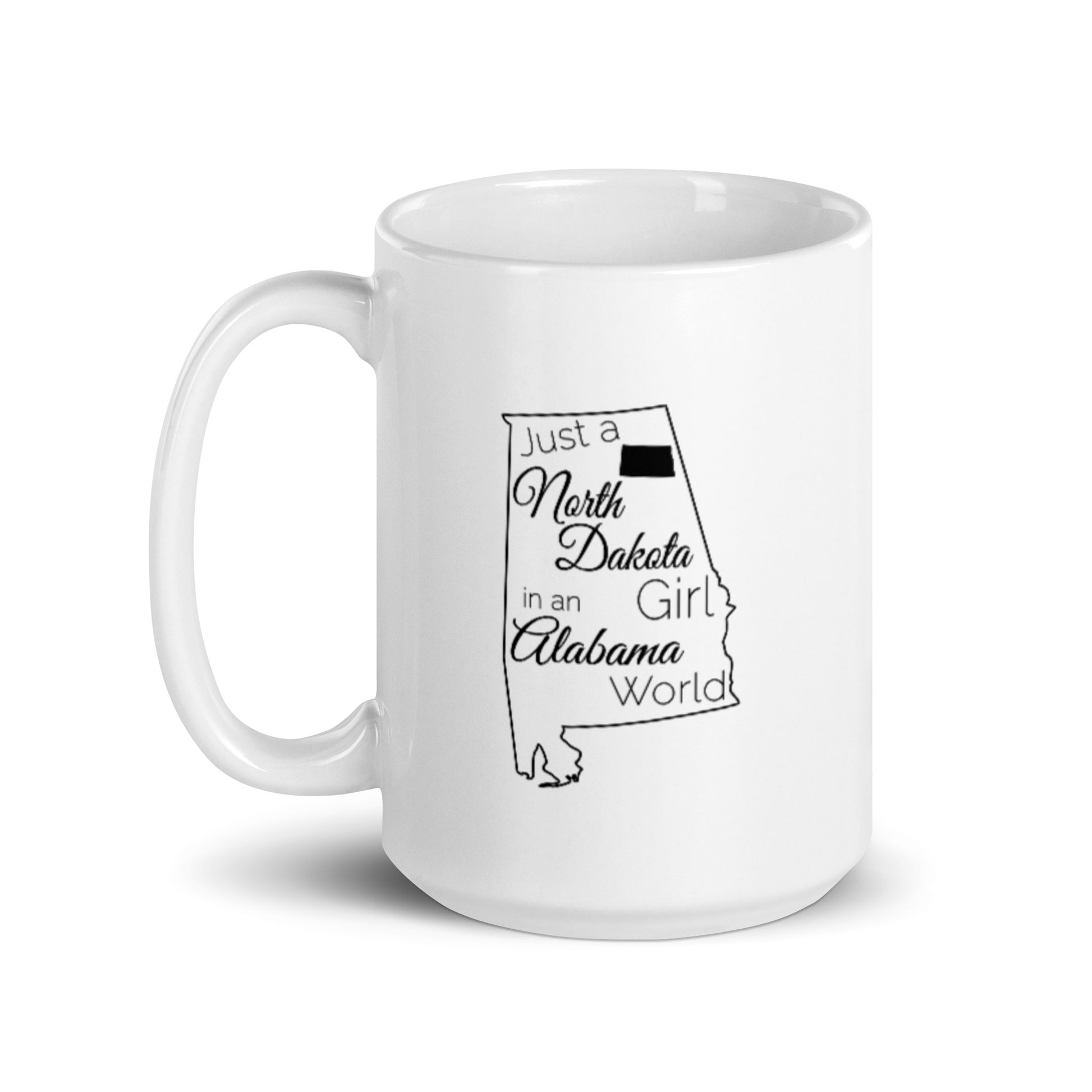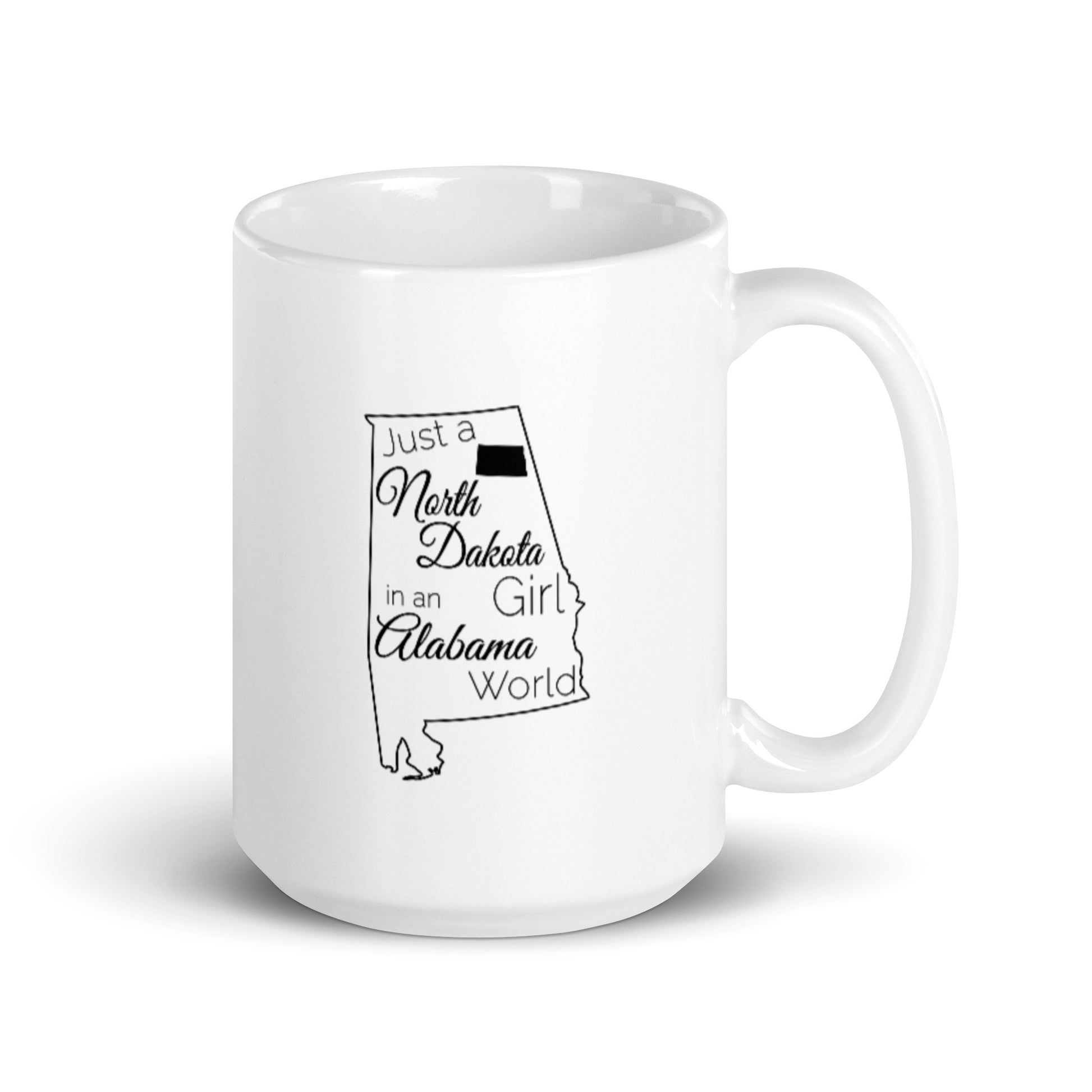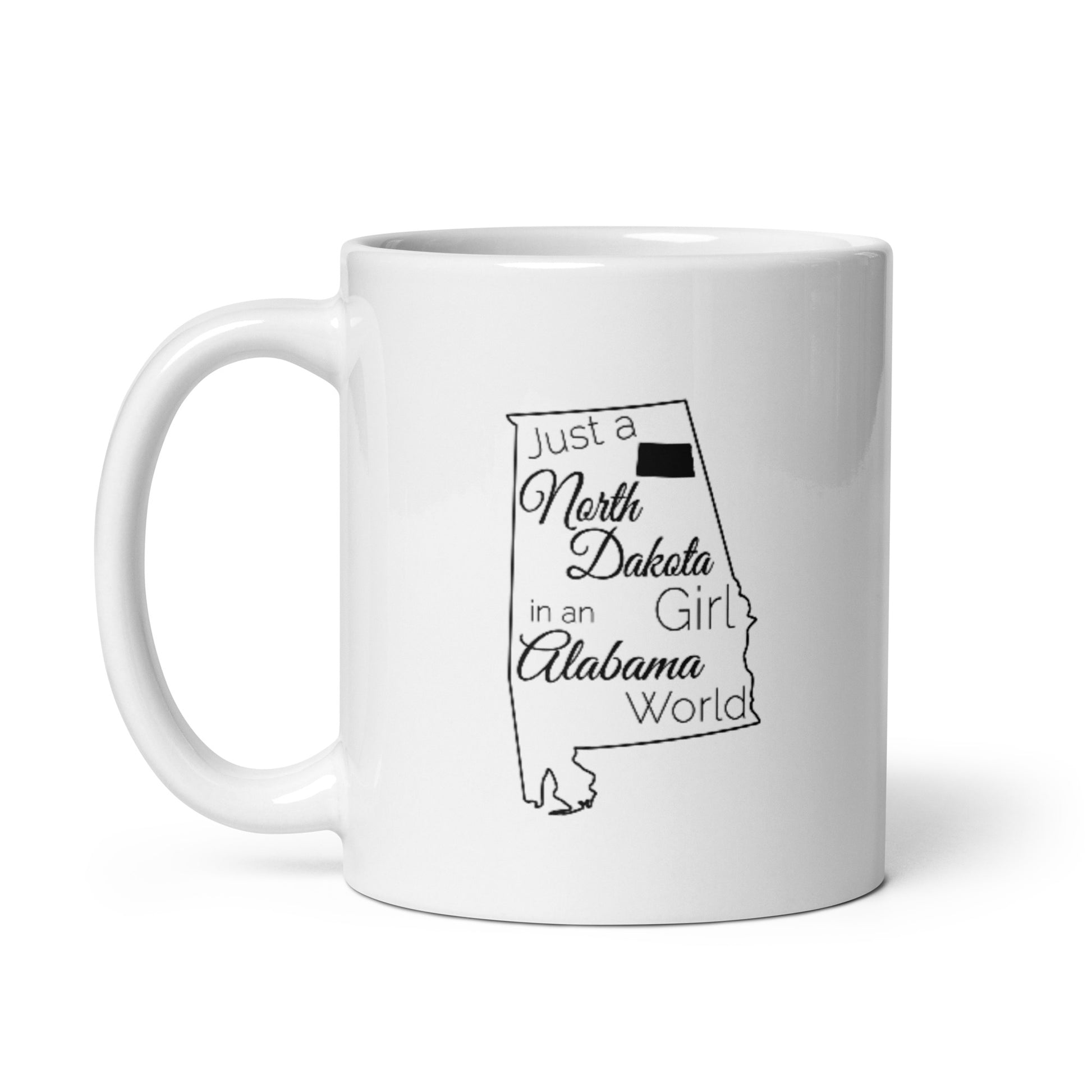 Just a North Dakota Girl in an Alabama World White glossy mug