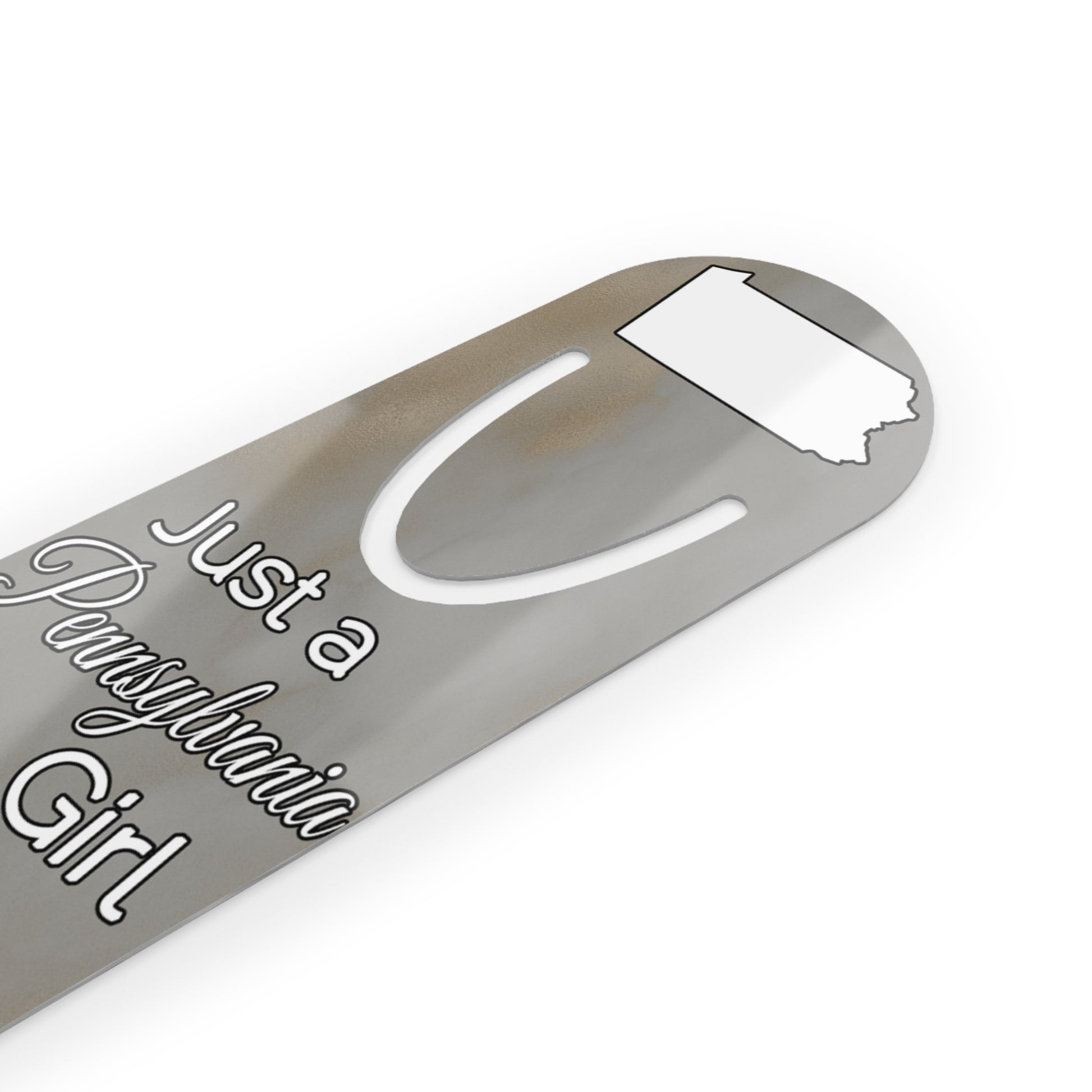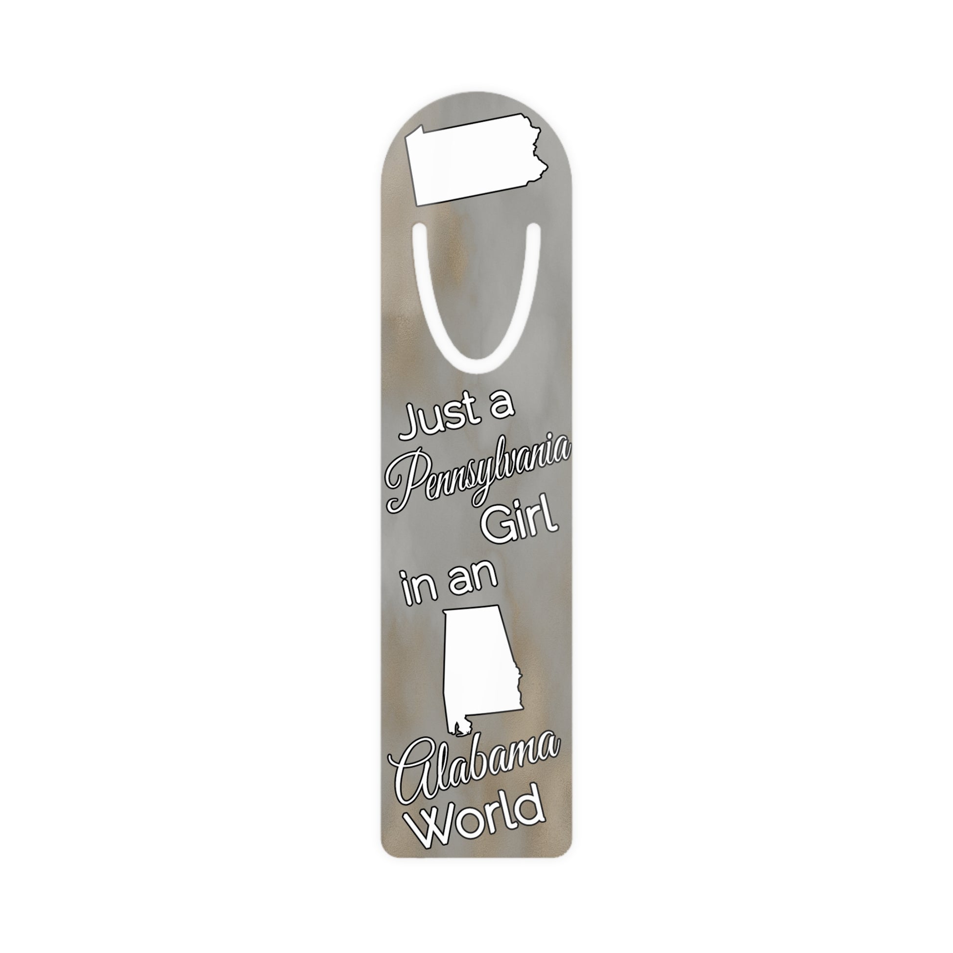 Show your pride in your home state with this bookmark showing Just a Pennsylvania Girl in an Alabama World.  Made with robust aluminum, features top slot that holds single pages in place.