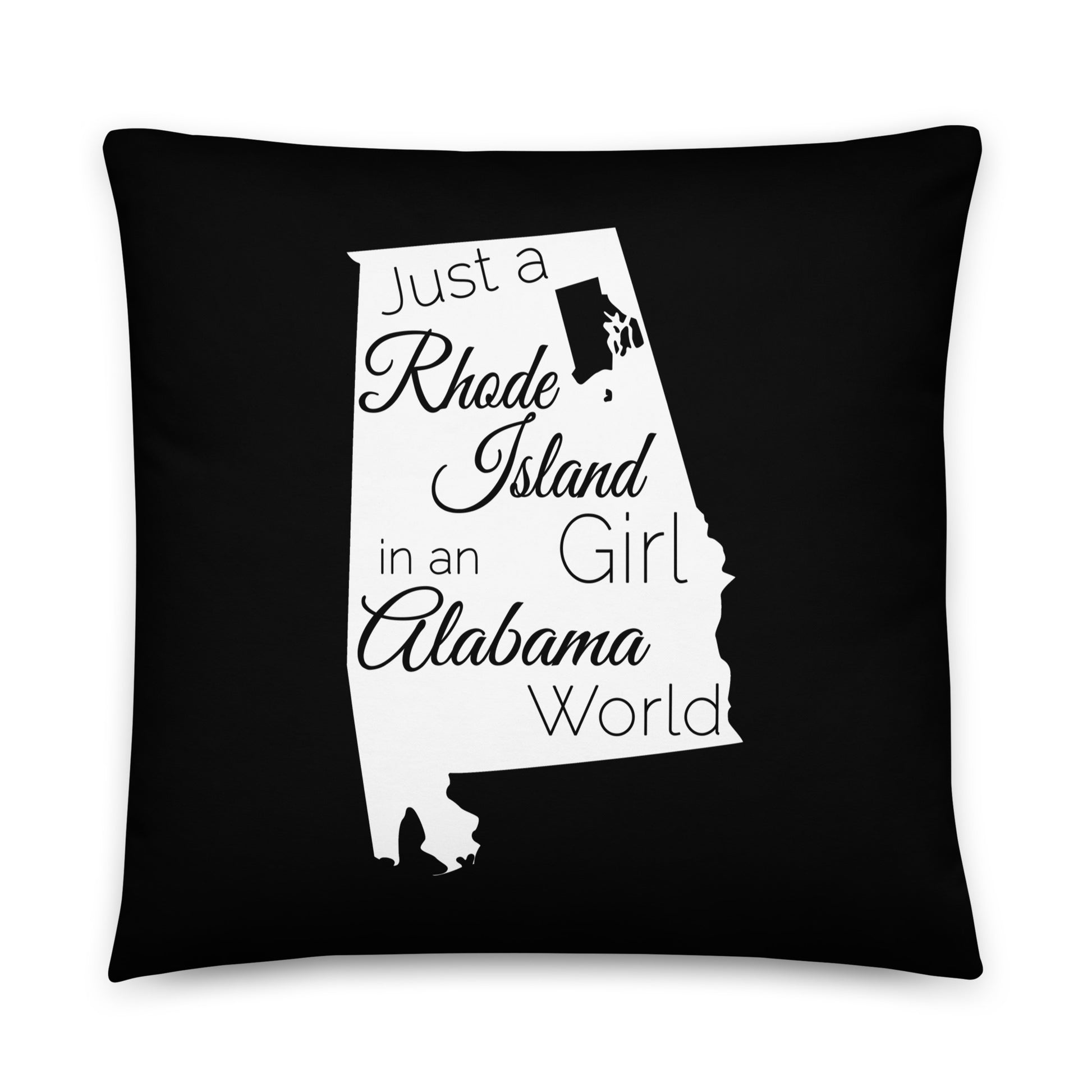 Show your pride in your home state with this throw pillow showing Just a Rhode Island Girl in an Alabama World. A strategically placed accent can bring the whole room to life, and this pillow is just what you need to do that. What's more, the soft, machine-washable case with the shape-retaining insert is a joy to have long afternoon naps on.