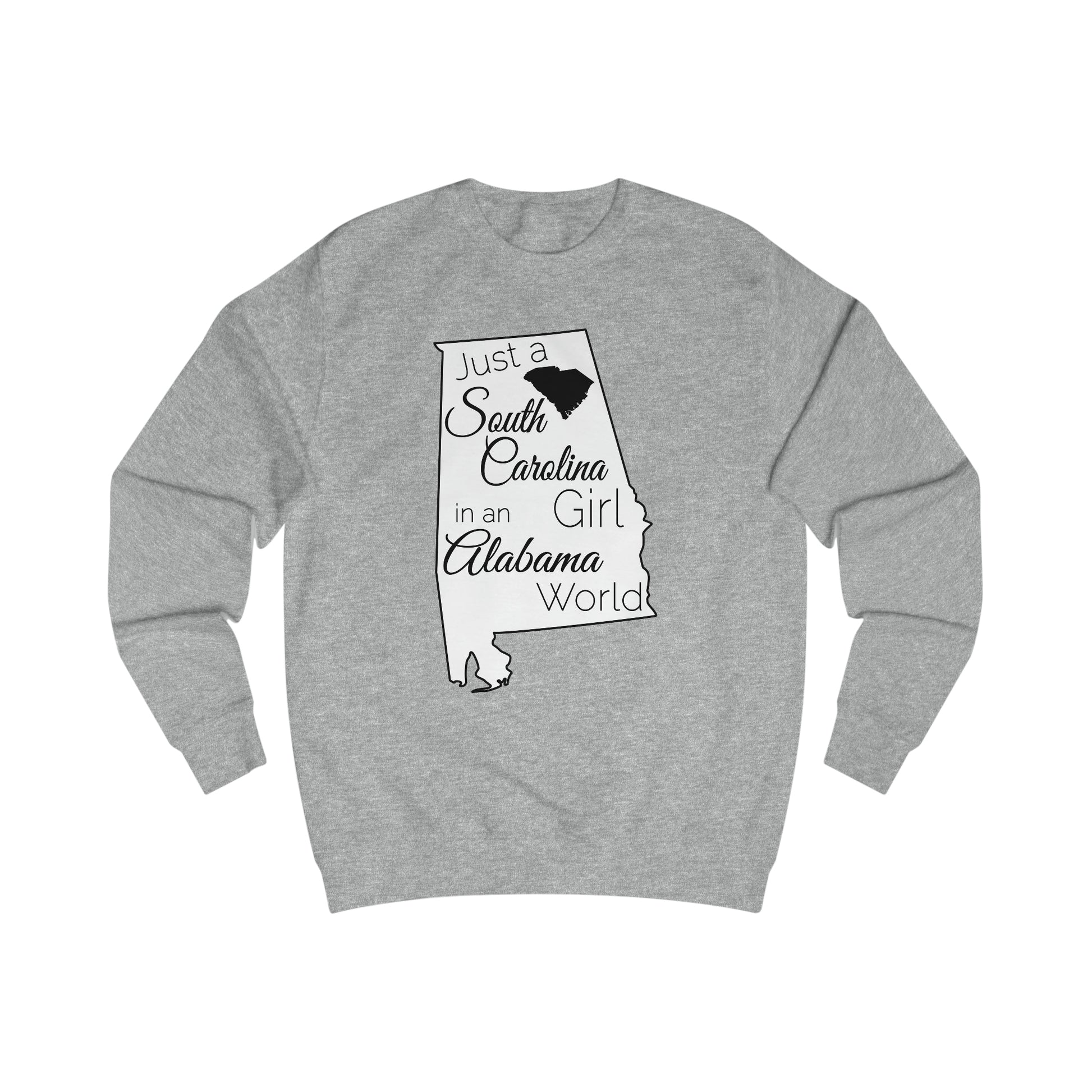 Show your pride in your home state with this sweatshirt showing Just a South Carolina Girl in an Alabama World. The soft cotton sweatshirt is a seamless blend of comfort and style. The fiber is a blend of cotton and polyester. This combination makes for a prime printing surface. The seams have ribbed knitting. Durability is further assured by the inclusion of neck tape backing. As such, the collars are elastic and stretchy.