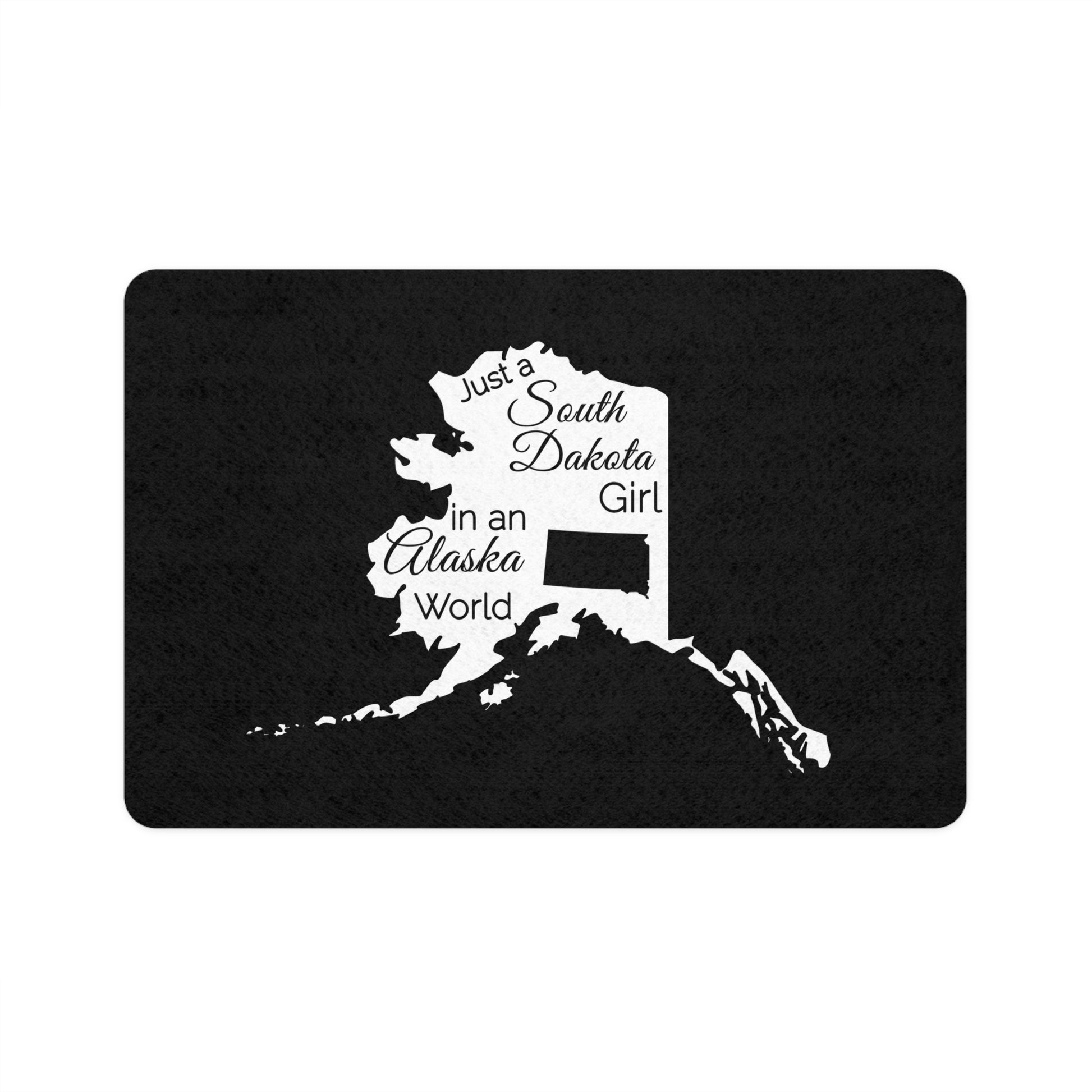 Show your pride in your home state with this pet food mat showing Just a South Dakota Girl in an Alaska World. Created for minimizing mess, this pet food mat is as practical as it is stylish. Made with a non-slip rubber base, this pet feeding mat stays put even when the clumsiest puppers are having their meal. Each mat comes in a rectangle shape, is thick, and is perfect for both dogs and cats.