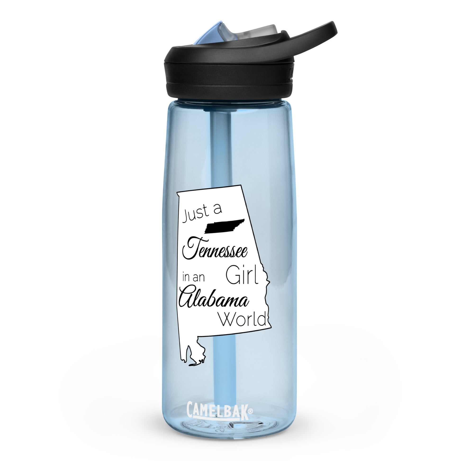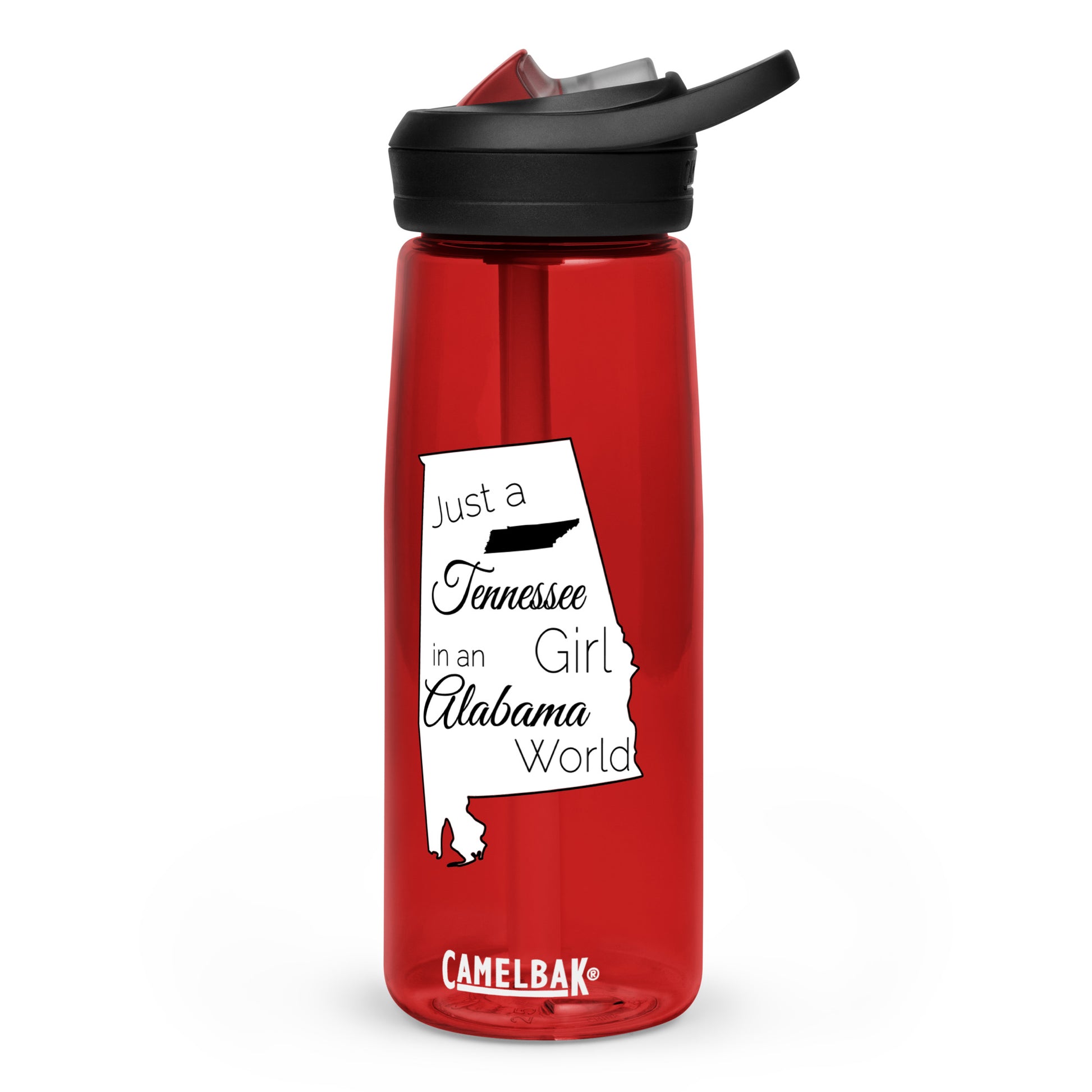 Show your pride in your home state with this water bottle showing Just a Tennessee Girl in an Alabama World. Get a personalized and sports water bottle made from 50% recycled plastic to stay hydrated in style. Resistant to stains, shattering, and odors, it keeps your drinks fresh, and the spill-proof lid and bite valve prevent leaks. This bottle’s extra large size is also suitable for any long gym, work, or study sessions!
