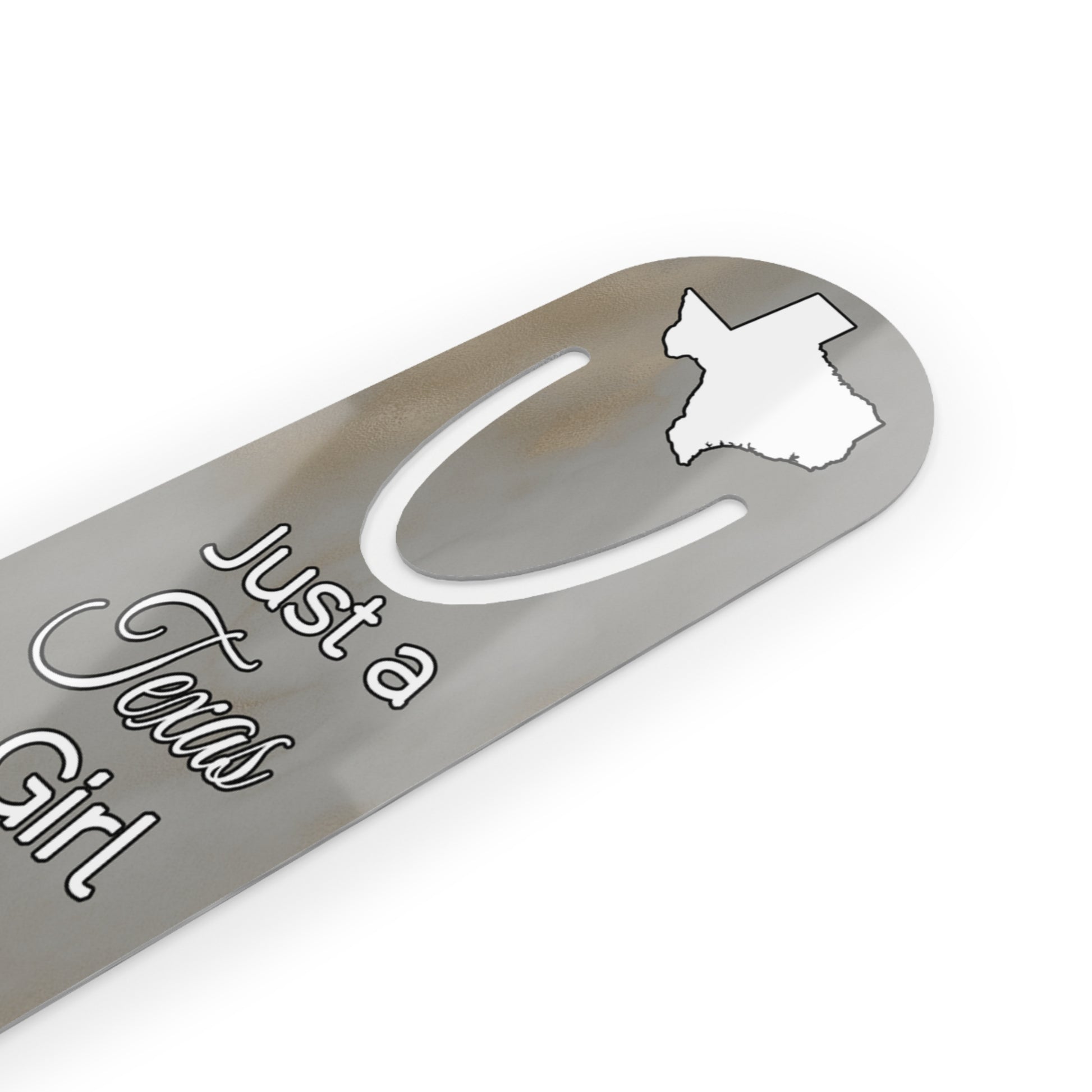 Show your pride in your home state with this bookmark showing Just a Texas Girl in an Alabama World.  Made with robust aluminum, features top slot that holds single pages in place.
