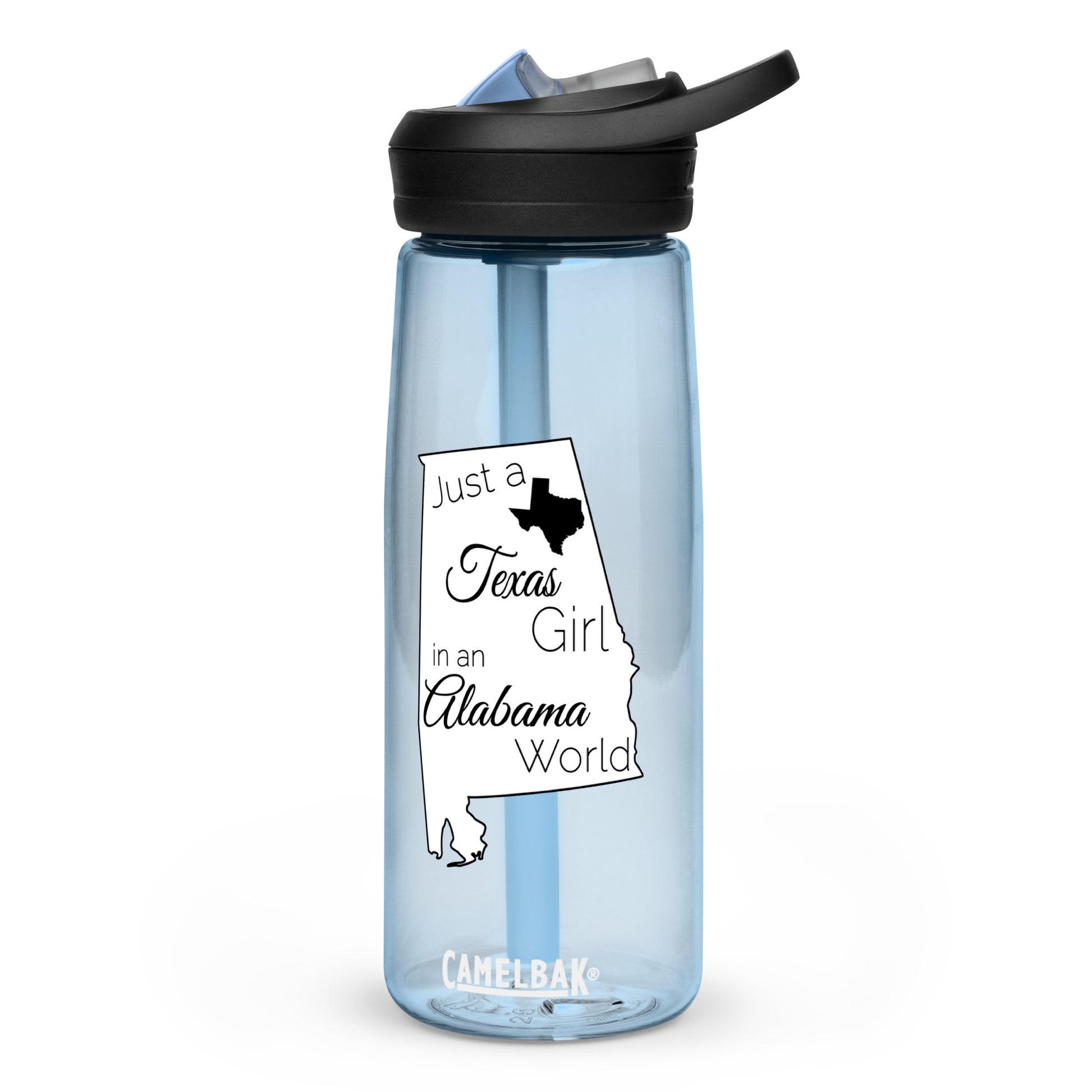 Show your pride in your home state with this water bottle showing Just a Texas Girl in an Alabama World. Get a personalized and sports water bottle made from 50% recycled plastic to stay hydrated in style. Resistant to stains, shattering, and odors, it keeps your drinks fresh, and the spill-proof lid and bite valve prevent leaks. This bottle’s extra large size is also suitable for any long gym, work, or study sessions!