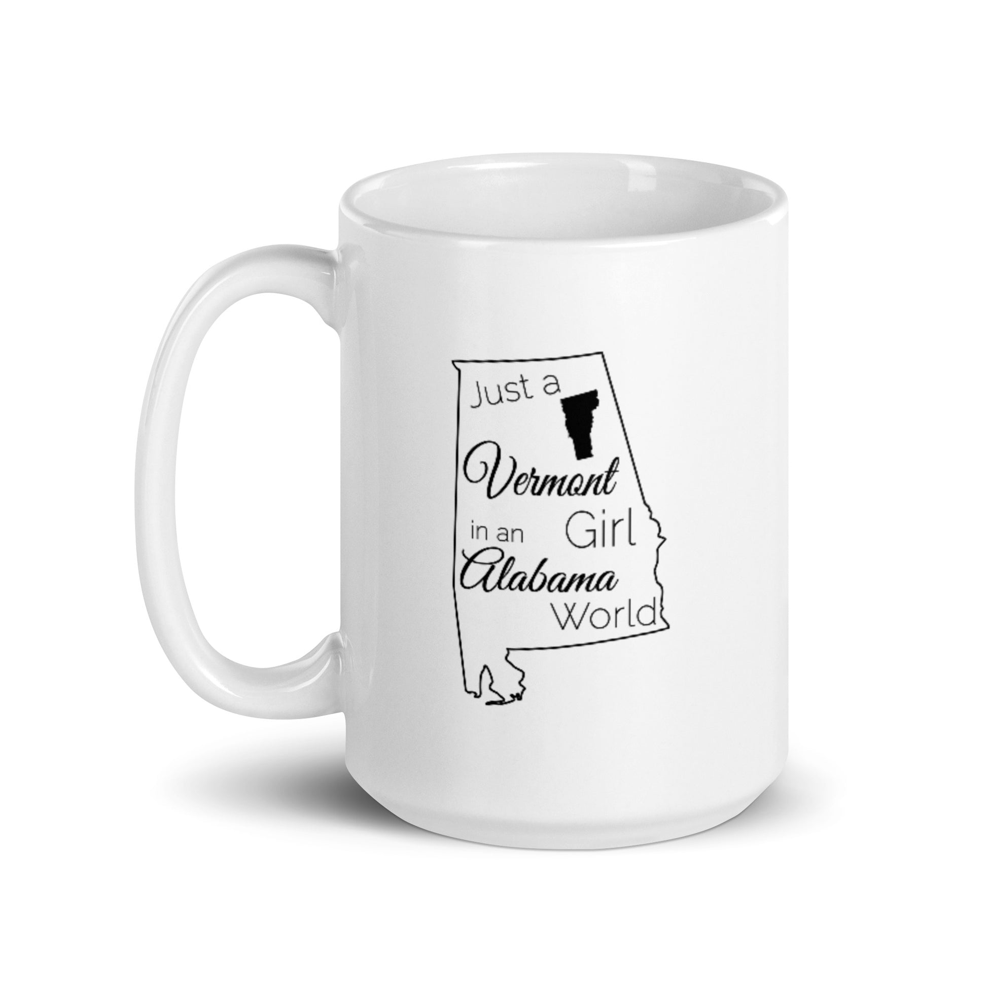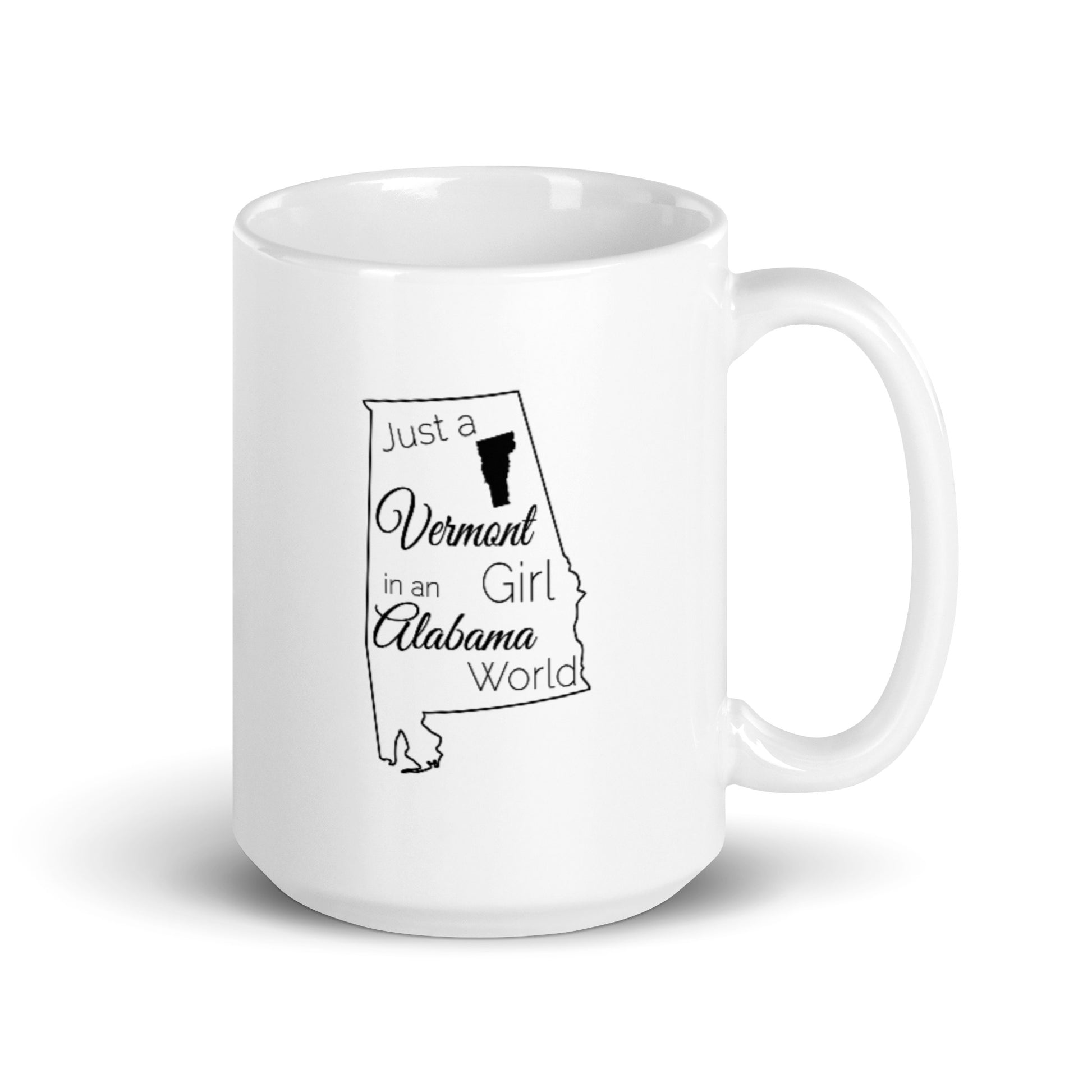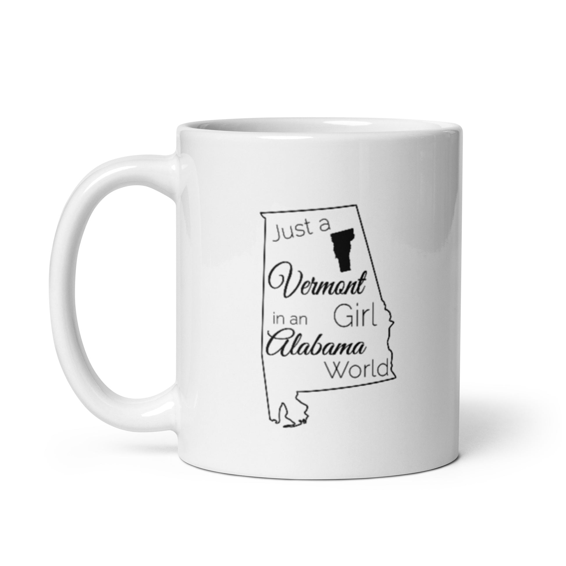 Just a Vermont Girl in an Alabama World White glossy mug