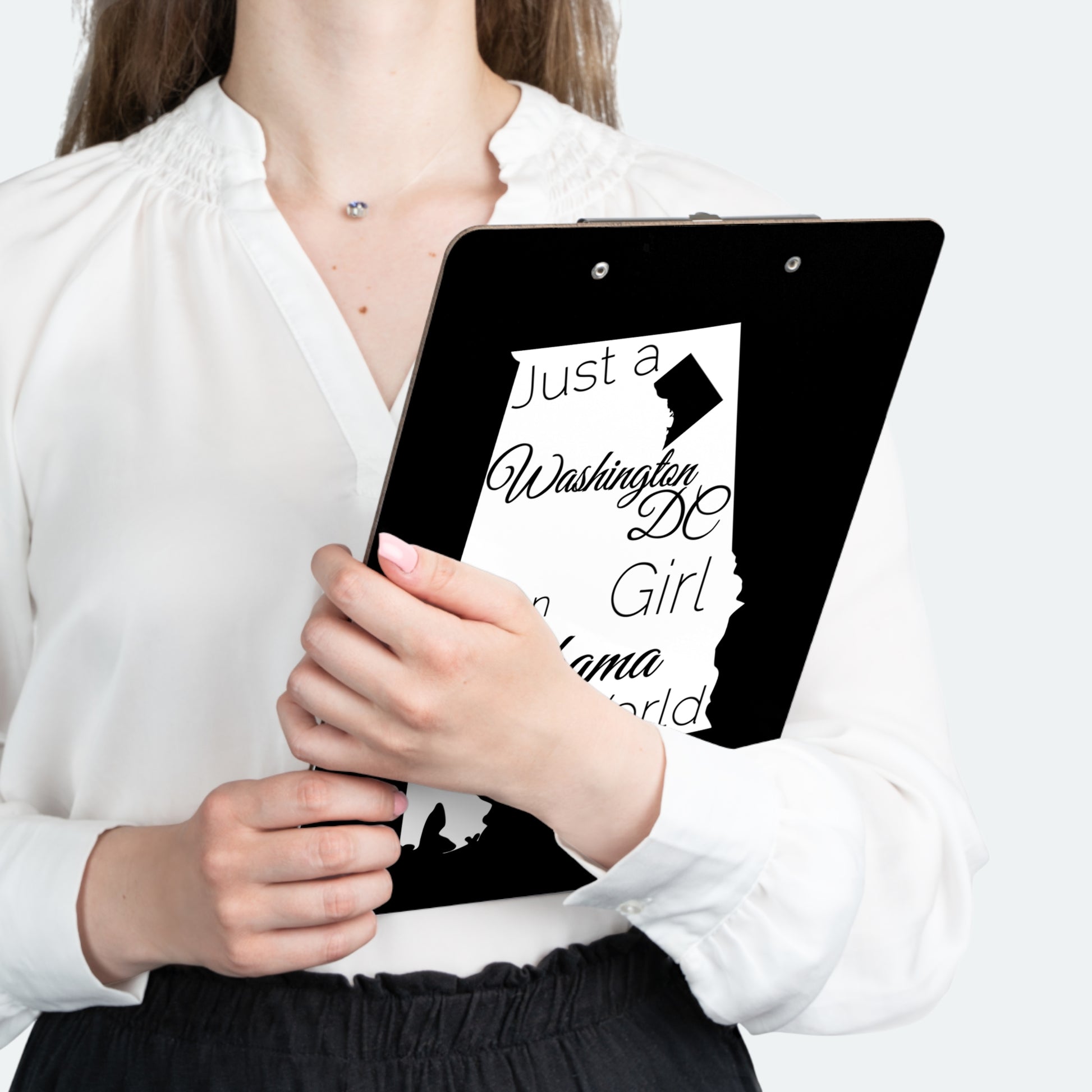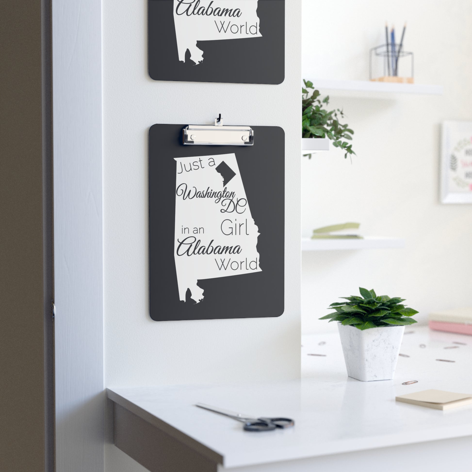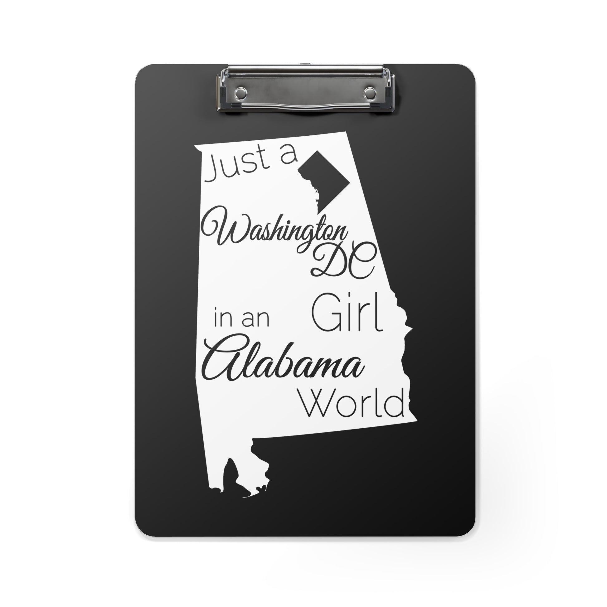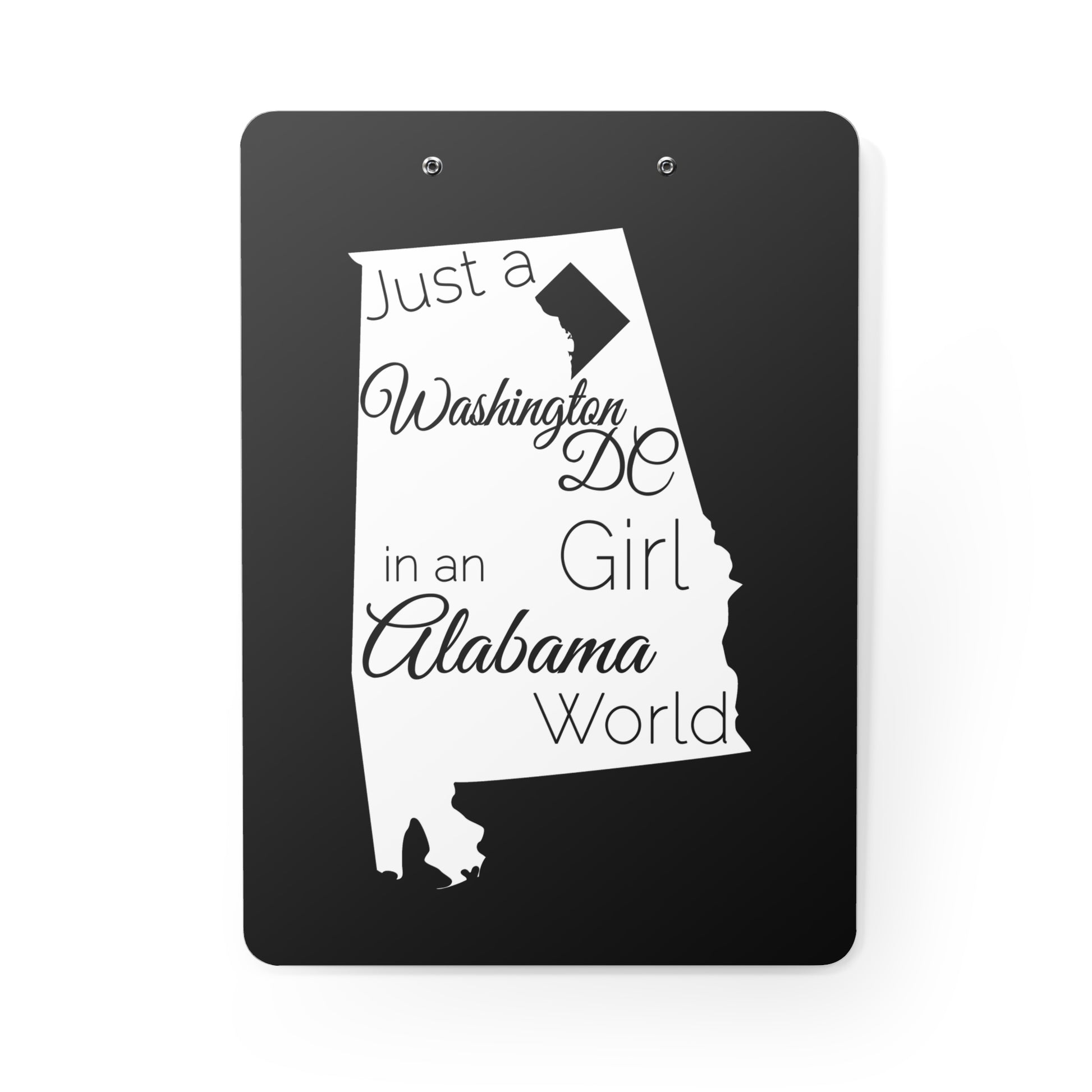 Show your pride in your home state with this clipboard showing Just a Washington DC Girl in an Alabama World. Clipboards are an office staple.