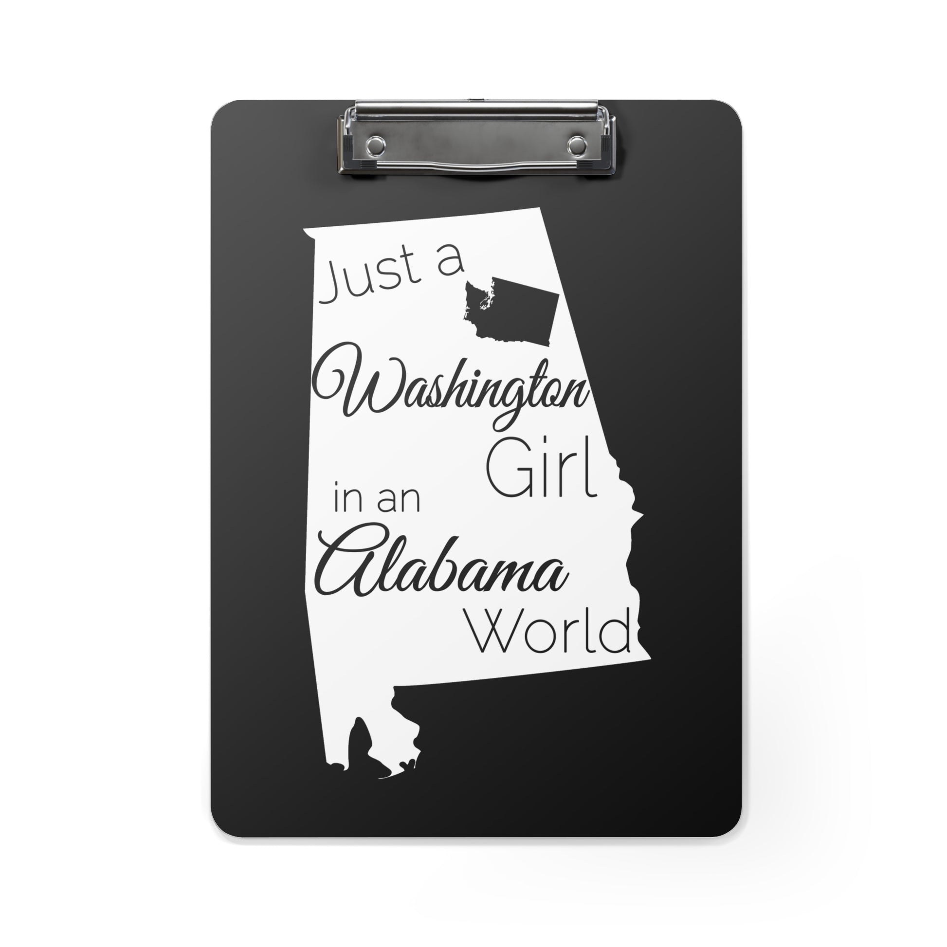 Show your pride in your home state with this clipboard showing Just a Washington Girl in an Alabama World. Clipboards are an office staple.