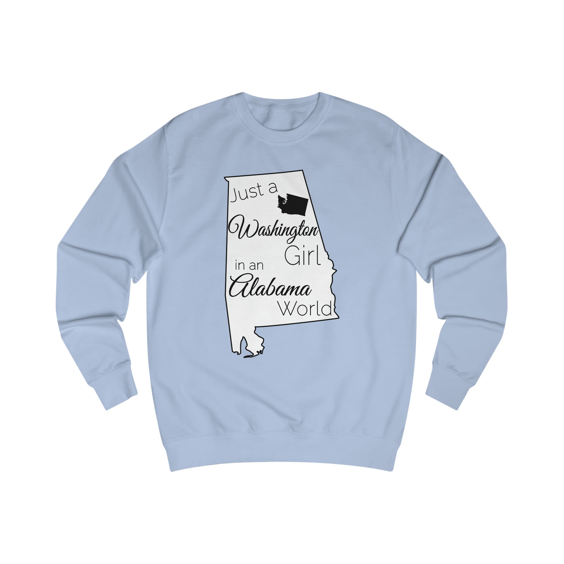 Show your pride in your home state with this sweatshirt showing Just a Washington Girl in an Alabama World. The soft cotton sweatshirt is a seamless blend of comfort and style. The fiber is a blend of cotton and polyester. This combination makes for a prime printing surface. The seams have ribbed knitting. Durability is further assured by the inclusion of neck tape backing. As such, the collars are elastic and stretchy.