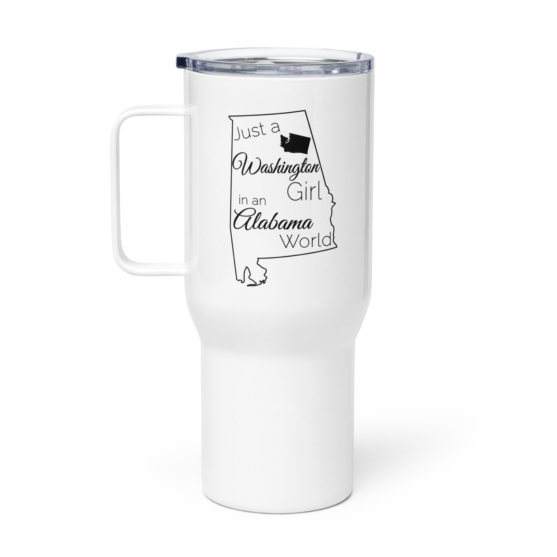 Just a Washington Girl in an Alabama World Travel mug with a handle