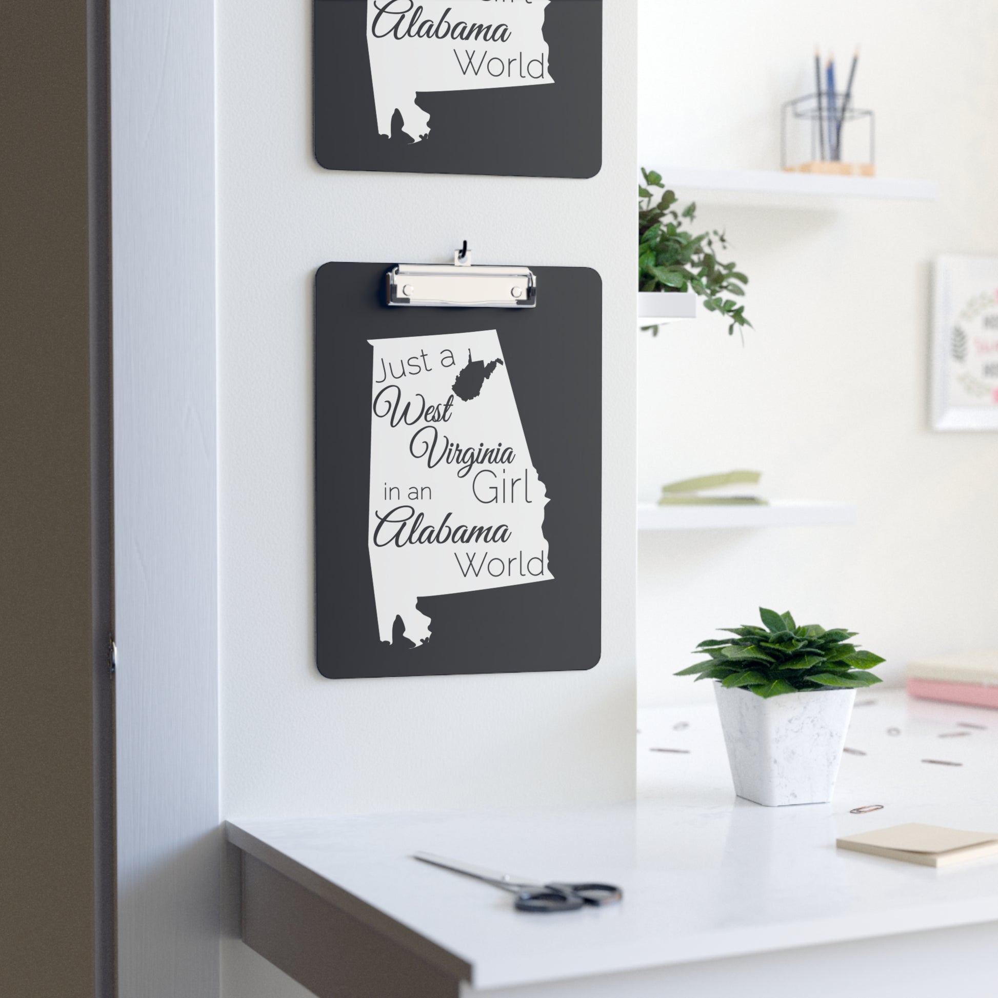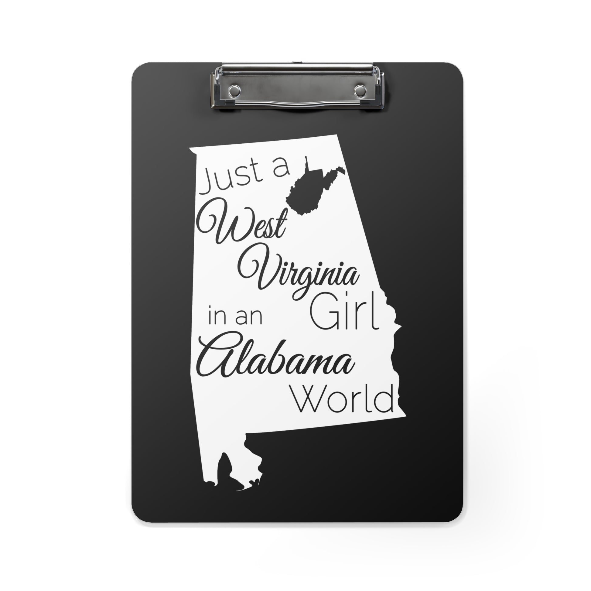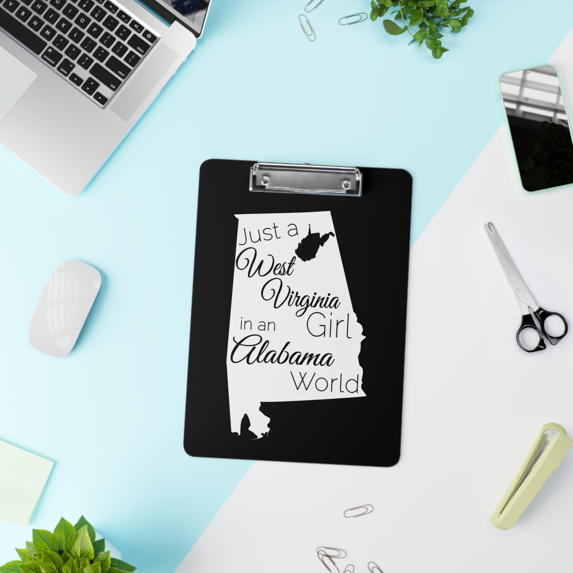 Show your pride in your home state with this clipboard showing Just a West Virginia Girl in an Alabama World. Clipboards are an office staple.