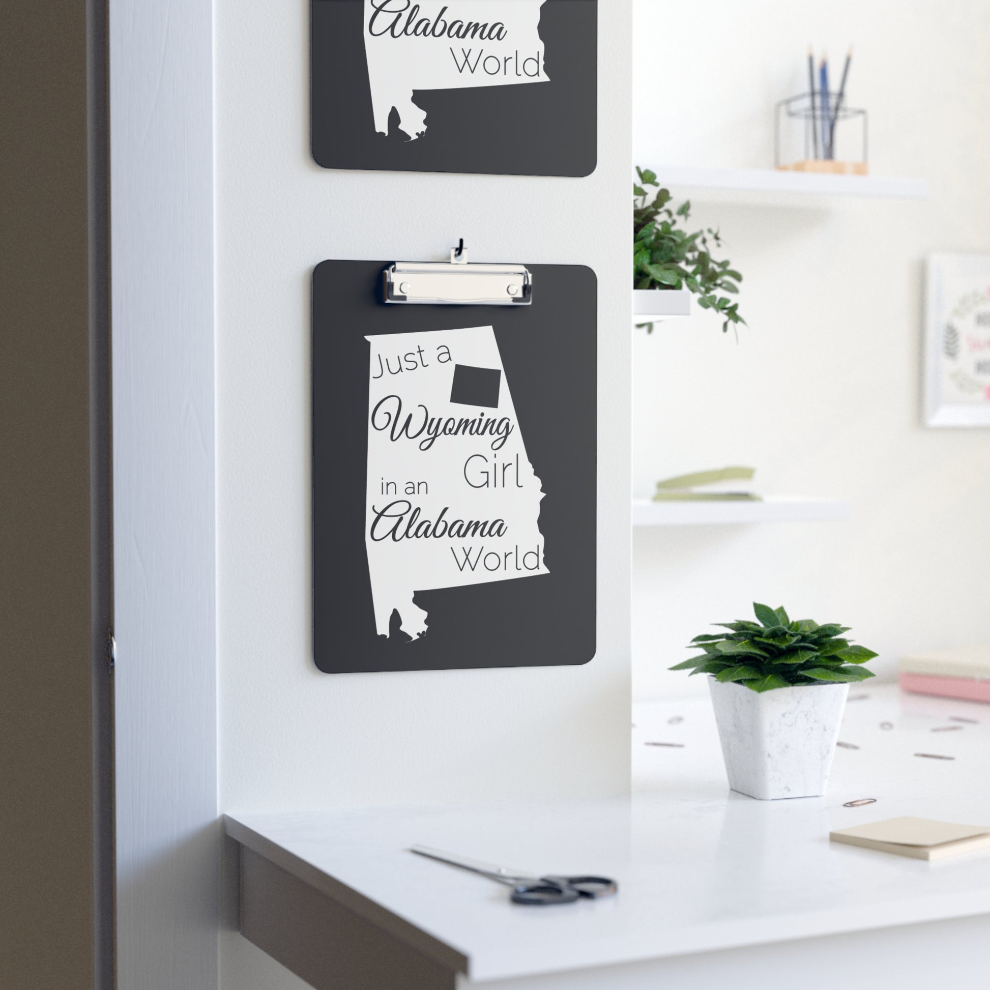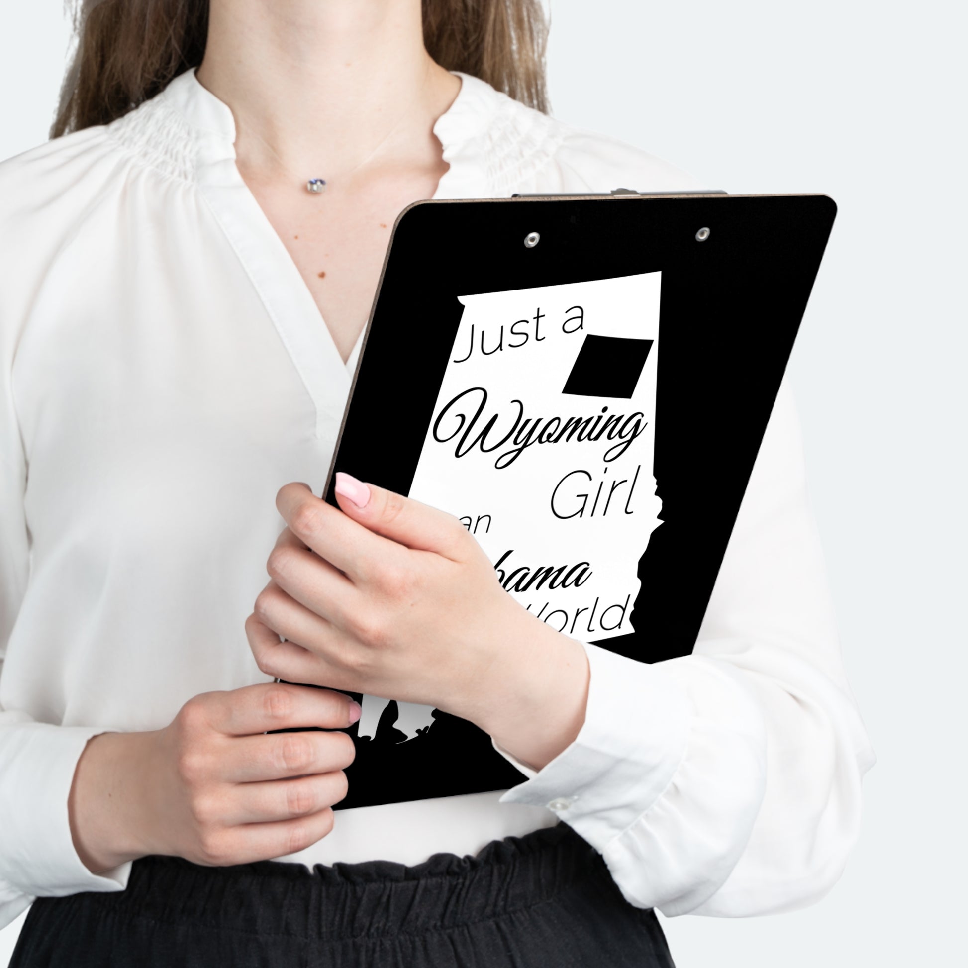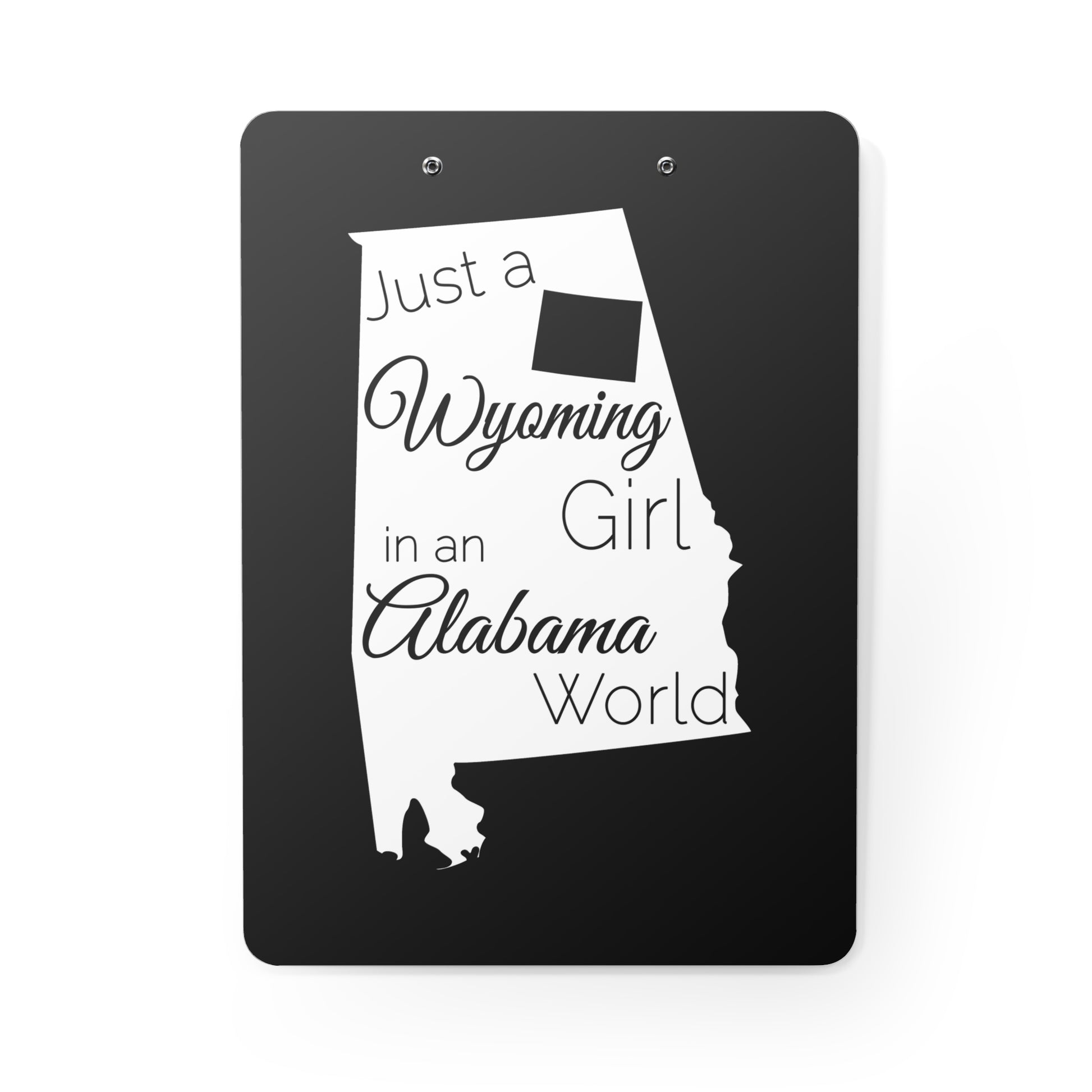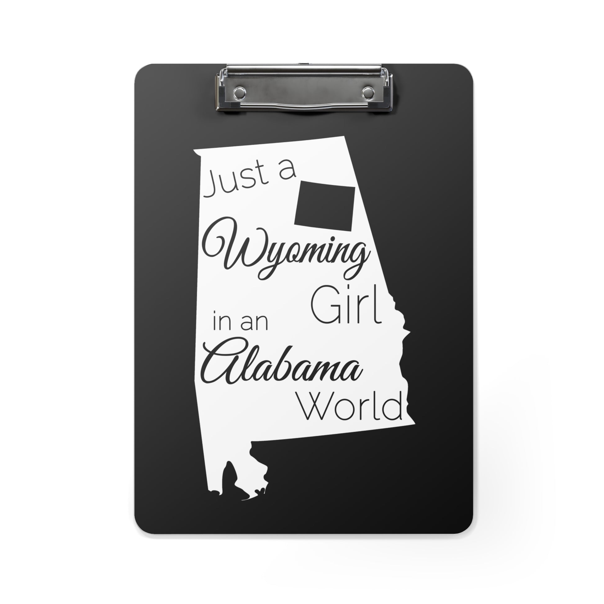 Show your pride in your home state with this clipboard showing Just a Wyoming Girl in an Alabama World. Clipboards are an office staple.