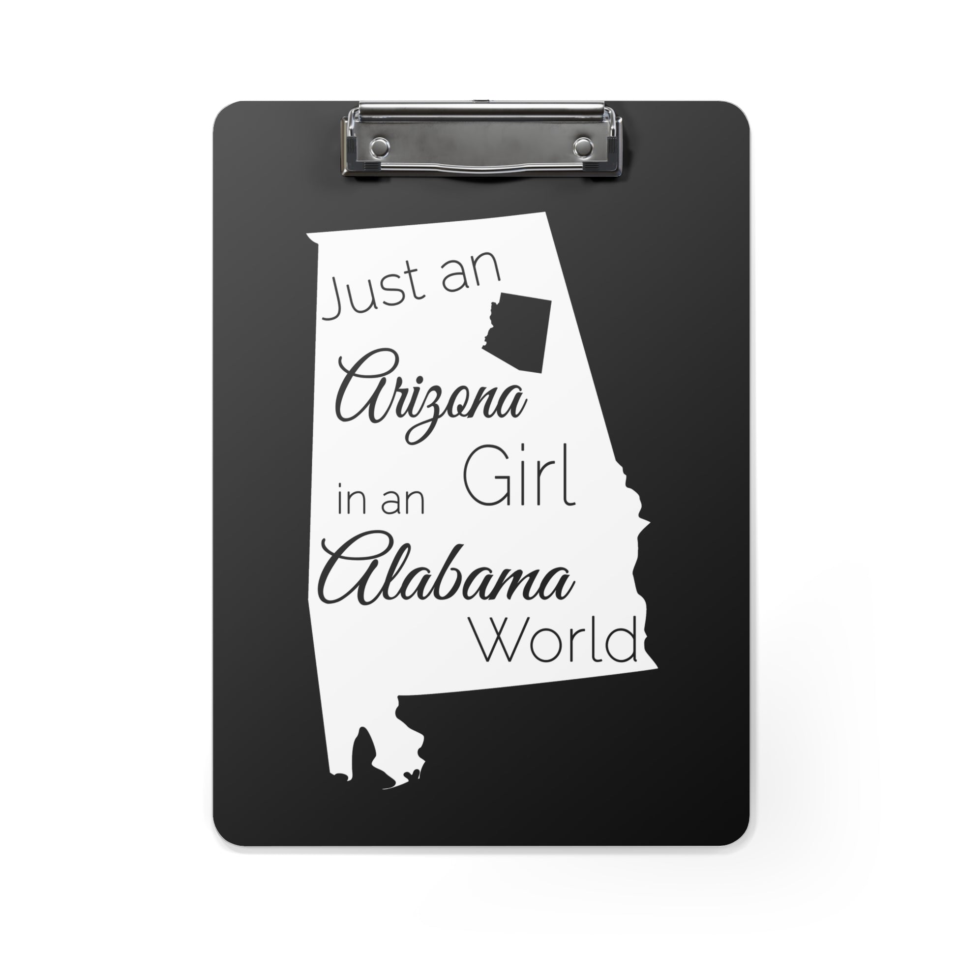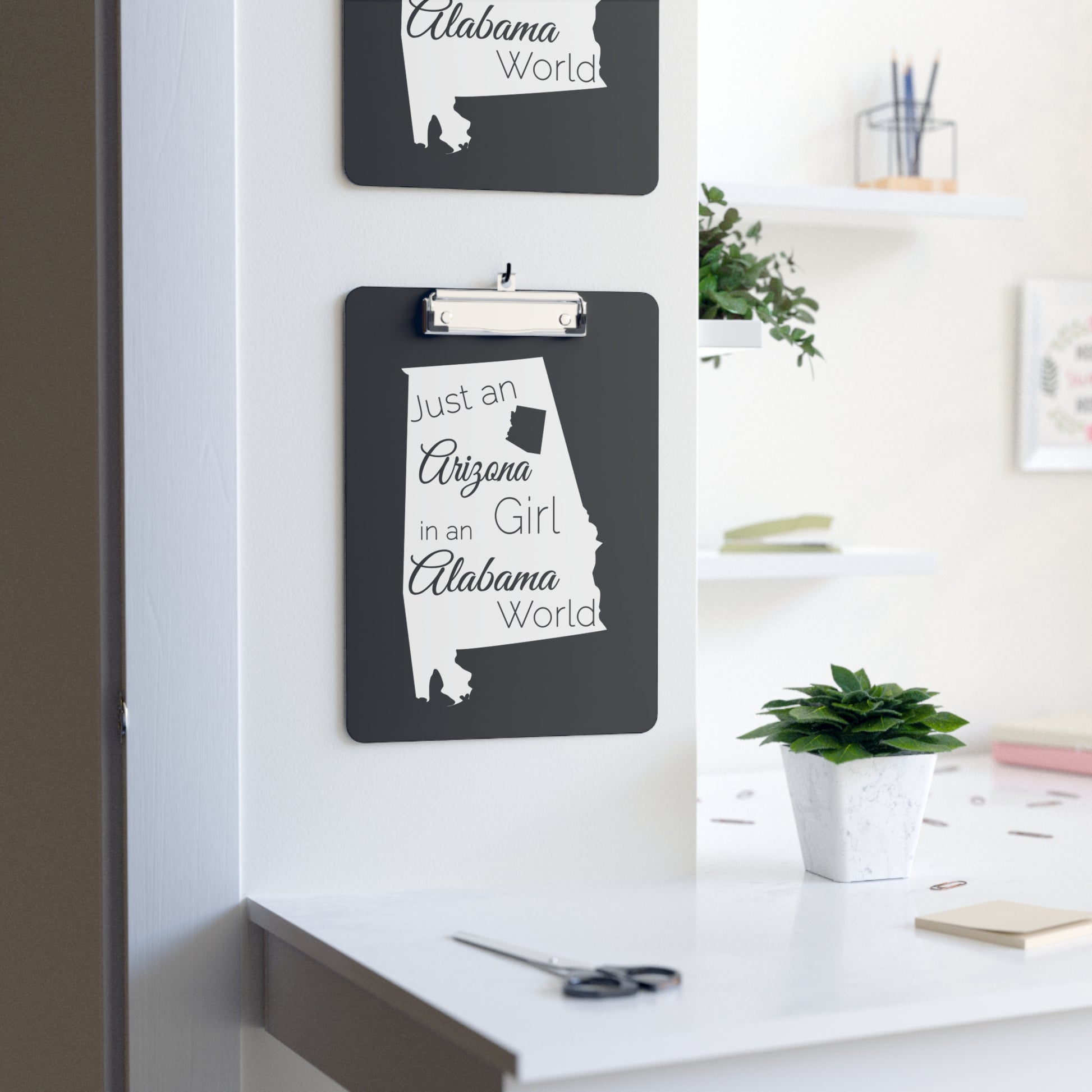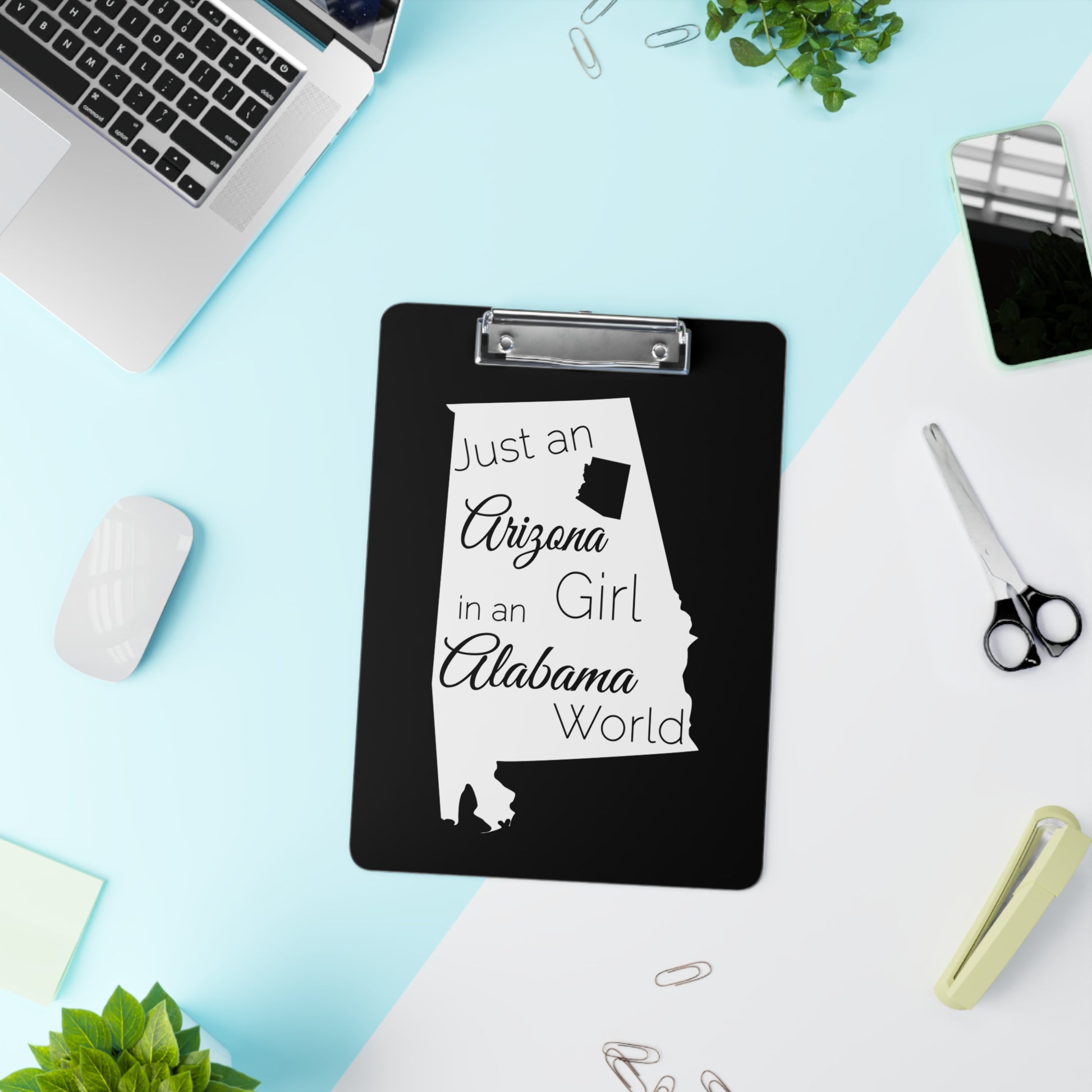 Show your pride in your home state with this clipboard showing Just an Arizona Girl in an Alabama World. Clipboards are an office staple.