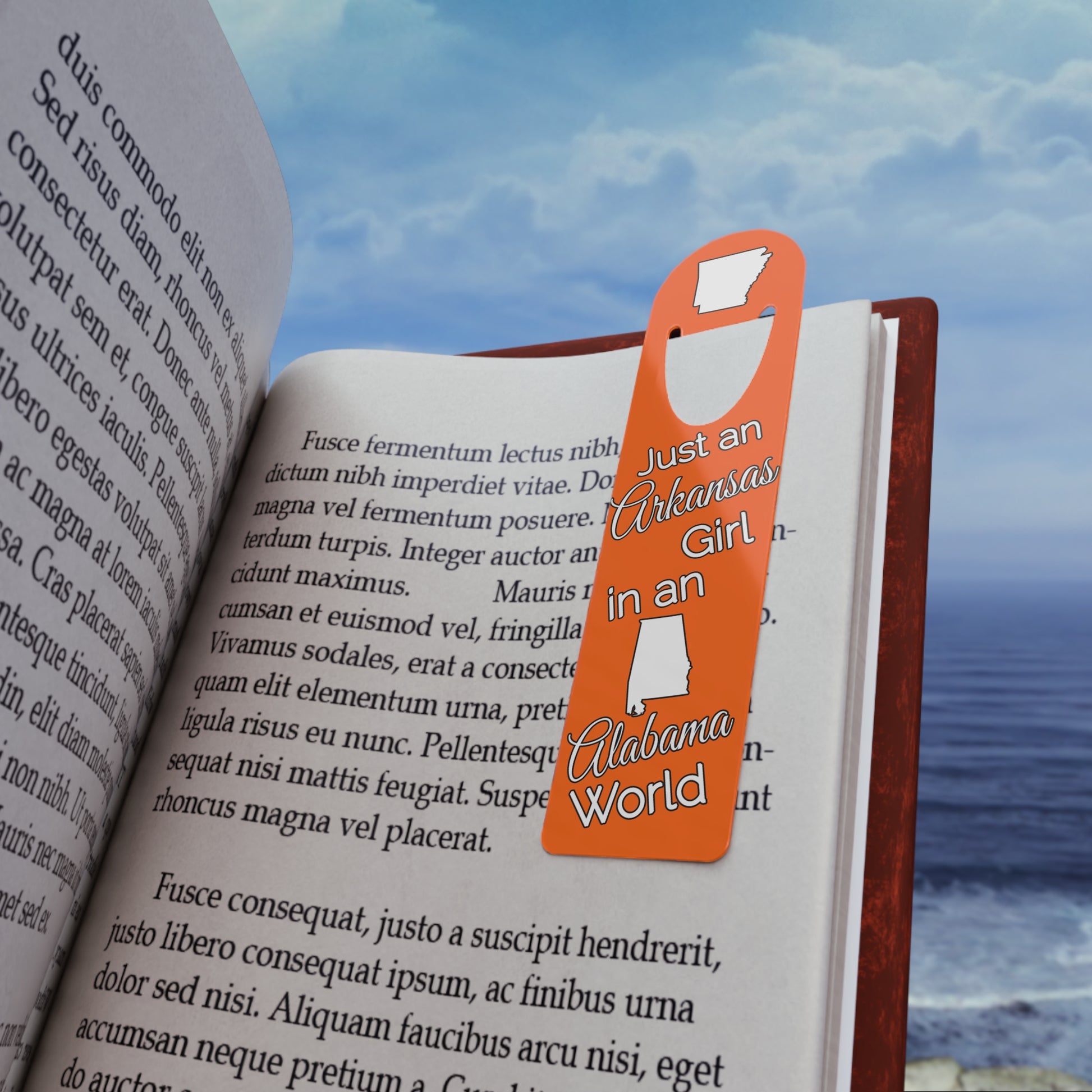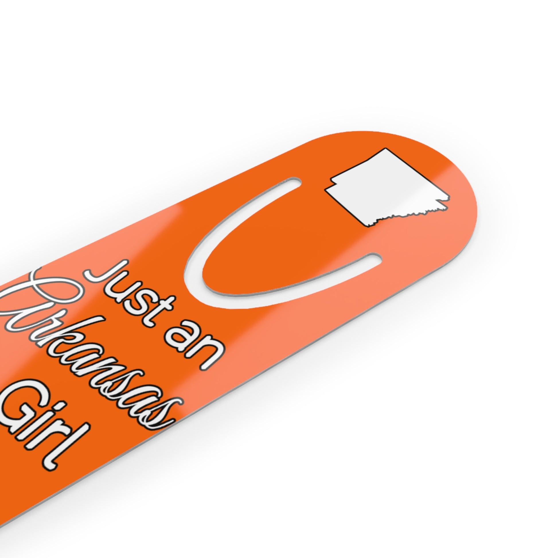 Show your pride in your home state with this bookmark showing Just an Arkansas Girl in an Alabama World. Made with robust aluminum, features top slot that holds single pages in place.