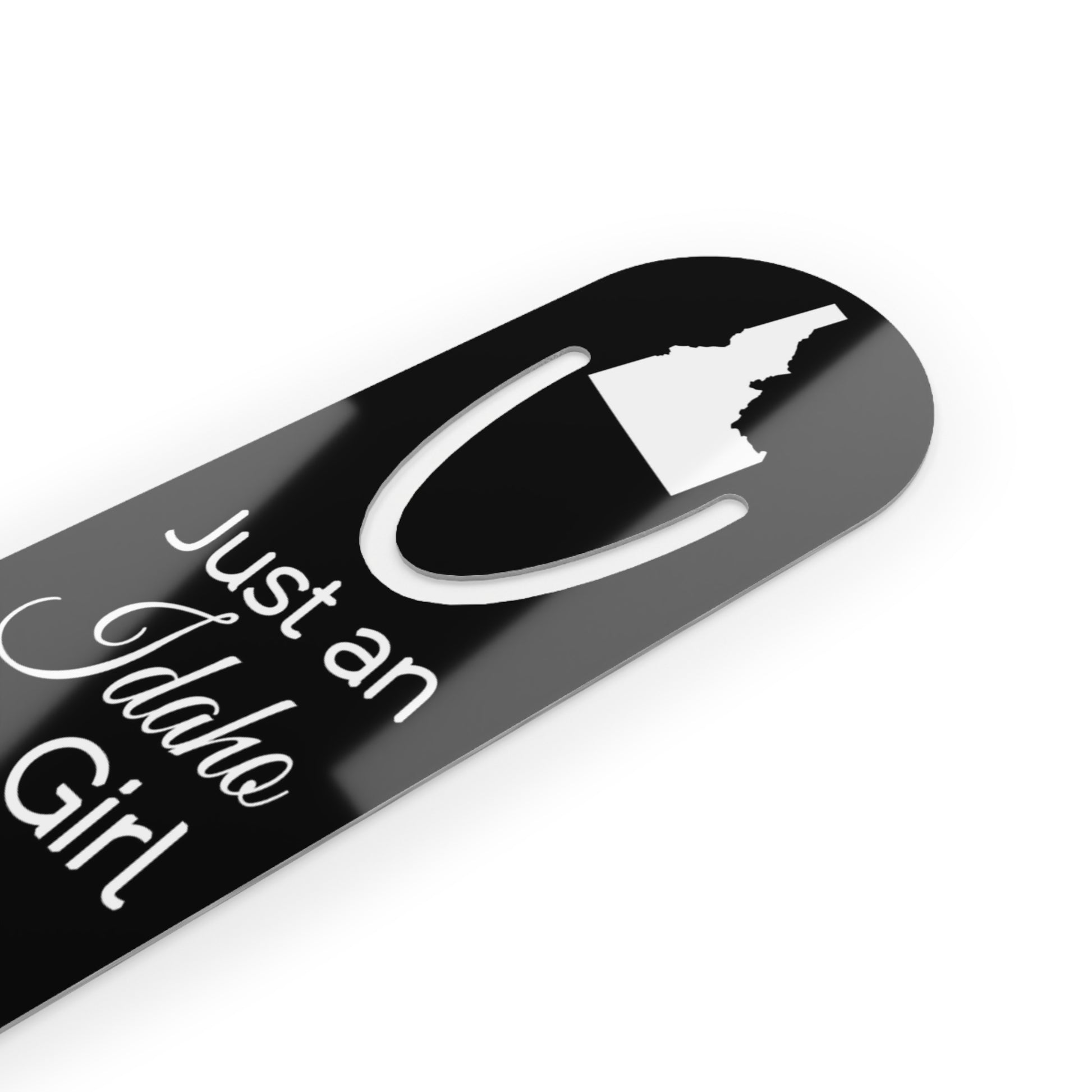 Show your pride in your home state with this bookmark showing Just an Idaho Girl in an Alabama World. Made with robust aluminum, features top slot that holds single pages in place.