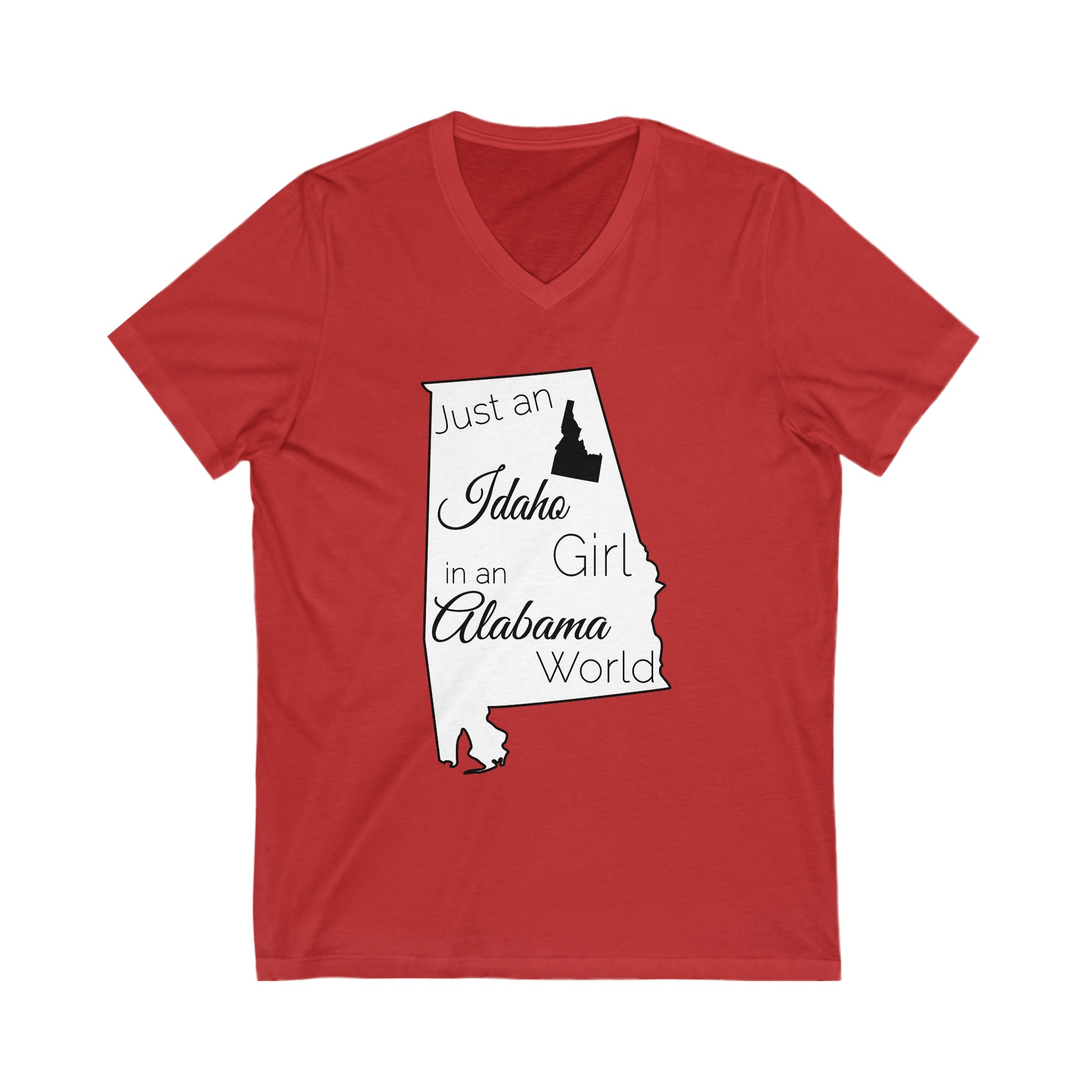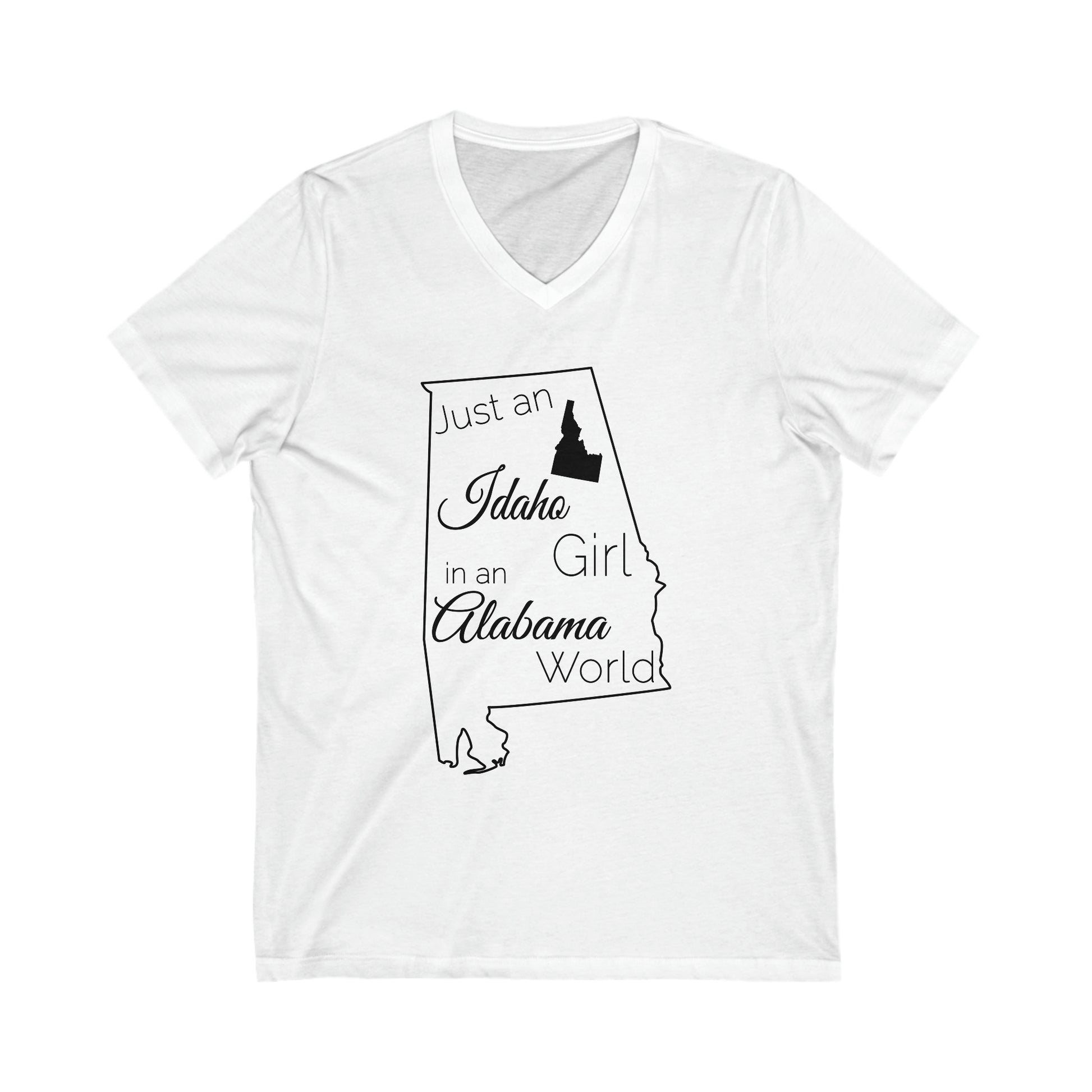 Just an Idaho Girl in an Alabama World Unisex Jersey Short Sleeve V-Neck Tee