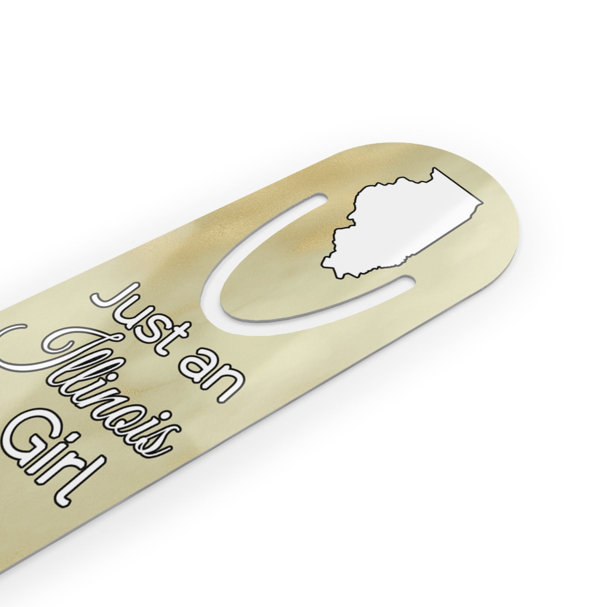 Show your pride in your home state with this bookmark showing Just an Illinois Girl in an Alabama World. Made with robust aluminum, features top slot that holds single pages in place.